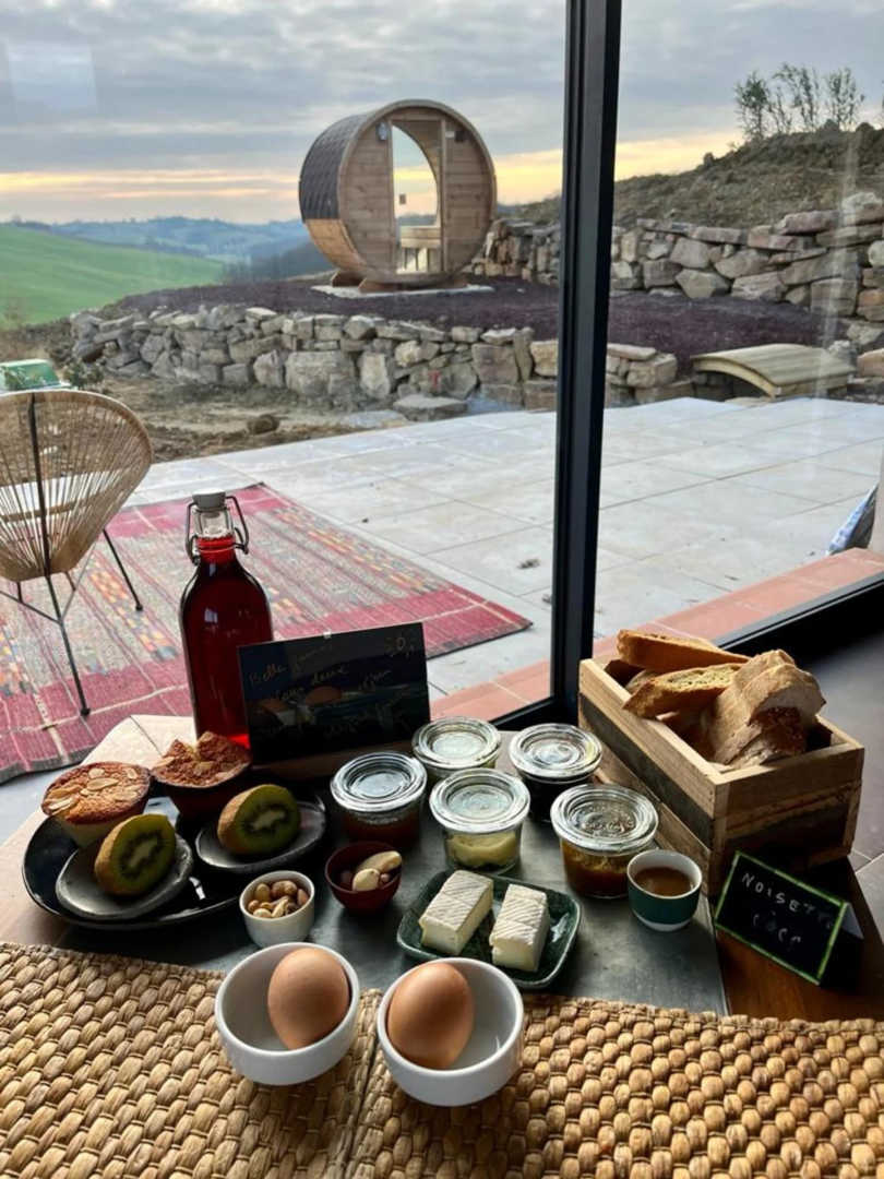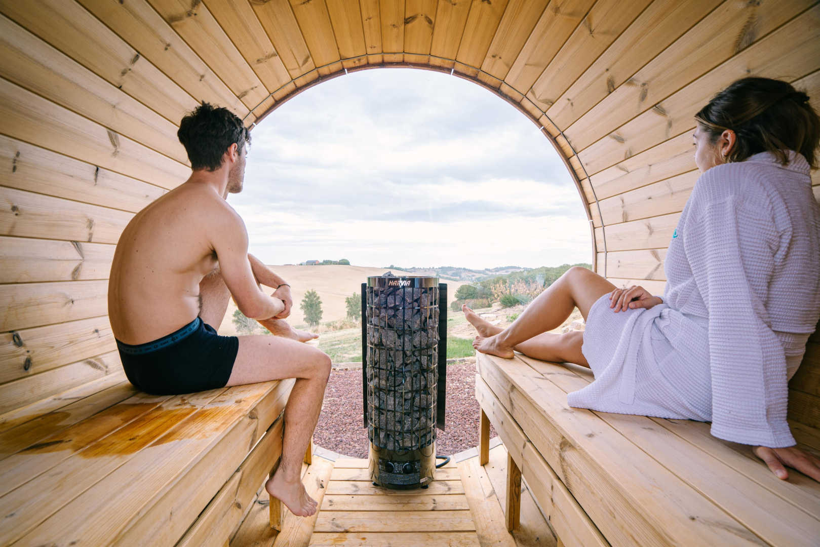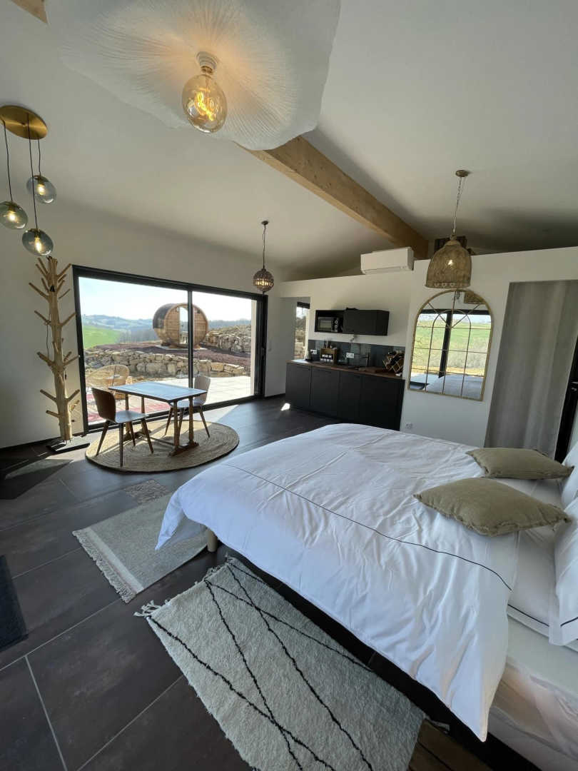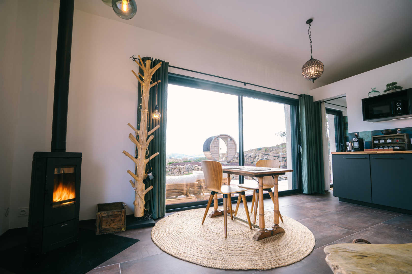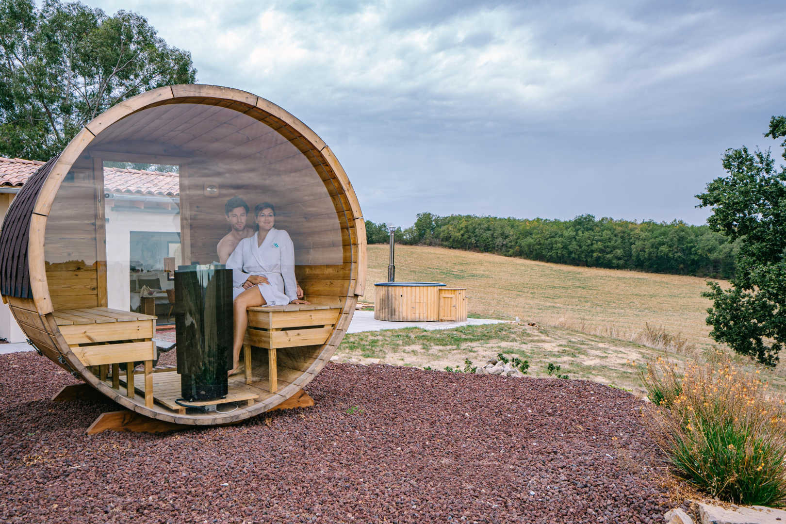 Maisonnette type « lodge » indépendante de 35m2 superbement décoré et équipé d’un bain nordique et d’un sauna baril panoramique et un bain froid