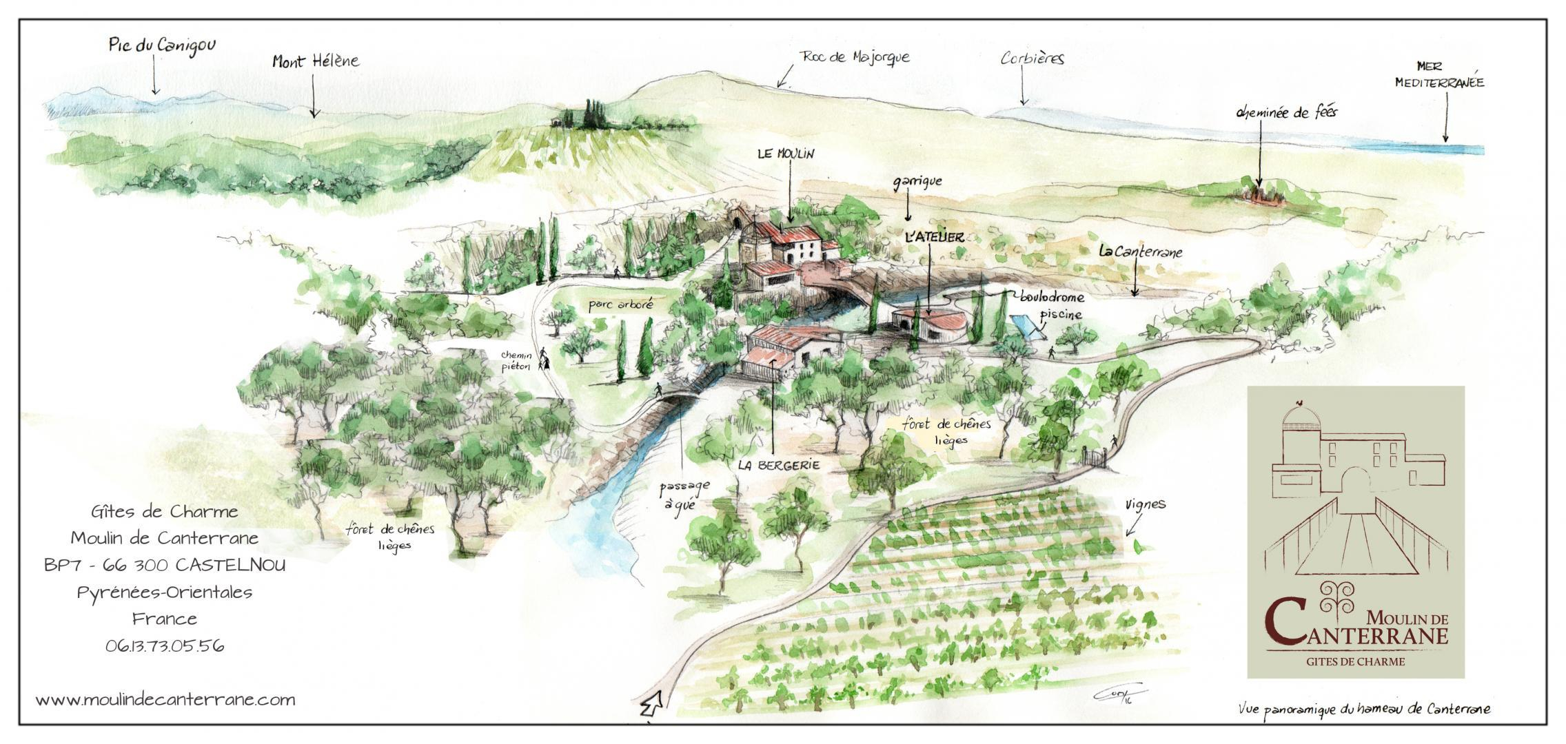 Accès : Sortir de l’autoroute à Perpignan Sud. Passer Thuir, Llupia puis Terrats. Entre Terrats et Fourques sur la départementale D615, prendre à droite au niveau du clan d’epona et suivre les panneaux bleus Moulin de Canterrane .