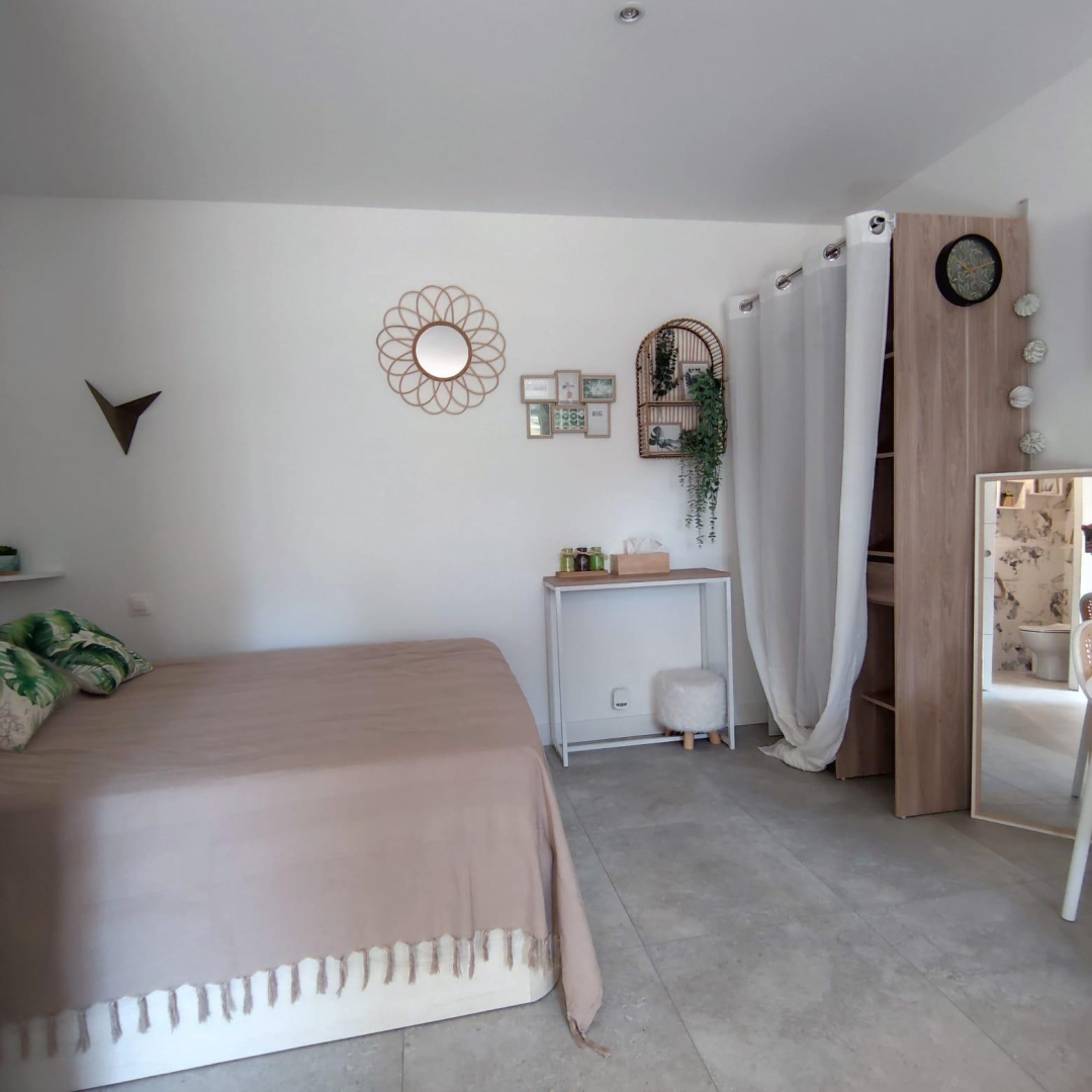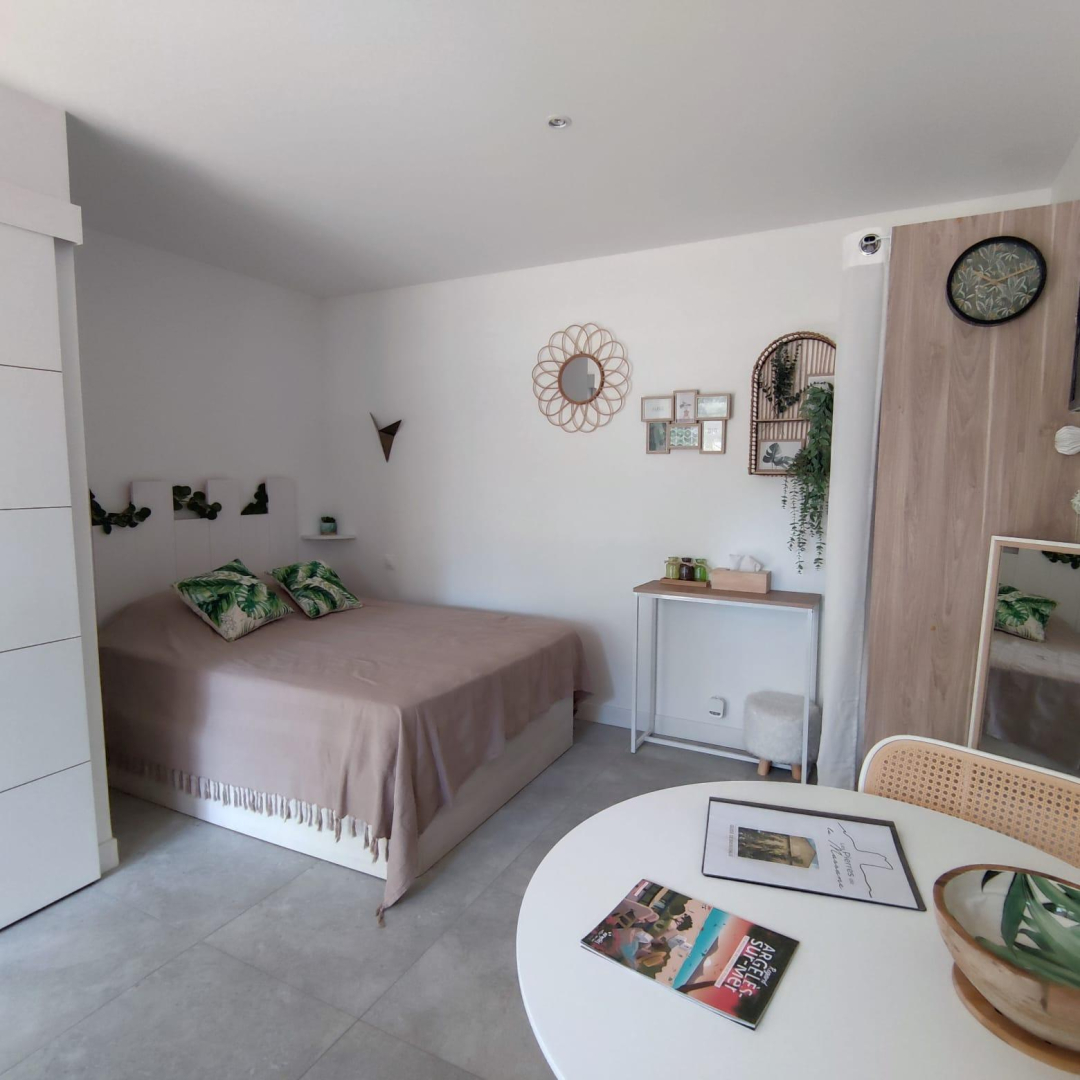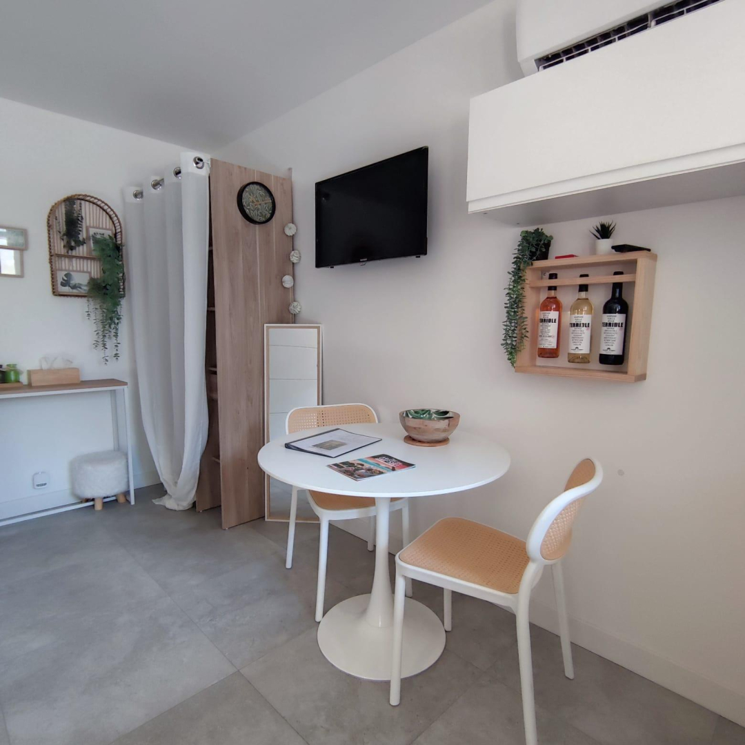 Vous apprécierez les grands espaces extérieurs de plus de 1,5 ha non clôturés, arborés de chênes lièges et d’oliviers. Studio, appartement ou villa…., choisissez ! En famille, entre amis, ce village de gîtes vous attend ! Vous séjournerez proche de la nature tout en étant à deux pas de l’animation, des plages et des criques ! La nouvelle piste cyclable EuroVelo8 passe devant le domaine. Pour chaque gîte, une place de parking privative et sécurisée est à votre disposition. En rez de chaussée : Ce joli studio, équipé d’une cuisine avec pièce à vivre (1 lit 140), d’une salle d’eau (wc), est ouvert sur sa terrasse de 18 m².