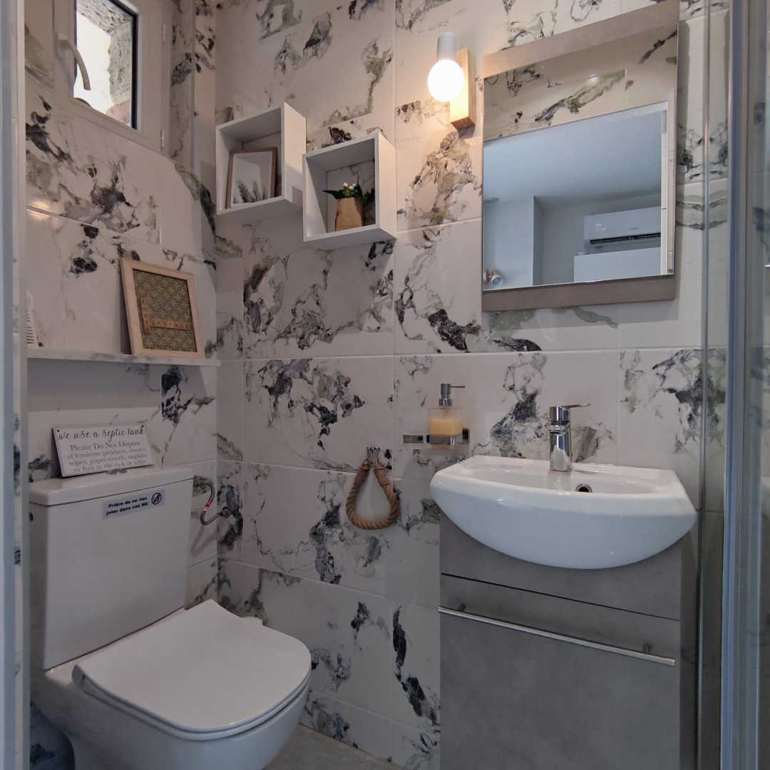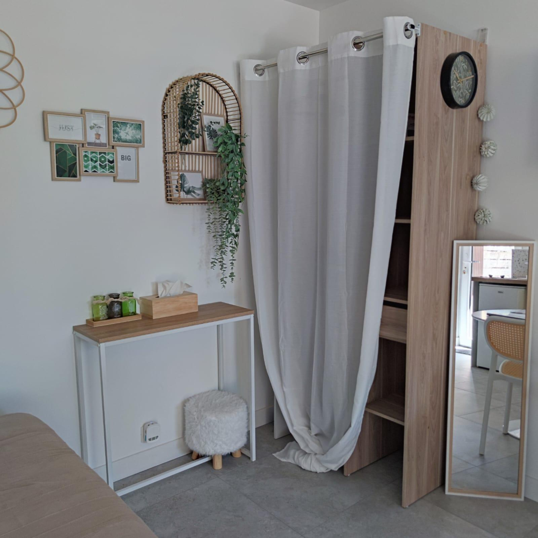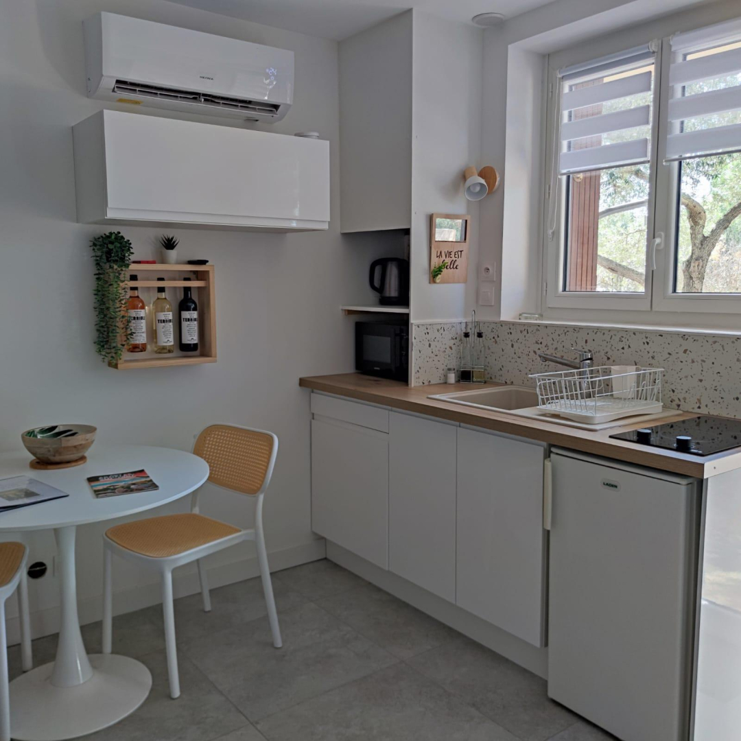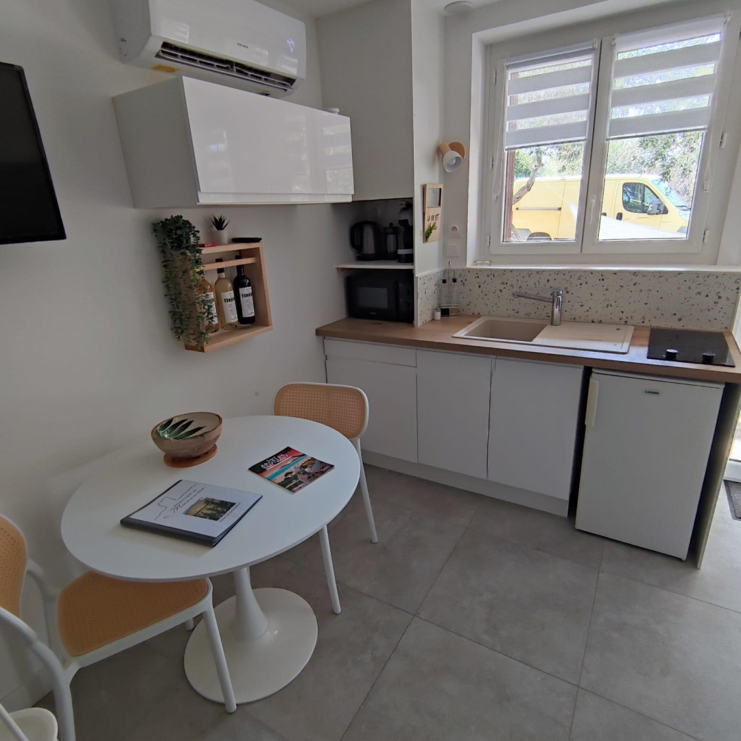 Vous apprécierez les grands espaces extérieurs de plus de 1,5 ha non clôturés, arborés de chênes lièges et d’oliviers. Studio, appartement ou villa…., choisissez ! En famille, entre amis, ce village de gîtes vous attend ! Vous séjournerez proche de la nature tout en étant à deux pas de l’animation, des plages et des criques ! La nouvelle piste cyclable EuroVelo8 passe devant le domaine. Pour chaque gîte, une place de parking privative et sécurisée est à votre disposition. En rez de chaussée : Ce joli studio, équipé d’une cuisine avec pièce à vivre (1 lit 140), d’une salle d’eau (wc), est ouvert sur sa terrasse de 18 m².