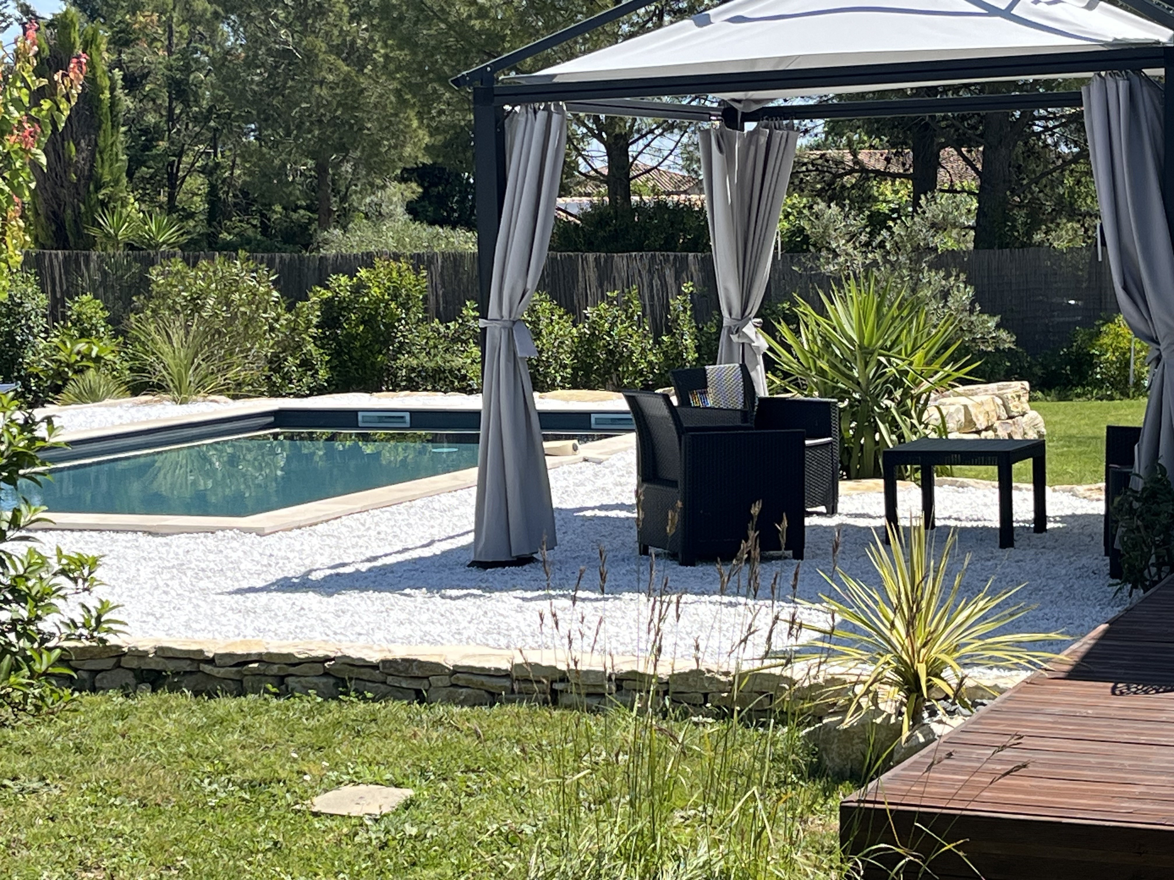 Soyez les bienvenus à Blauzac, dans cette chaleureuse maison de 100 m2 pouvant accueillir 6 pers., avec sa cuisine entièrement équipée, ses 3 chambres, entourée d’un jardin arboré, de 3 terrasses et d’une belle piscine privée (7×4 au sel).