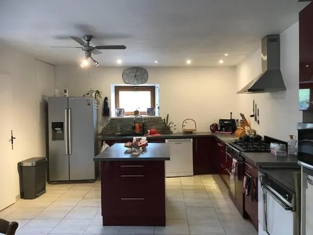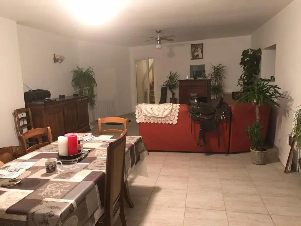 Au rez-de-chaussée : un WC, cuisine salle à manger et salon. Très éclairée par plusieurs fenêtres et une baie vitrée, ayant la particularité d’avoir une fenêtre donnant sur l’écurie.