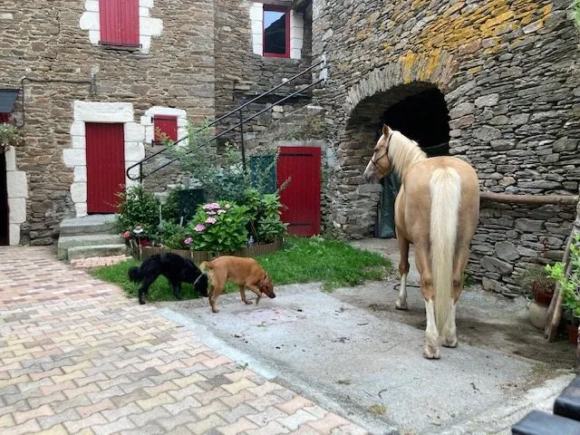 C’est une ferme composée d’une courette menant à la maison, avec une écurie et un porche (avec une barre d’attache et un coin douche pour les chevaux).