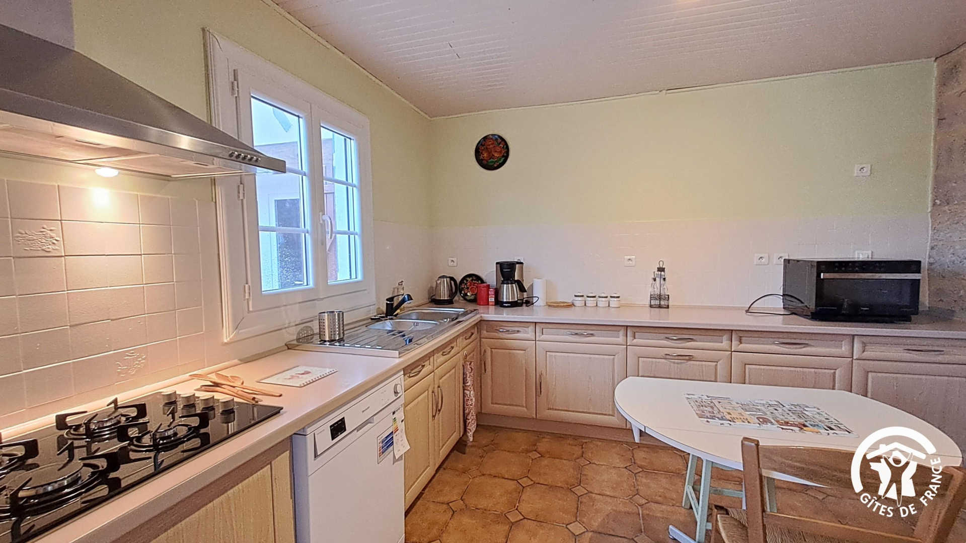 – cuisine toute équipée : lave-vaisselle, réfrigérateur-congélateur, plaque gaz, cafetière à filtre et cafetière Senséo à capsules, combi four + micro-ondes
