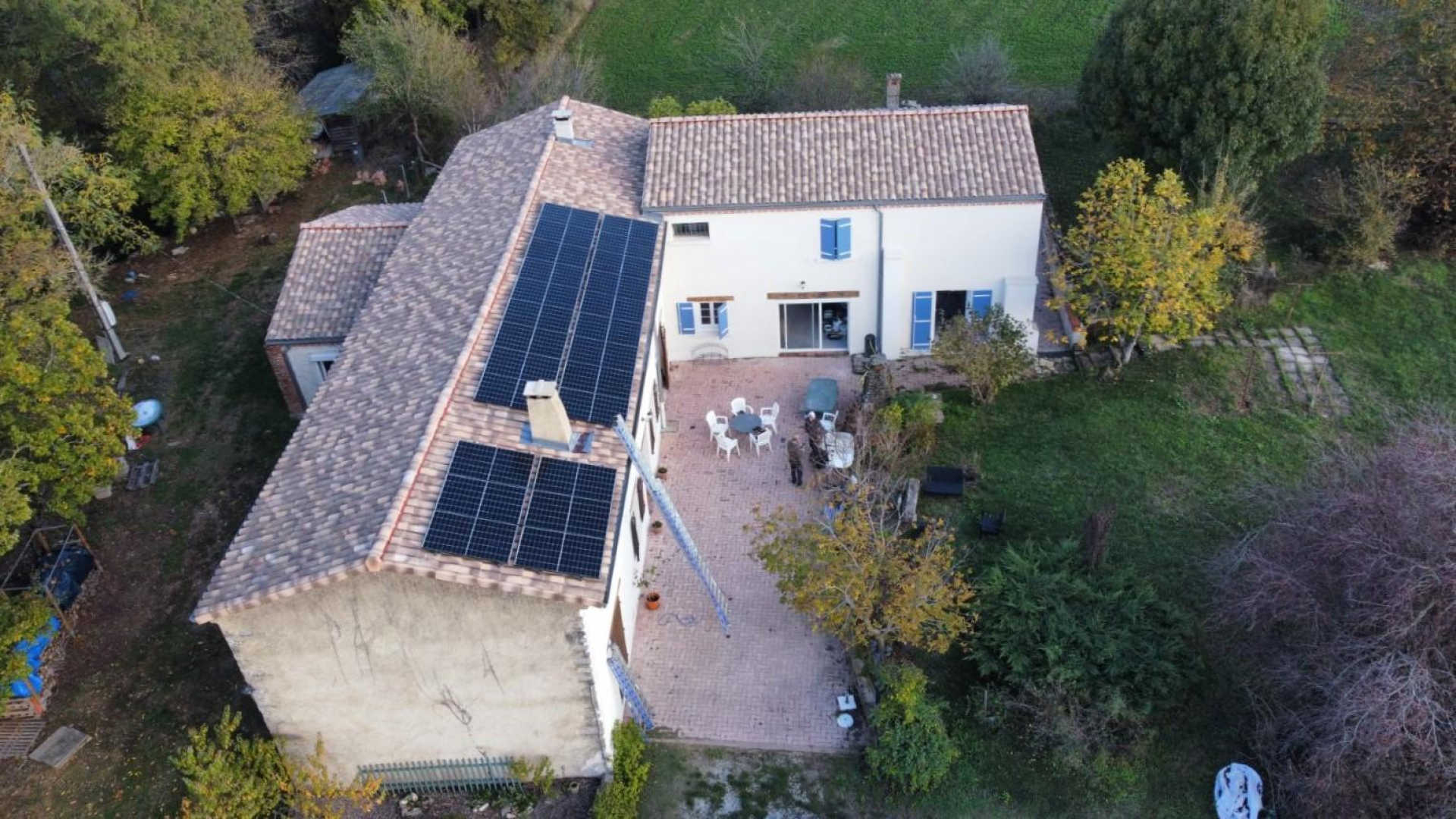 Maison en forme de L mitoyenne à l’habitation des propriétaires. La cour à l’avant est commune, les propriétaires disposent d’une terrasse de l’autre côté sans vis-à-vis.
