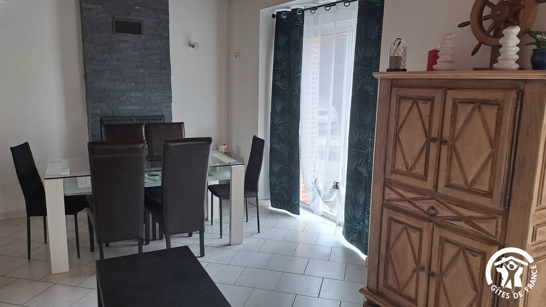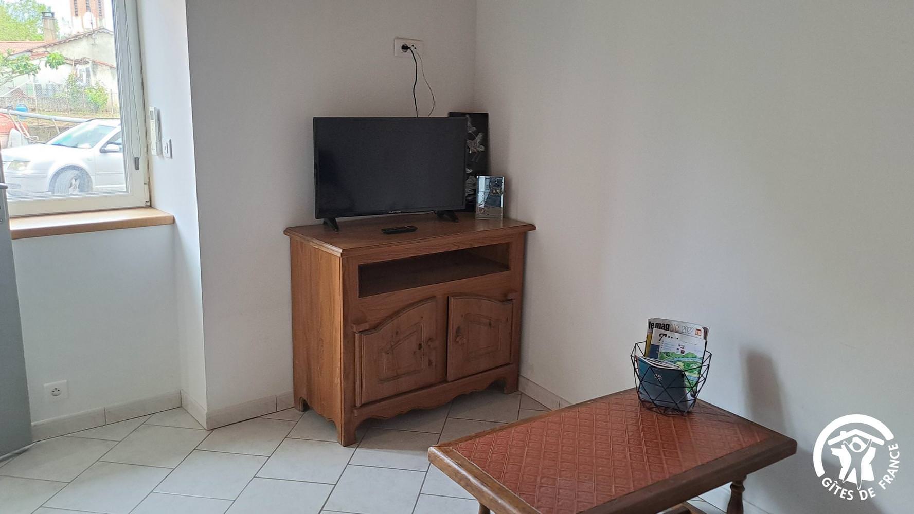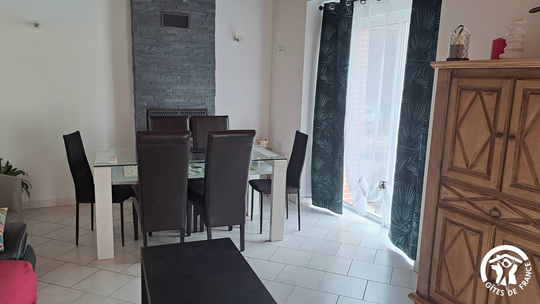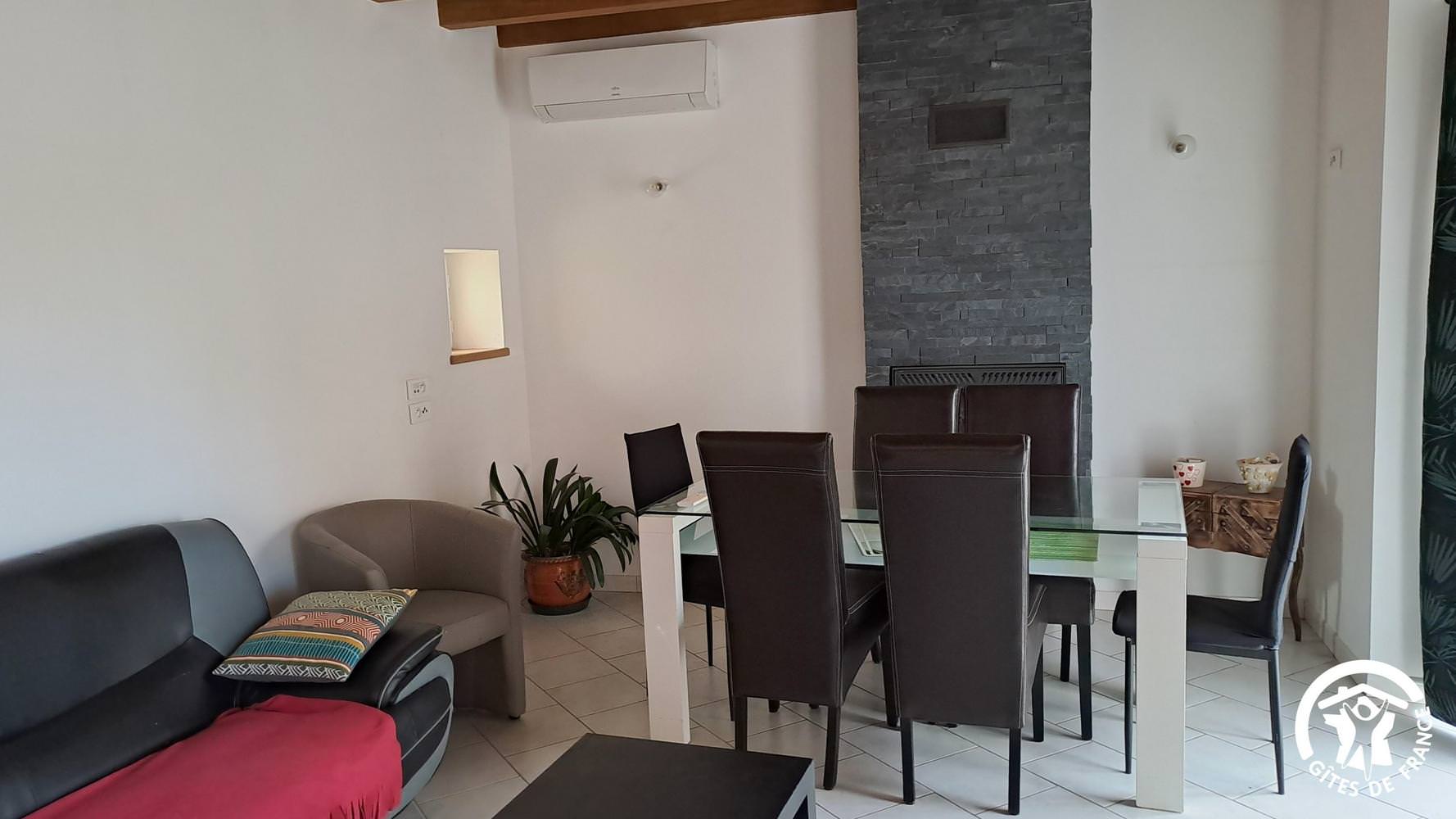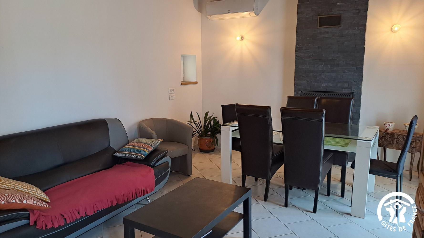 – pièce à vivre avec coin salon et salle à manger (table et chaises pour 6 personnes, tv, canapé, table basse)