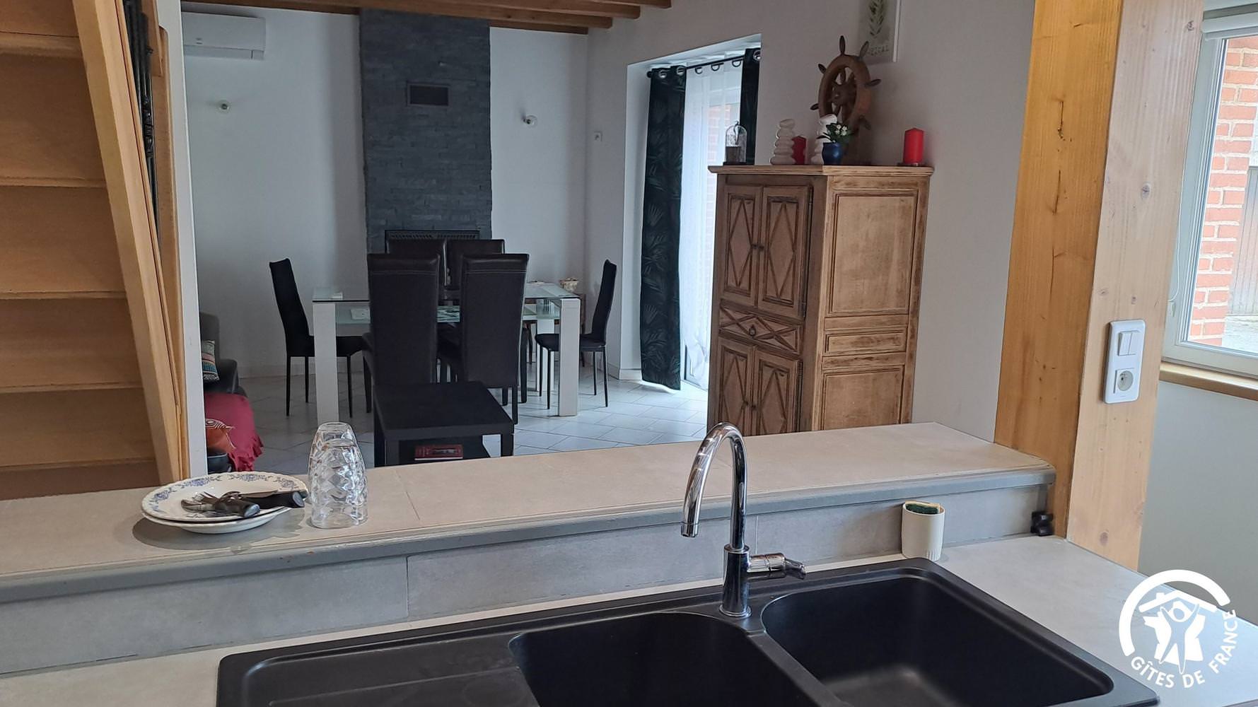 – cuisine ouverte toute équipée : plaque 4 feux gaz, four, réfrigérateur-congélateur, lave-vaisselle, lave-linge, cafetière, bouilloire, grille-pain…