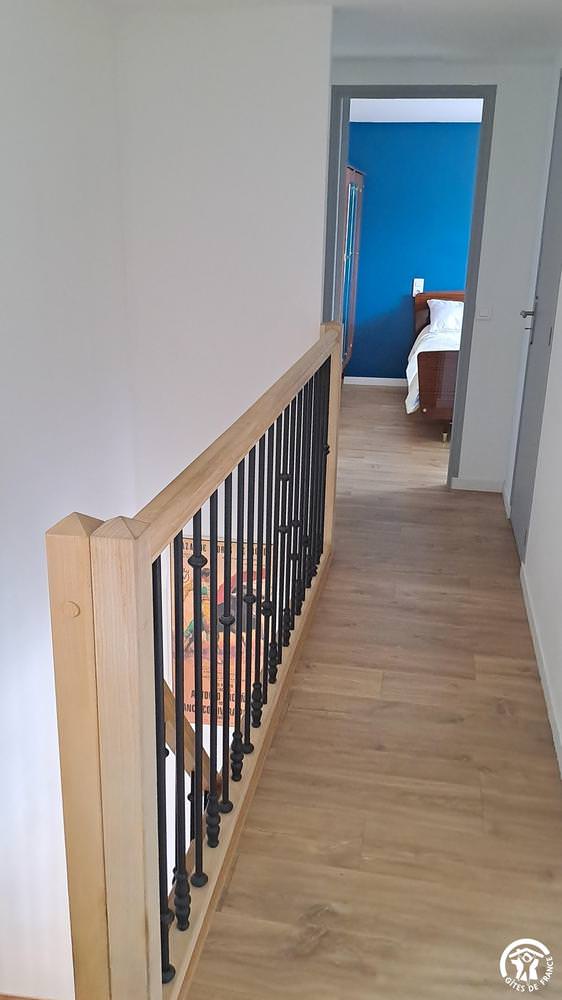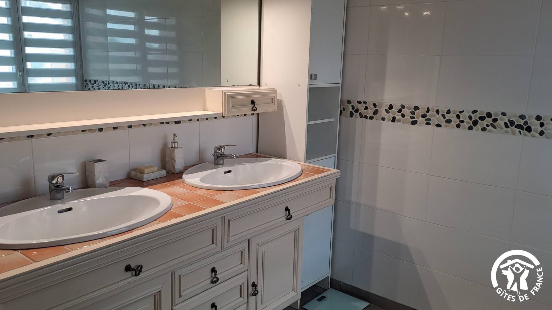 A l’étage, se trouvent les deux chambres, une salle d’eau avec douche, double vasque, sèche-serviettes électrique , wc indépendant