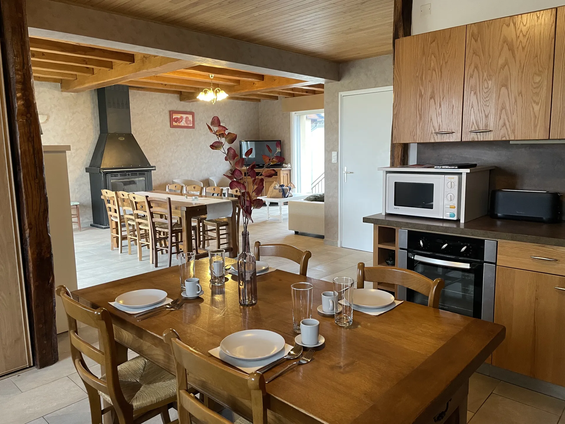 Cuisine entièrement équipée : cafetière, bouilloire, grille-pain, robot pâtissier, micro-ondes, lave-vaisselle, plaque induction, four électrique, frigo avec une partie congélateur