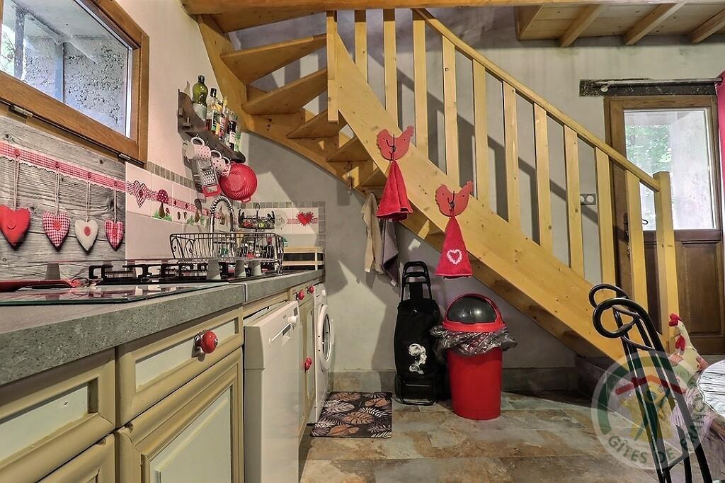 Environnement de village. Charmante maison indépendante, avec, depuis le parking, une montée d’escaliers qui donne accès au premier niveau du gîte avec cuisine et salle d’eau avec wc.