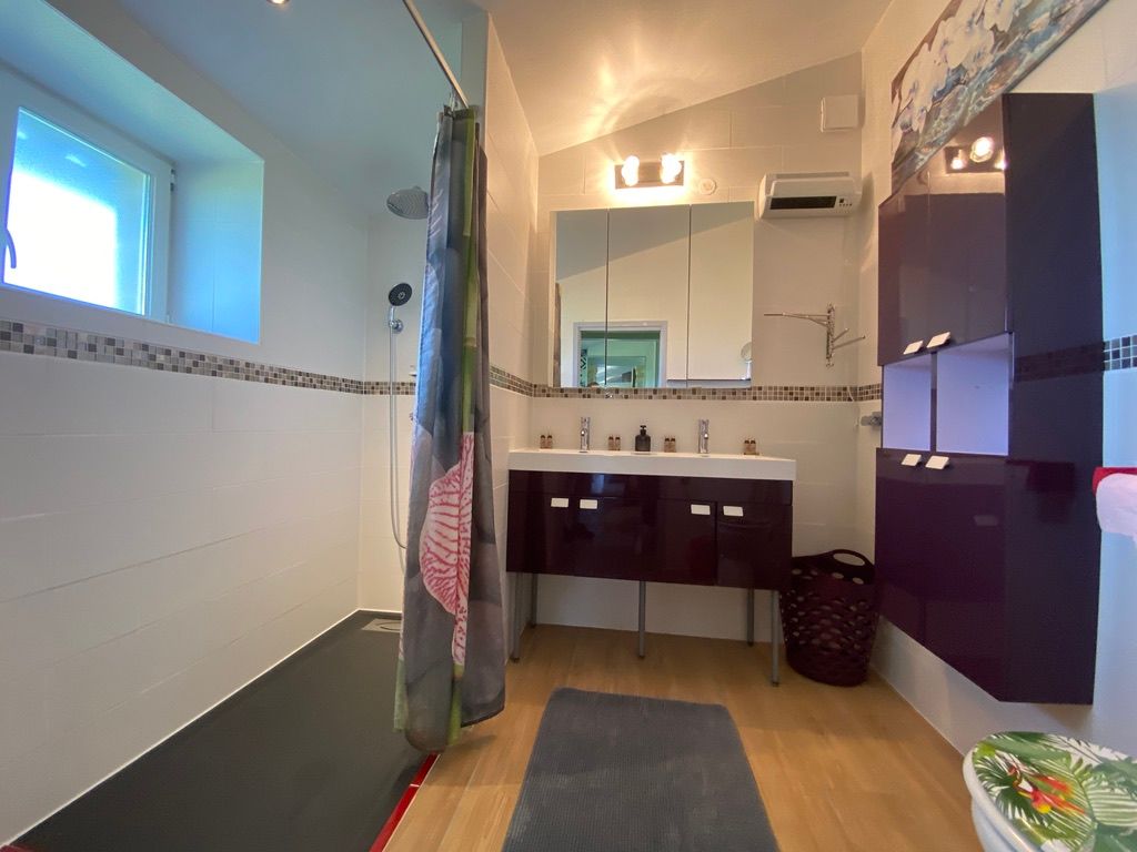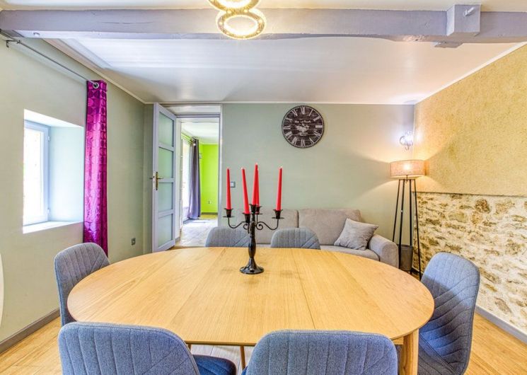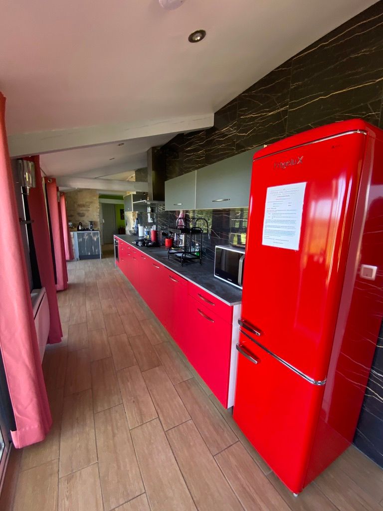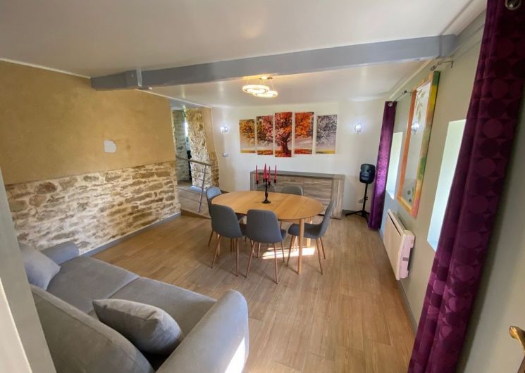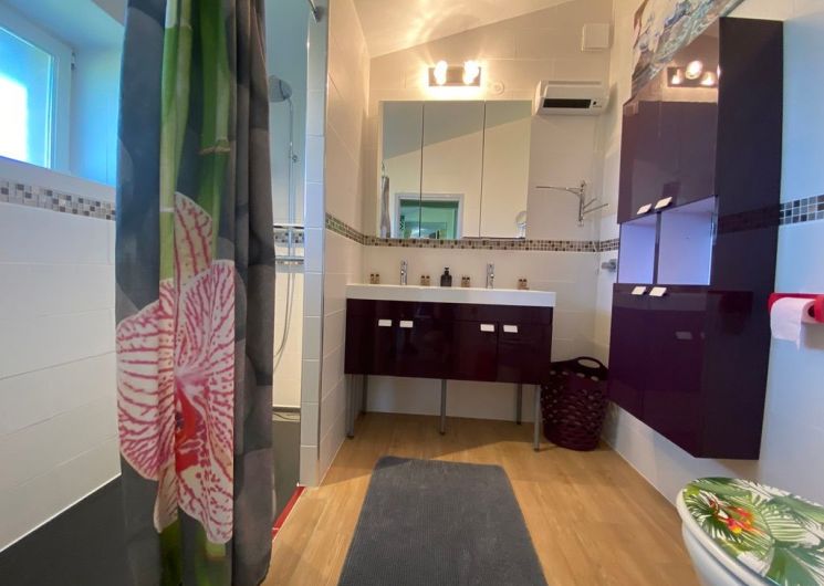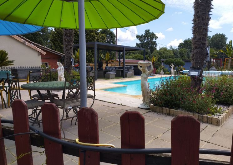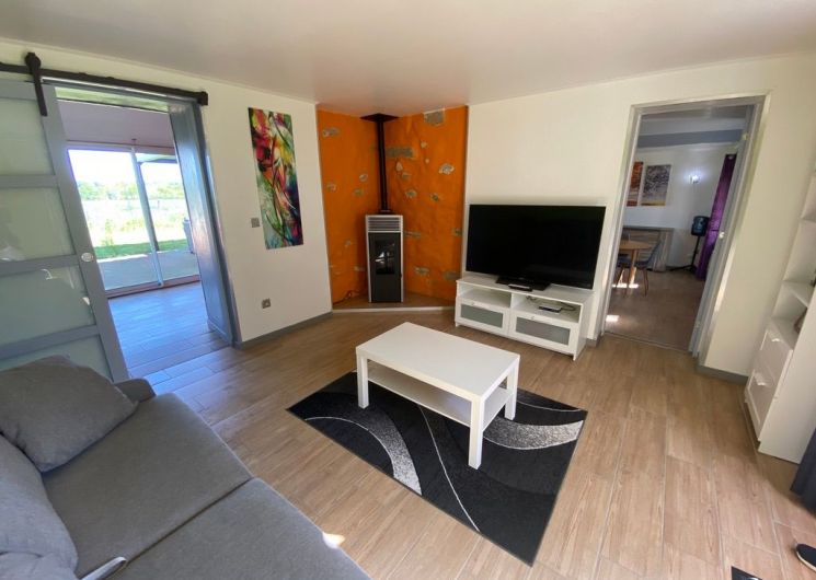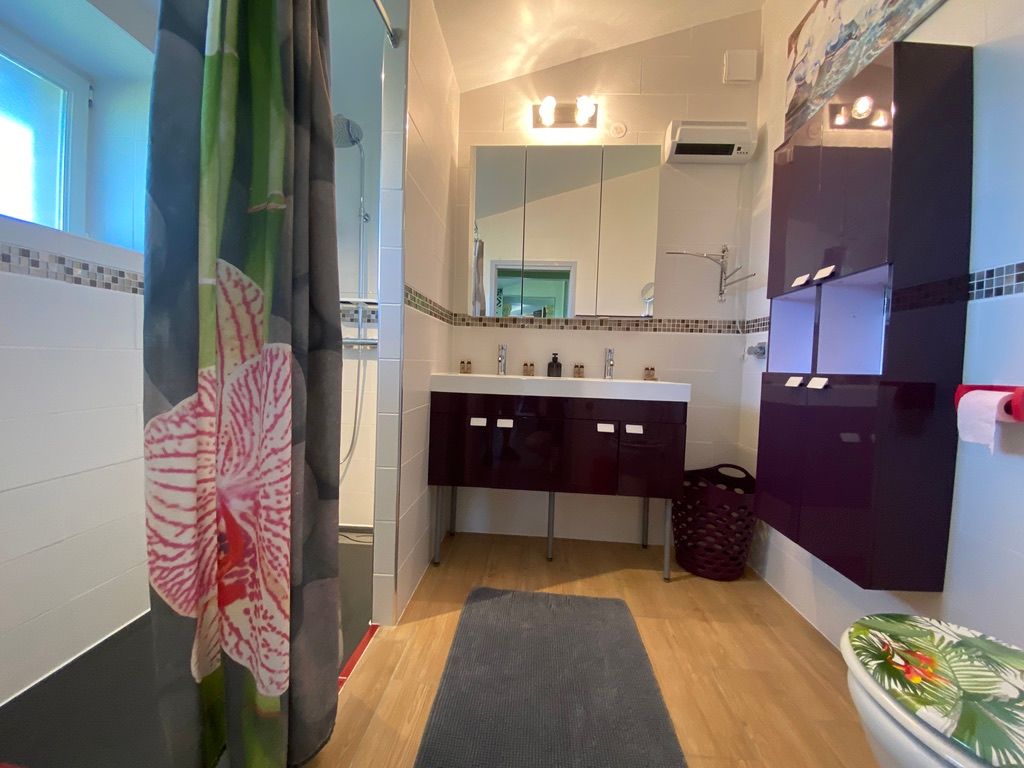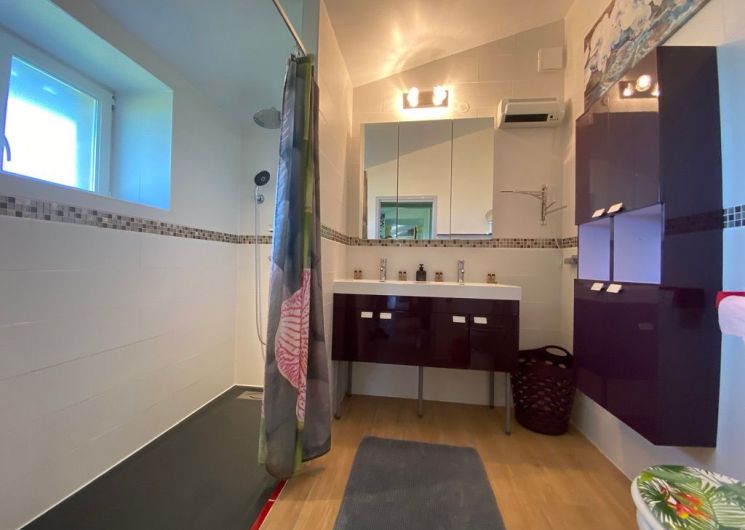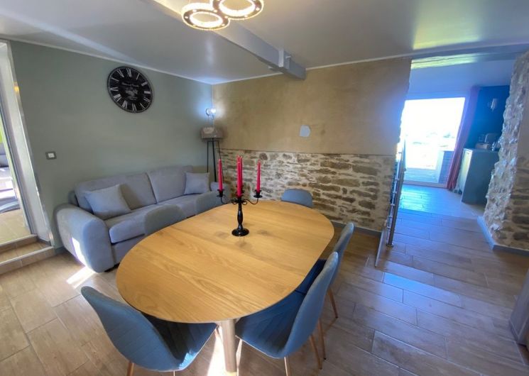 Au rez-de-chaussée, une première terrasse, mobilier de jardin, barbecue au gaz. Une cuisine tout en longueur (éléments intégrés : réfrigérateur, congélateur, plaques, four, micro-ondes lave-vaisselle). Une première chambre avec 1 lit 140 x 200 (canapé convertible) poêle à granules, TV. Une salle à manger (table et chaises et meuble avec jeux de société. Une grande chambre avec 1 lit 160 x 200 plus un canapé lit convertible 140 X 200, TV donnant sur un jardin avec massif et ruissellement d’eau. Une salle de d’eau avec douche à l’italienne. Espace laverie avec lave-linge, sèche-linge. Linge de lit de toilette et de maison fournis, compris dans le prix. Wifi dans le logement gratuit. Peignoirs de bain fournis. Du 15 mai au 31 octobre accès à la piscine partagée avec son spa. Logement entièrement climatisé.