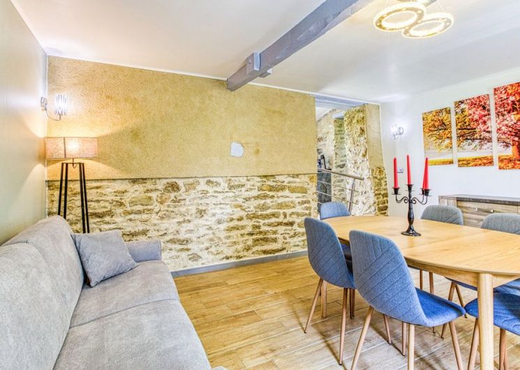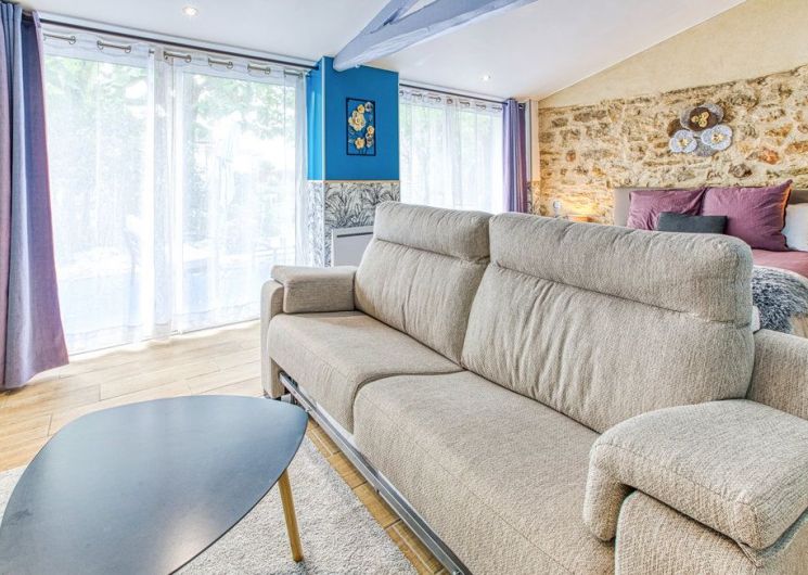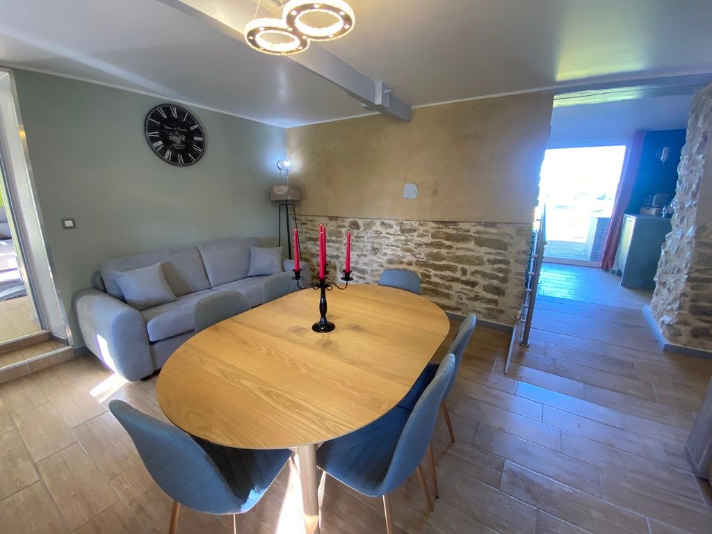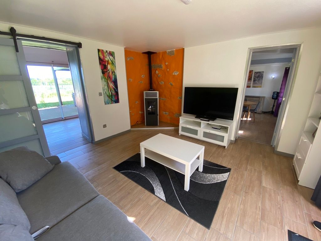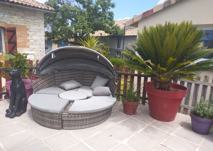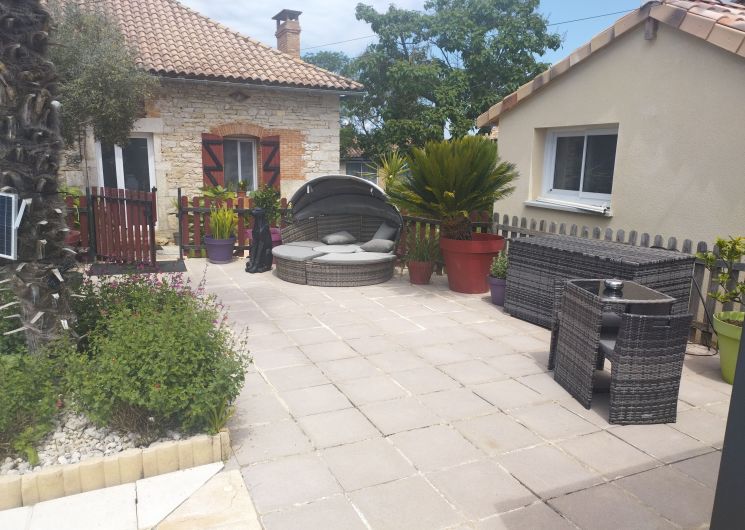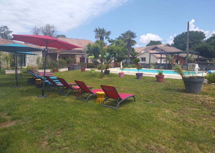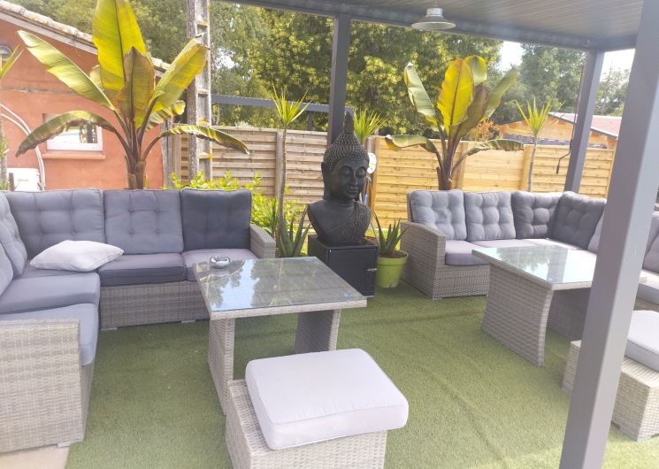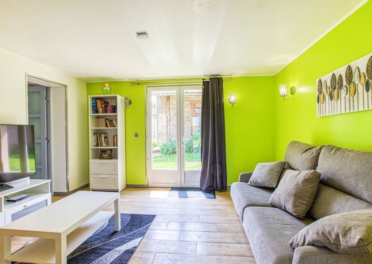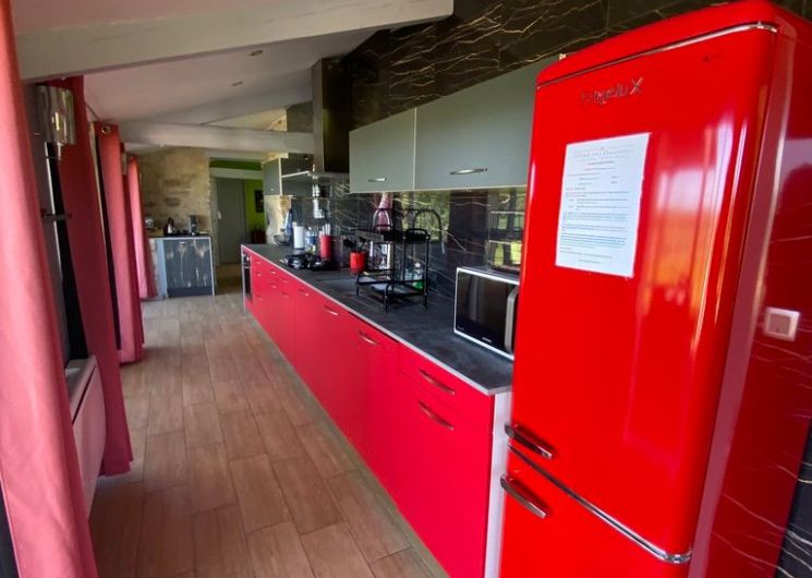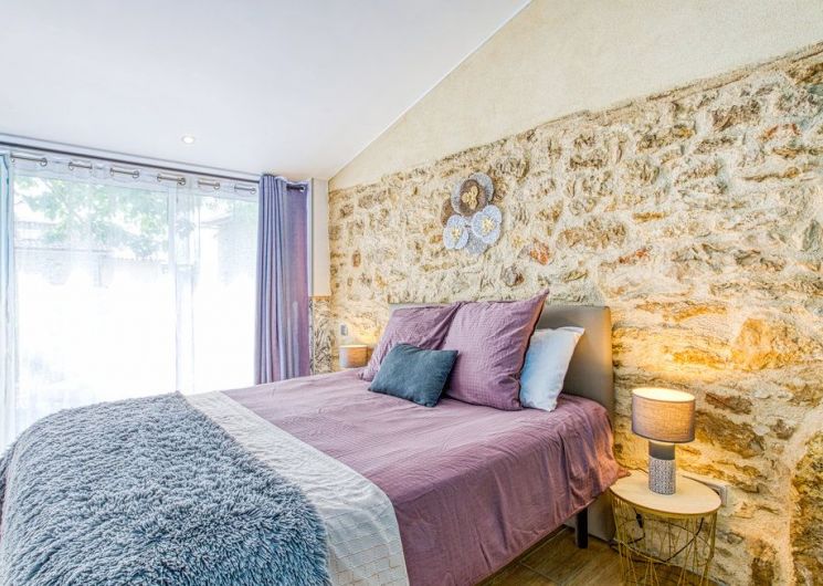 Au rez-de-chaussée, une première terrasse, mobilier de jardin, barbecue au gaz. Une cuisine tout en longueur (éléments intégrés : réfrigérateur, congélateur, plaques, four, micro-ondes lave-vaisselle). Une première chambre avec 1 lit 140 x 200 (canapé convertible) poêle à granules, TV. Une salle à manger (table et chaises et meuble avec jeux de société. Une grande chambre avec 1 lit 160 x 200 plus un canapé lit convertible 140 X 200, TV donnant sur un jardin avec massif et ruissellement d’eau. Une salle de d’eau avec douche à l’italienne. Espace laverie avec lave-linge, sèche-linge. Linge de lit de toilette et de maison fournis, compris dans le prix. Wifi dans le logement gratuit. Peignoirs de bain fournis. Du 15 mai au 31 octobre accès à la piscine partagée avec son spa. Logement entièrement climatisé.