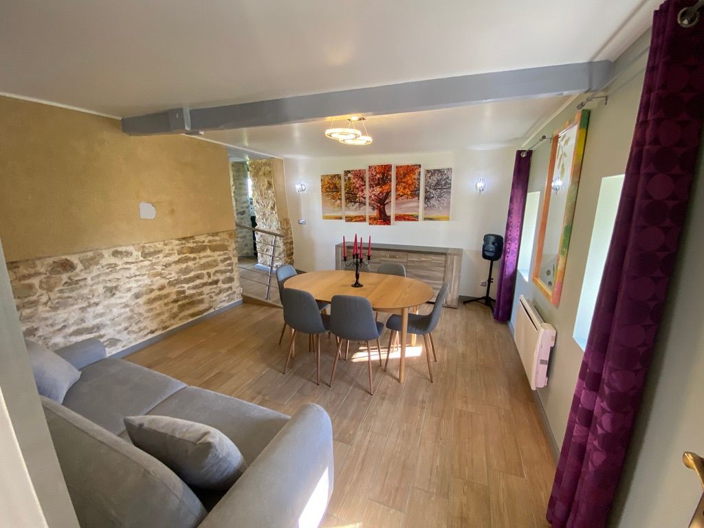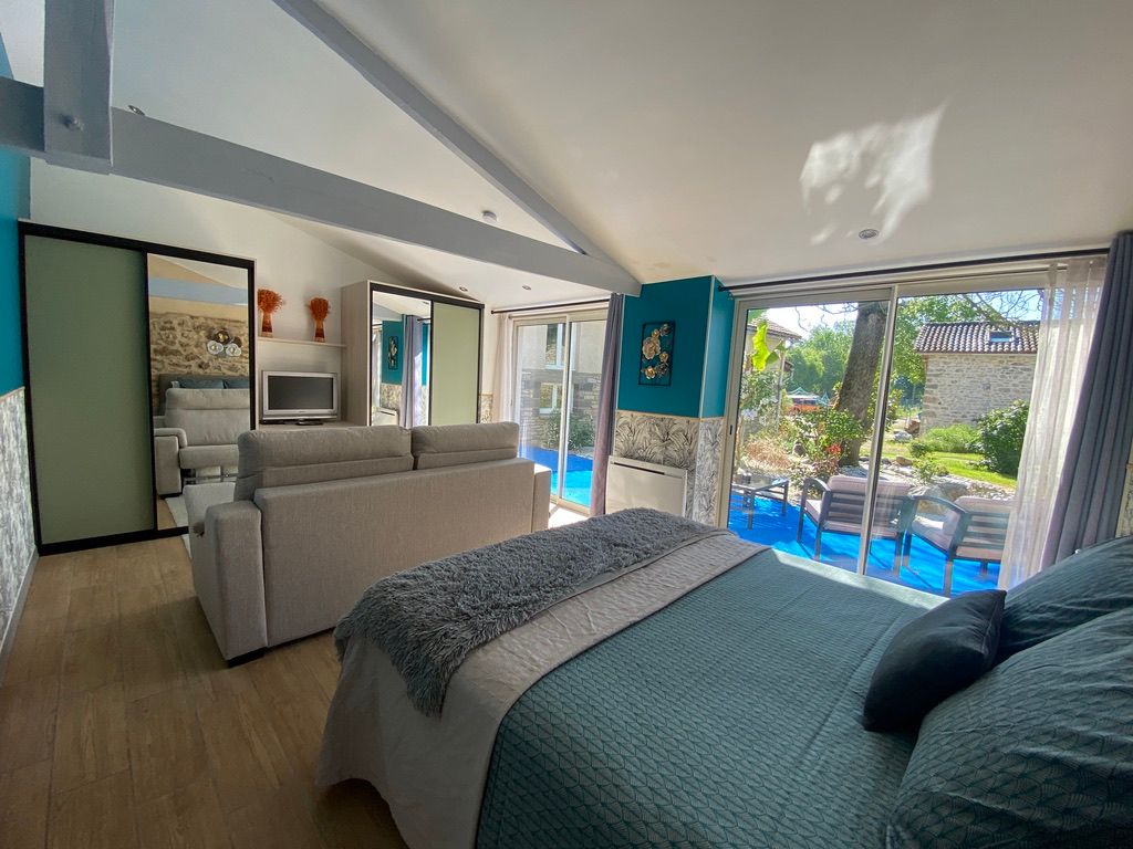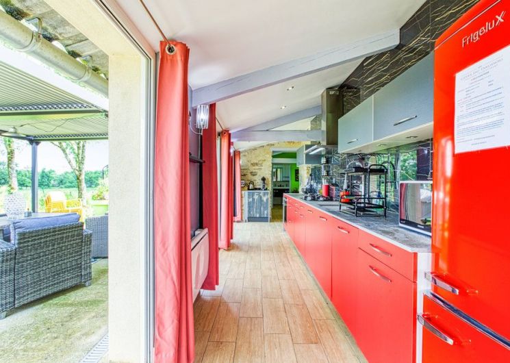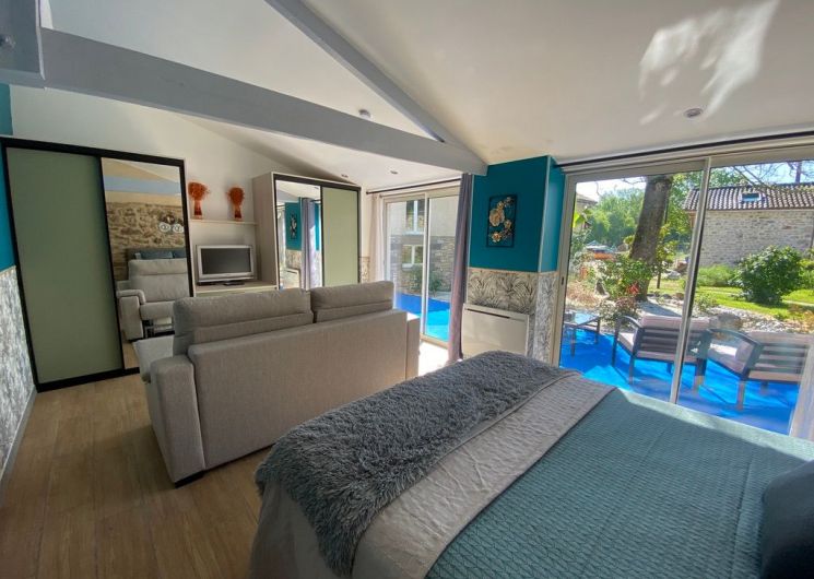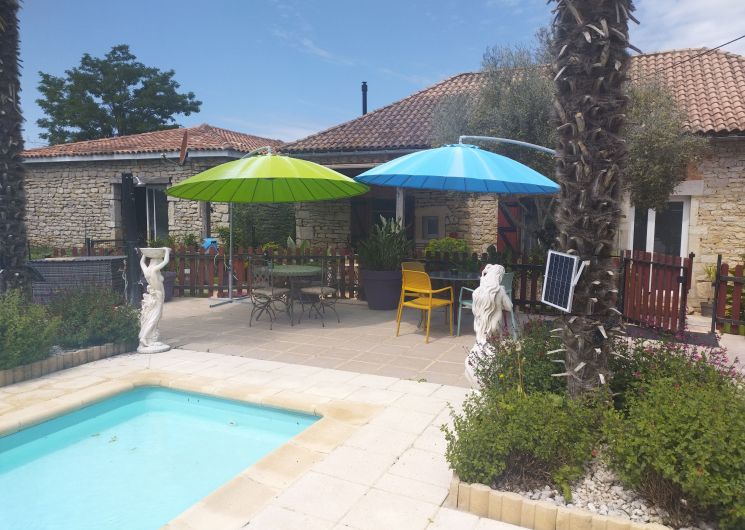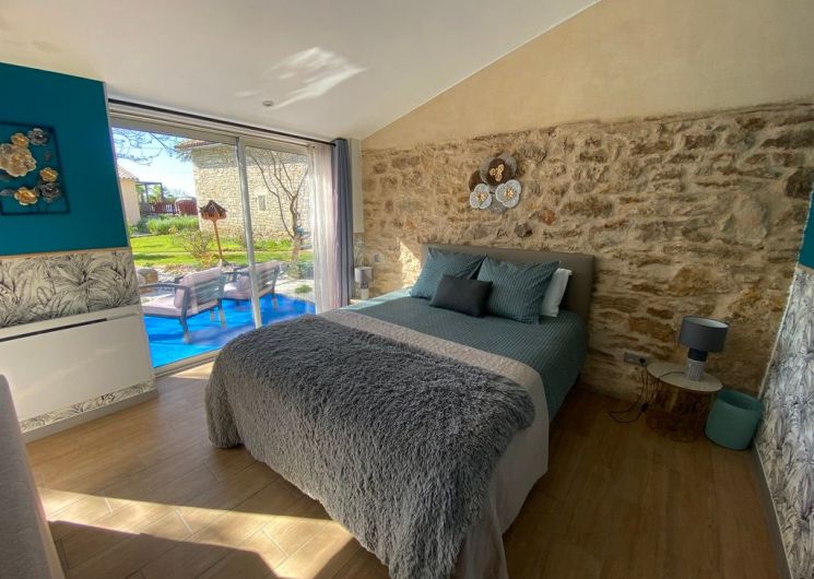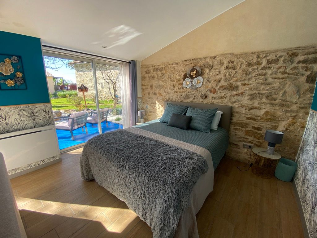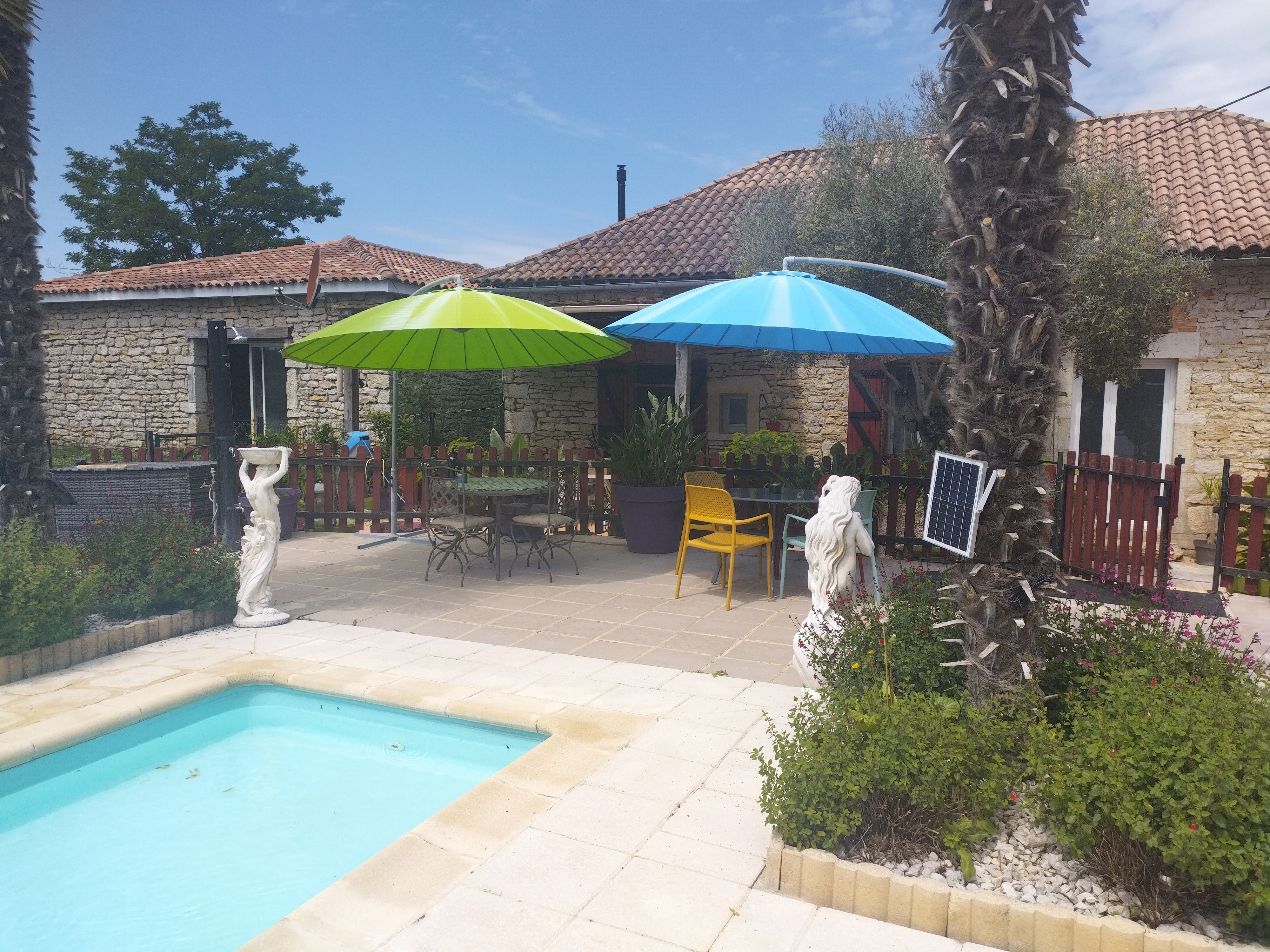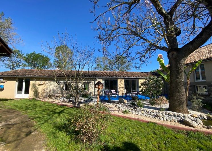 Au rez-de-chaussée, une première terrasse, mobilier de jardin, barbecue au gaz. Une cuisine tout en longueur (éléments intégrés : réfrigérateur, congélateur, plaques, four, micro-ondes lave-vaisselle). Une première chambre avec 1 lit 140 x 200 (canapé convertible) poêle à granules, TV. Une salle à manger (table et chaises et meuble avec jeux de société. Une grande chambre avec 1 lit 160 x 200 plus un canapé lit convertible 140 X 200, TV donnant sur un jardin avec massif et ruissellement d’eau. Une salle de d’eau avec douche à l’italienne. Espace laverie avec lave-linge, sèche-linge. Linge de lit de toilette et de maison fournis, compris dans le prix. Wifi dans le logement gratuit. Peignoirs de bain fournis. Du 15 mai au 31 octobre accès à la piscine partagée avec son spa. Logement entièrement climatisé.