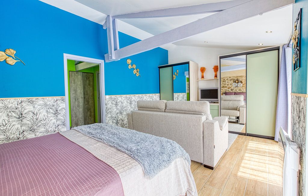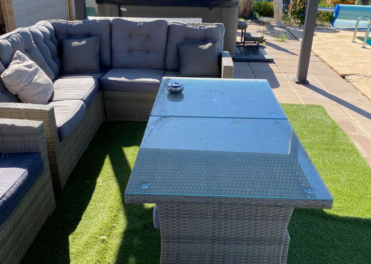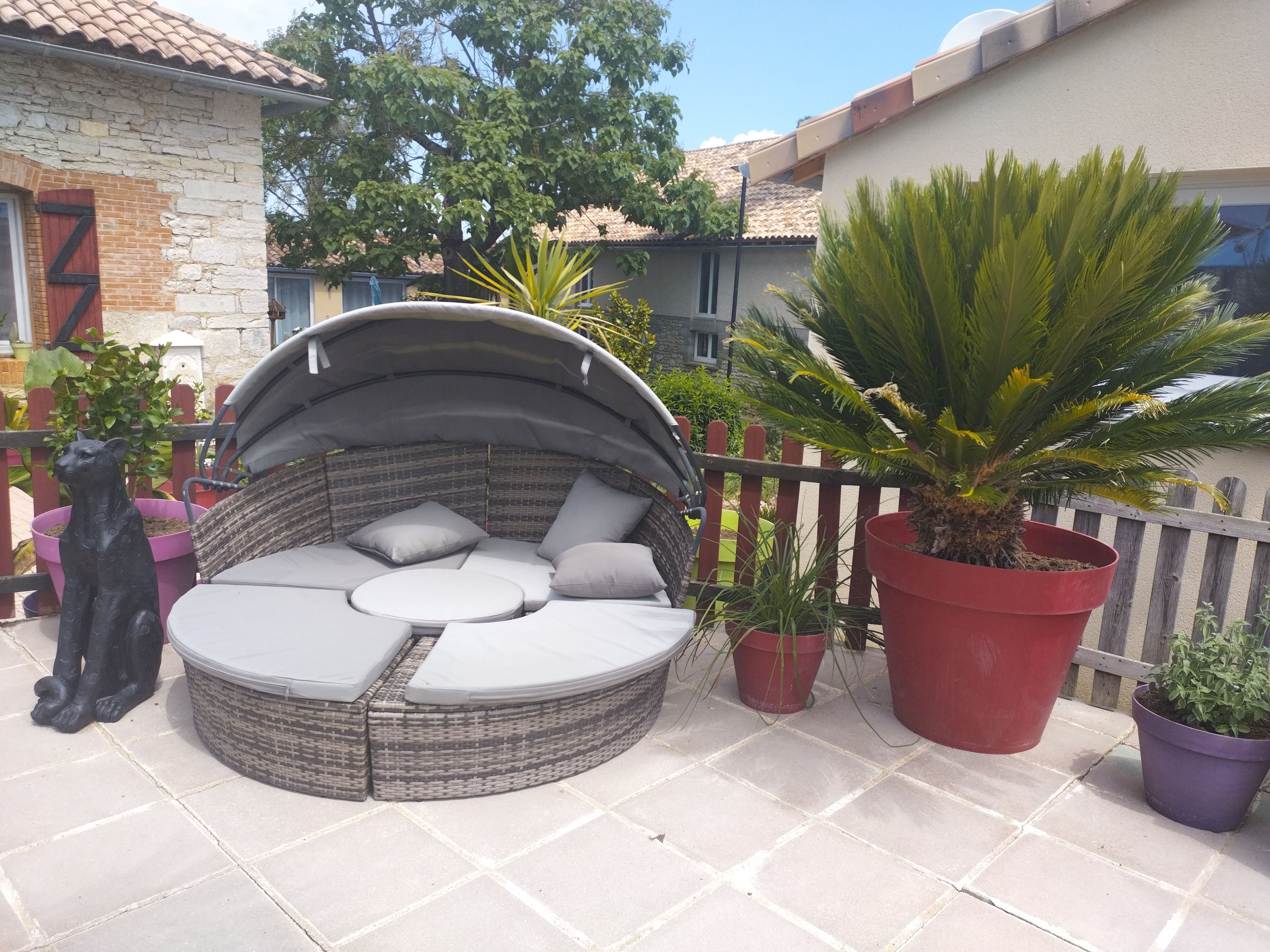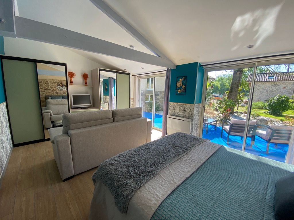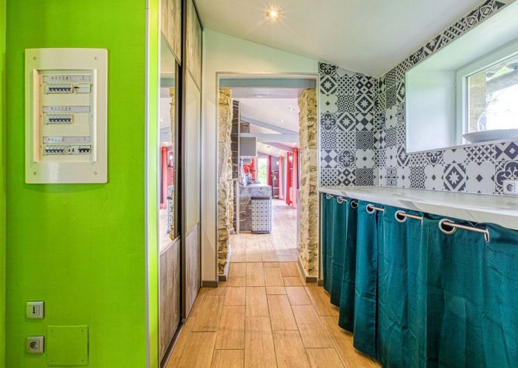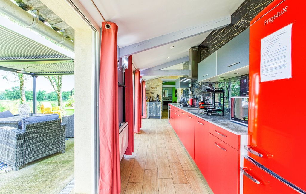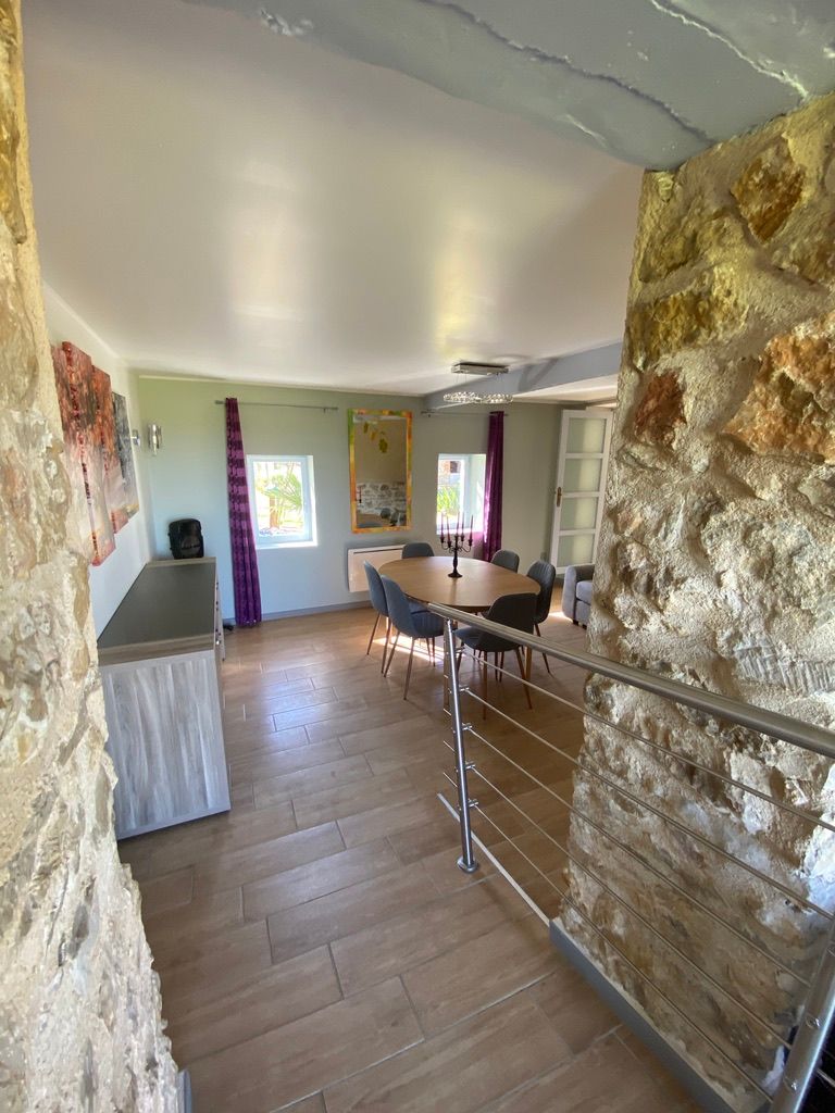 Au rez-de-chaussée, une première terrasse, mobilier de jardin, barbecue au gaz. Une cuisine tout en longueur (éléments intégrés : réfrigérateur, congélateur, plaques, four, micro-ondes lave-vaisselle). Une première chambre avec 1 lit 140 x 200 (canapé convertible) poêle à granules, TV. Une salle à manger (table et chaises et meuble avec jeux de société. Une grande chambre avec 1 lit 160 x 200 plus un canapé lit convertible 140 X 200, TV donnant sur un jardin avec massif et ruissellement d’eau. Une salle de d’eau avec douche à l’italienne. Espace laverie avec lave-linge, sèche-linge. Linge de lit de toilette et de maison fournis, compris dans le prix. Wifi dans le logement gratuit. Peignoirs de bain fournis. Du 15 mai au 31 octobre accès à la piscine partagée avec son spa. Logement entièrement climatisé.