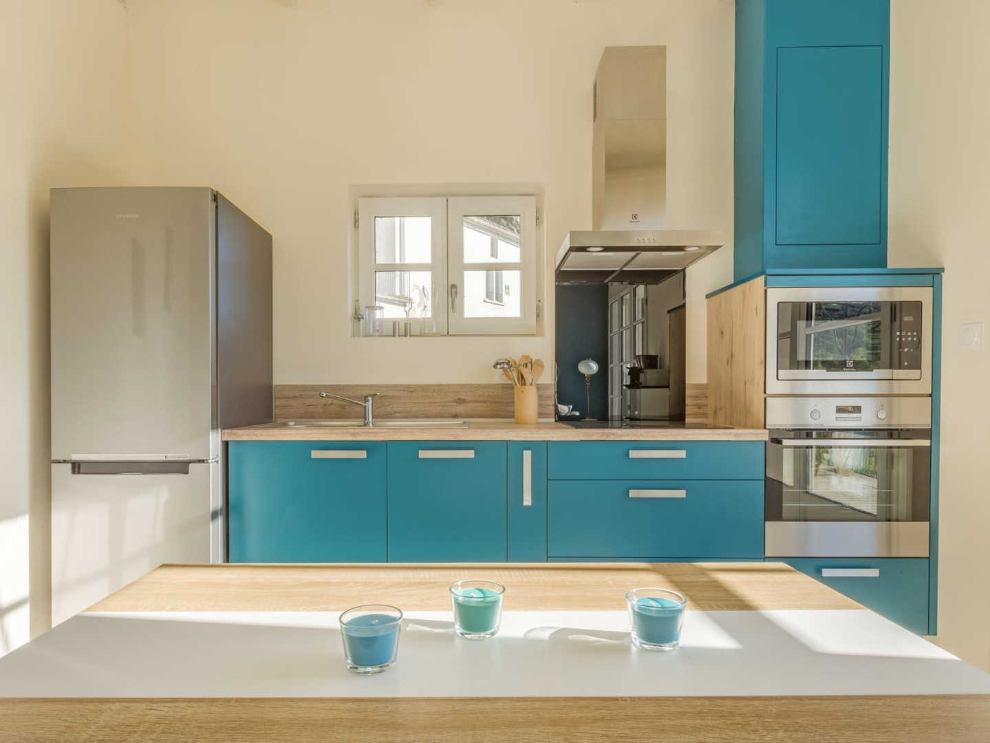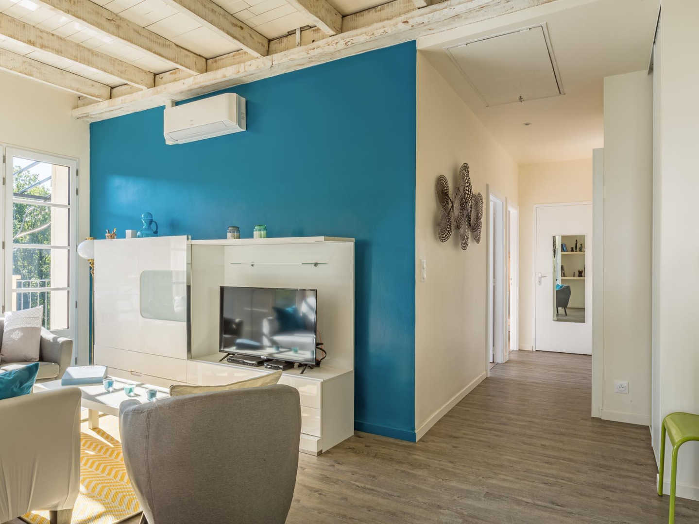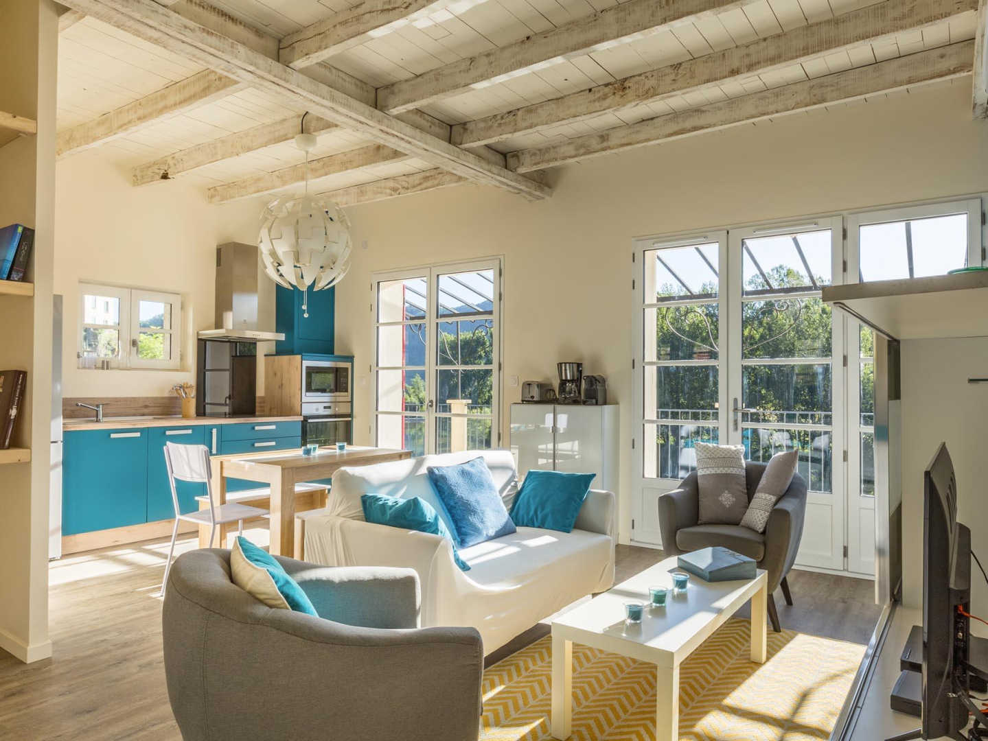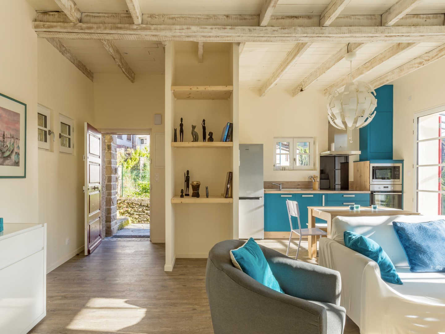 L’appartement comporte une pièce à vivre avec cuisine ouverte toute équipée, coin salon avec tv, deux chambres, chacune avec lit en 160×200, salle d’eau, wc.