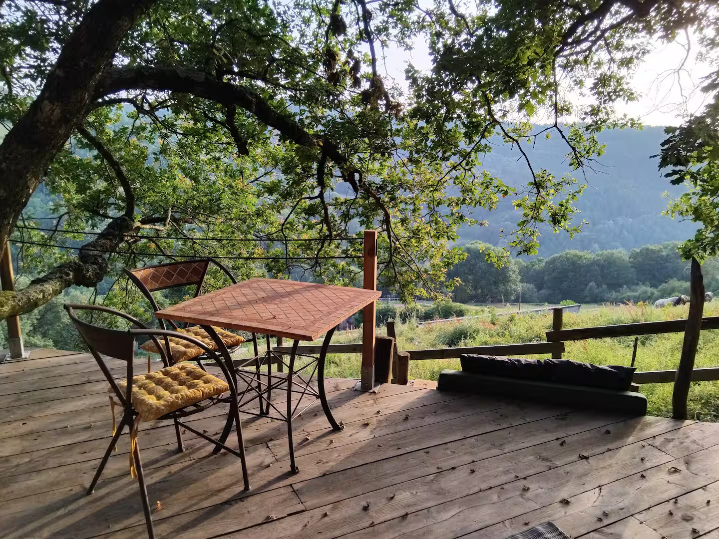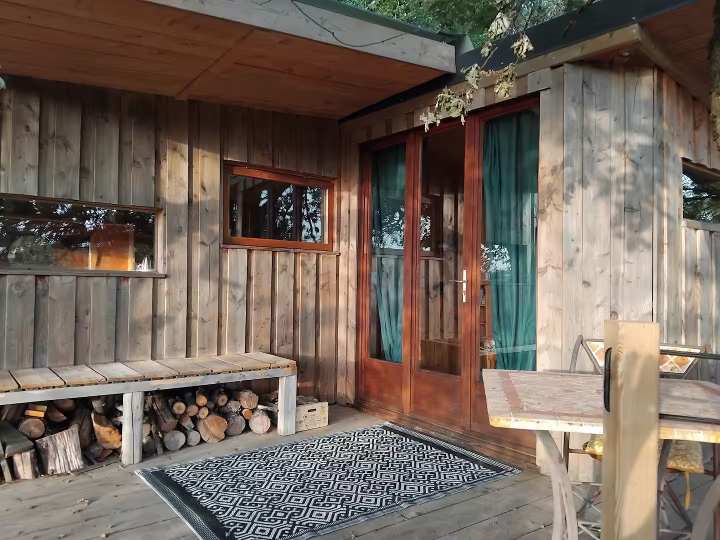 La cabane dispose d’une magnifique terrasse suspendue, parfaite pour admirer la vue, partager un repas ou se détendre dans le hamac. À l’intérieur, vous trouverez un espace chaleureux comprenant :
