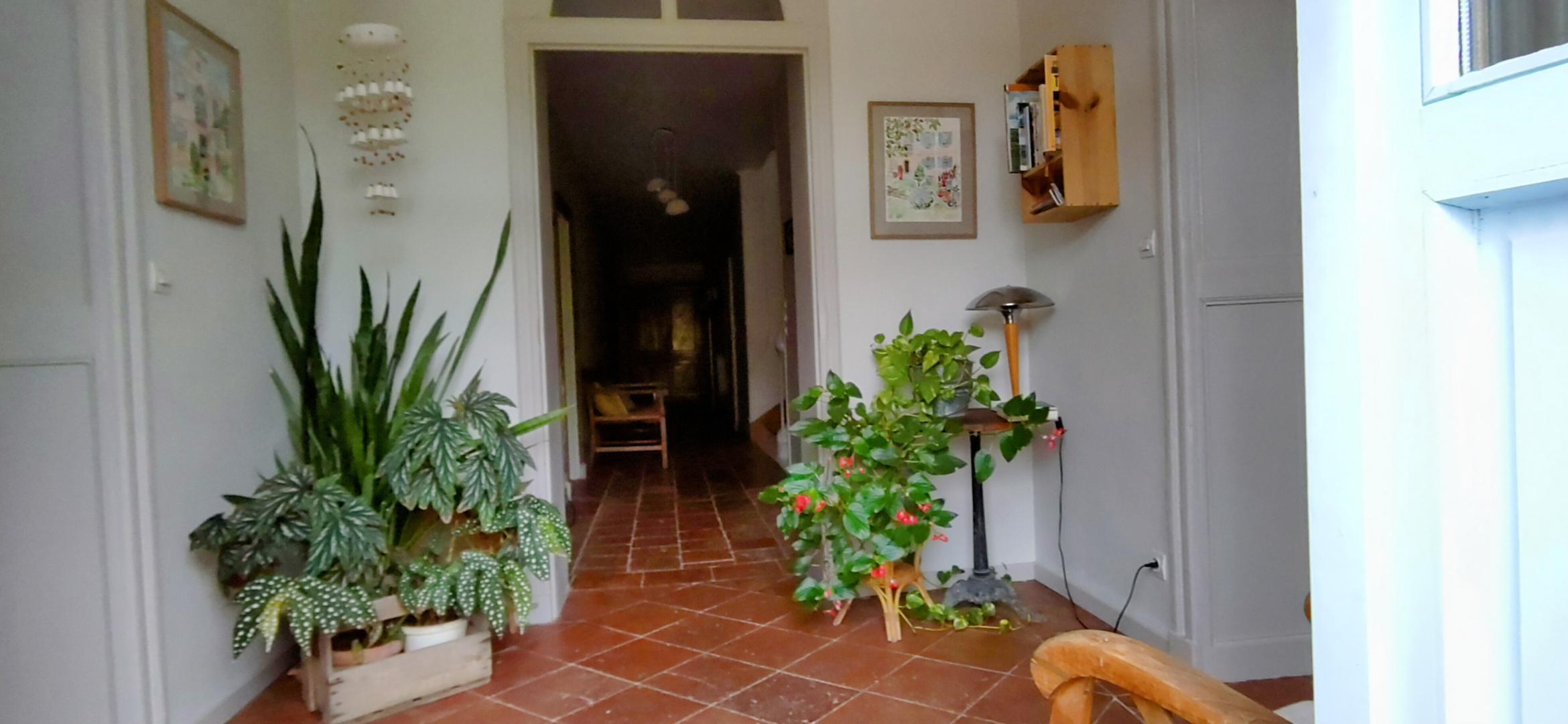 – au rez-de-chaussée : le long couloir qui divise la maison en deux conduit à la pièce de séjour réservée aux hôtes (cheminée, espace salon, table des petits-déjeuners, jeux, bibliothèque).