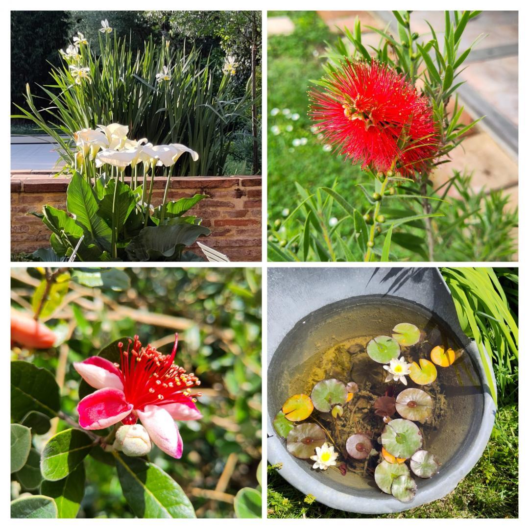 En devant de porte, on découvre un jardin clos, joliment fleuri et arboré. Un portail et quelques marches conduisent à la piscine commune (4x13m) sécurisée par une couverture, et accessible seulement aux beaux jours.