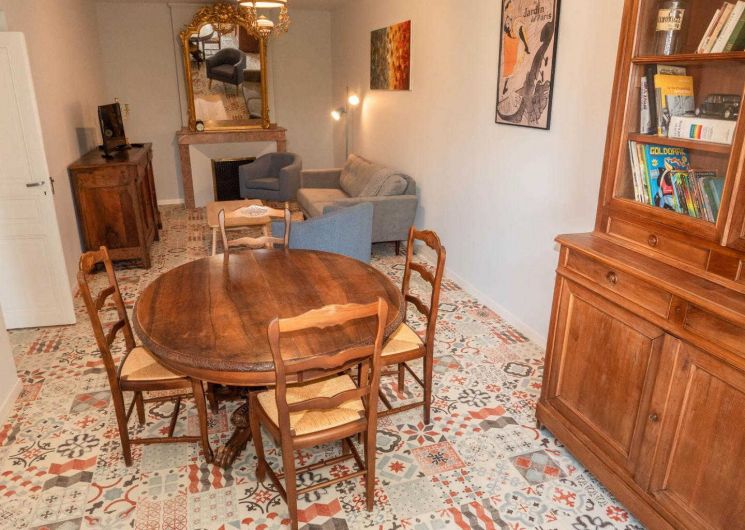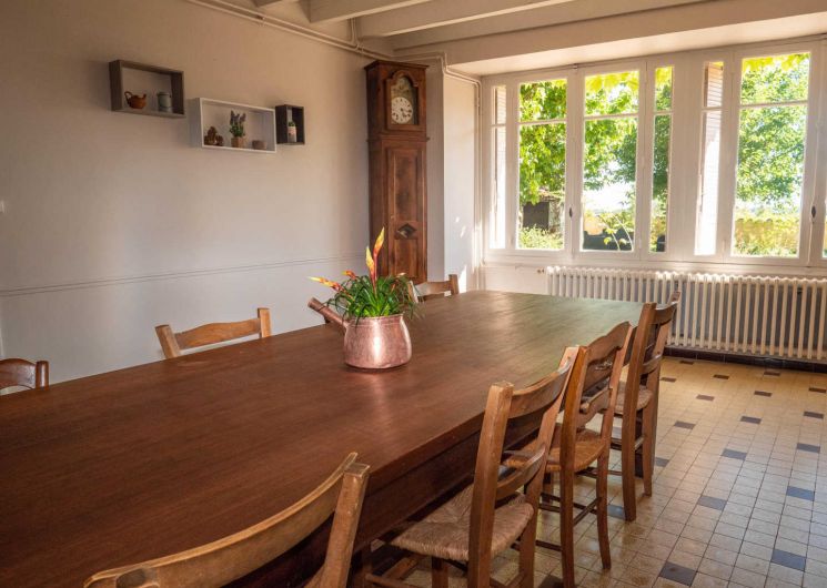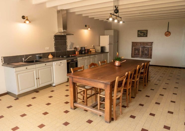 – A votre droite, une très grande cuisine/salle à manger dans laquelle vous pourrez partager vos repas autour d’une belle table en bois. En suivant, un salon avec télévision et jeux de sociétés.