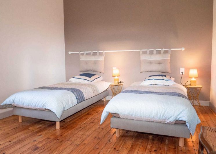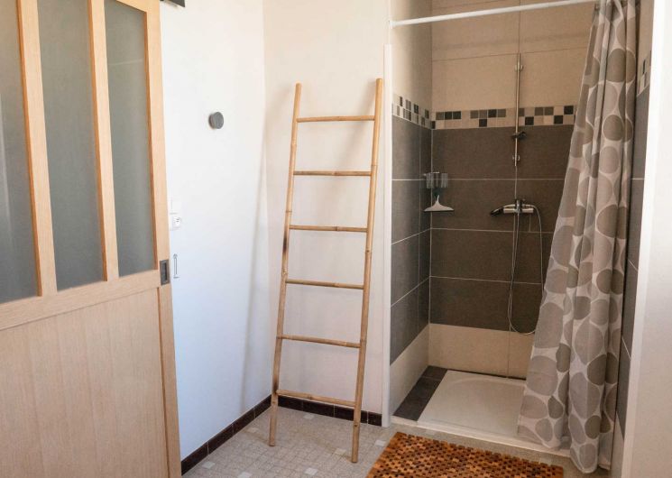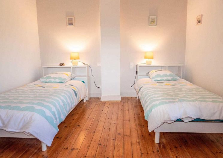 – A l’étage, se trouvent 3 chambres, une salle d’eau et un wc indépendant. Baignée de lumière, la première chambre offre un très beau volume avec son plafond à la française et lit en 160x200cm. Deux autres chambres proposent deux lits simples en 90cm, idéal pour des enfants.