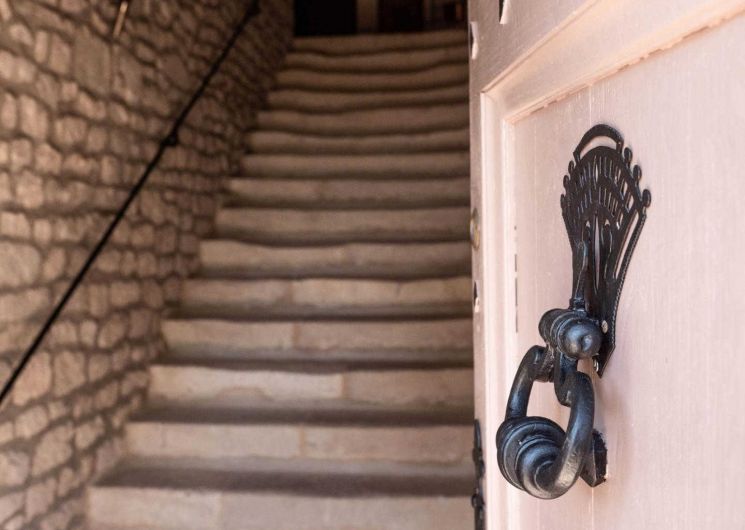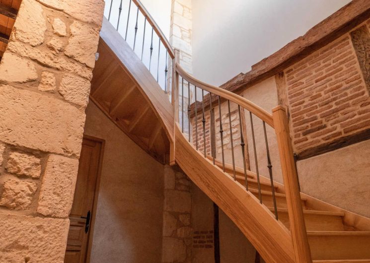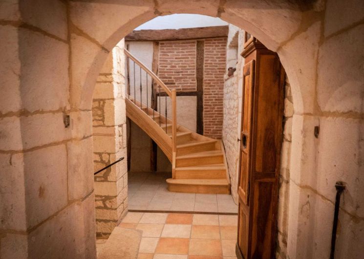 En entrant, vous faites face à un majestueux escalier en pierre aux marches usées par les siècles.