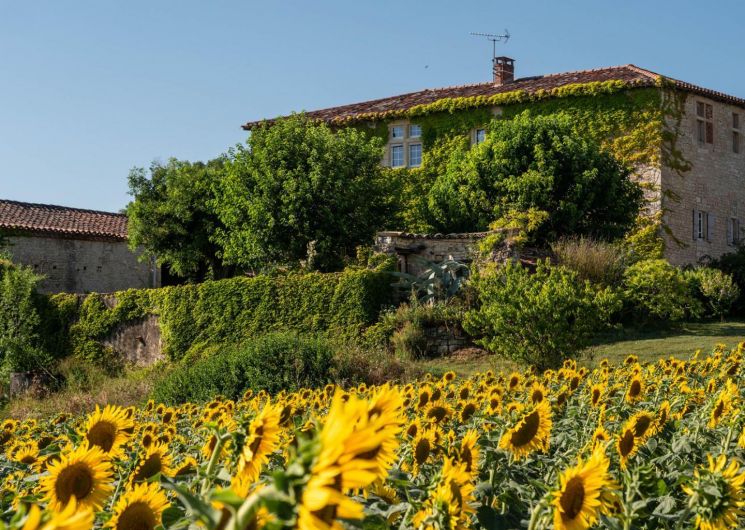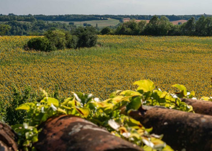 Maison indépendante qui surplombe les champs de céréales ou de tournesol.
