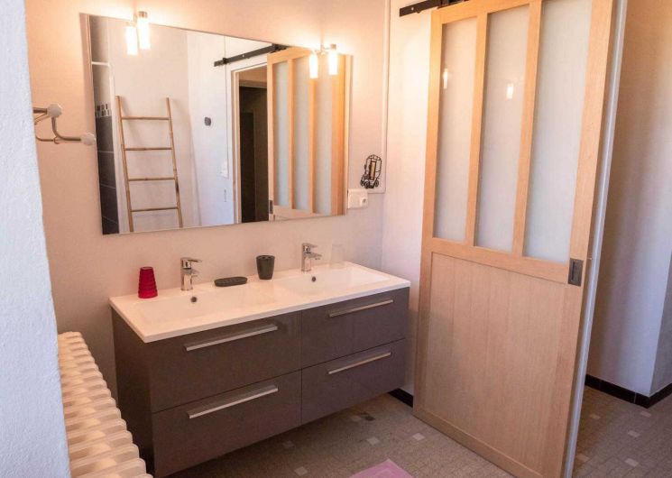 – A votre gauche, un lave-linge et une salle d’eau avec wc et vasque.
