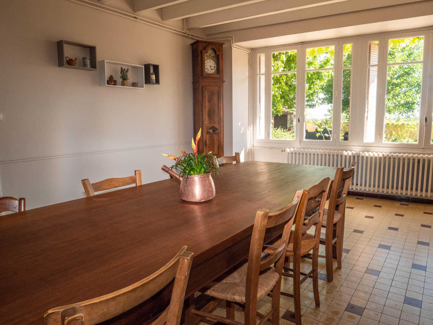 – A votre droite, une très grande cuisine/salle à manger dans laquelle vous pourrez partager vos repas autour d’une belle table en bois. En suivant, un salon avec télévision et jeux de sociétés.