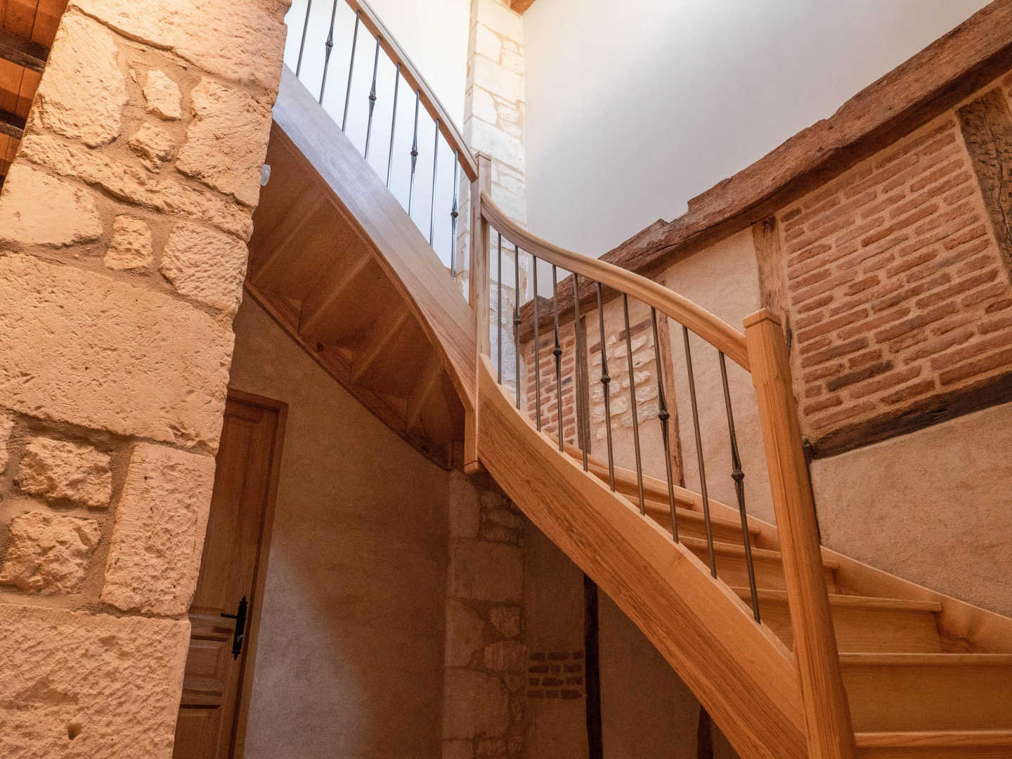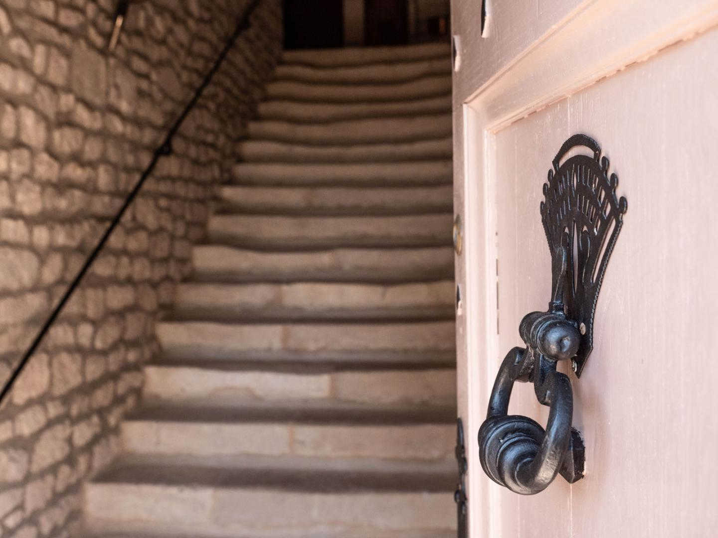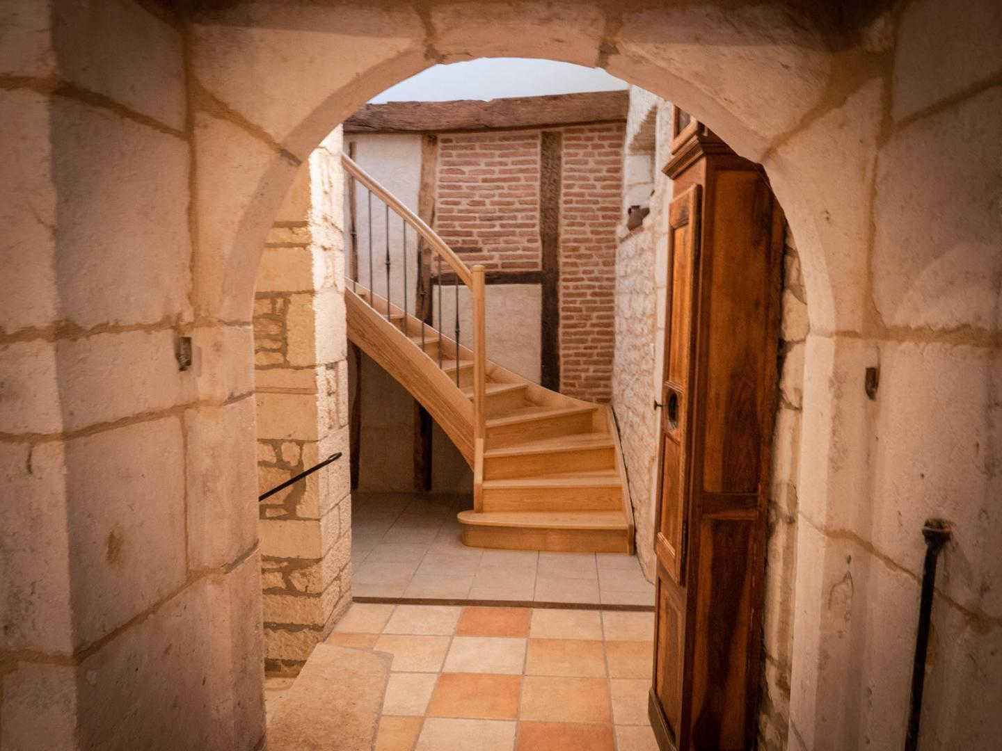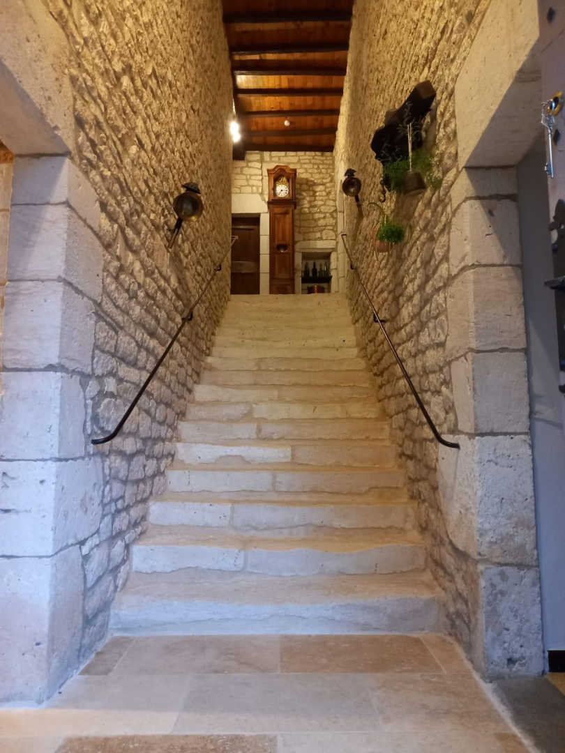 En entrant, vous faites face à un majestueux escalier en pierre aux marches usées par les siècles.