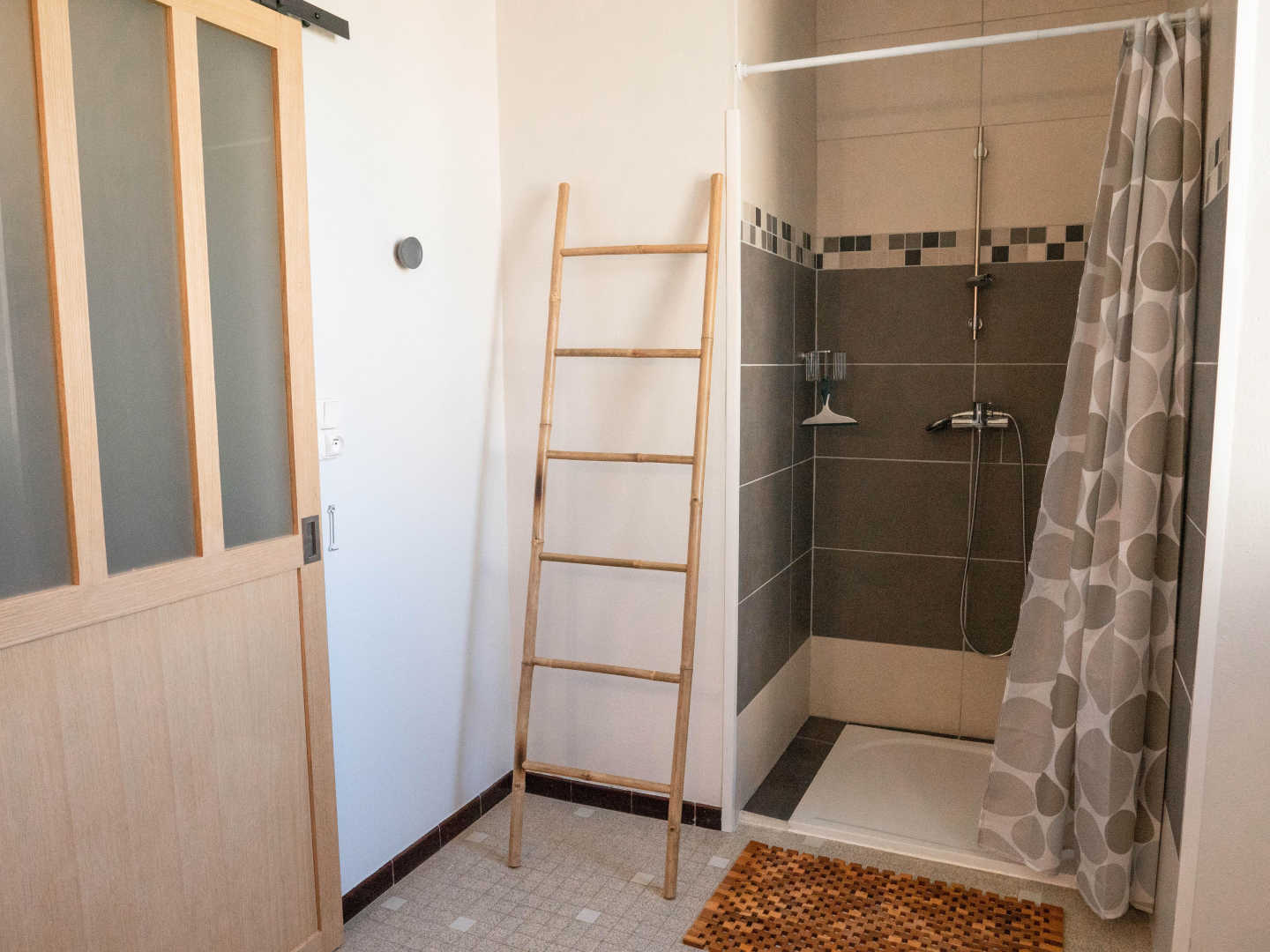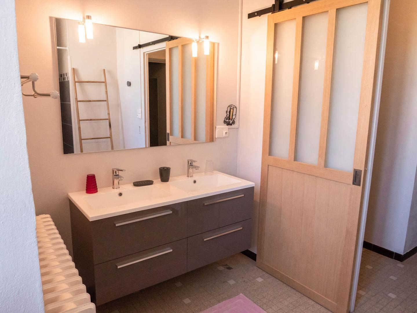 – A votre gauche, un lave-linge et une salle d’eau avec wc et vasque.