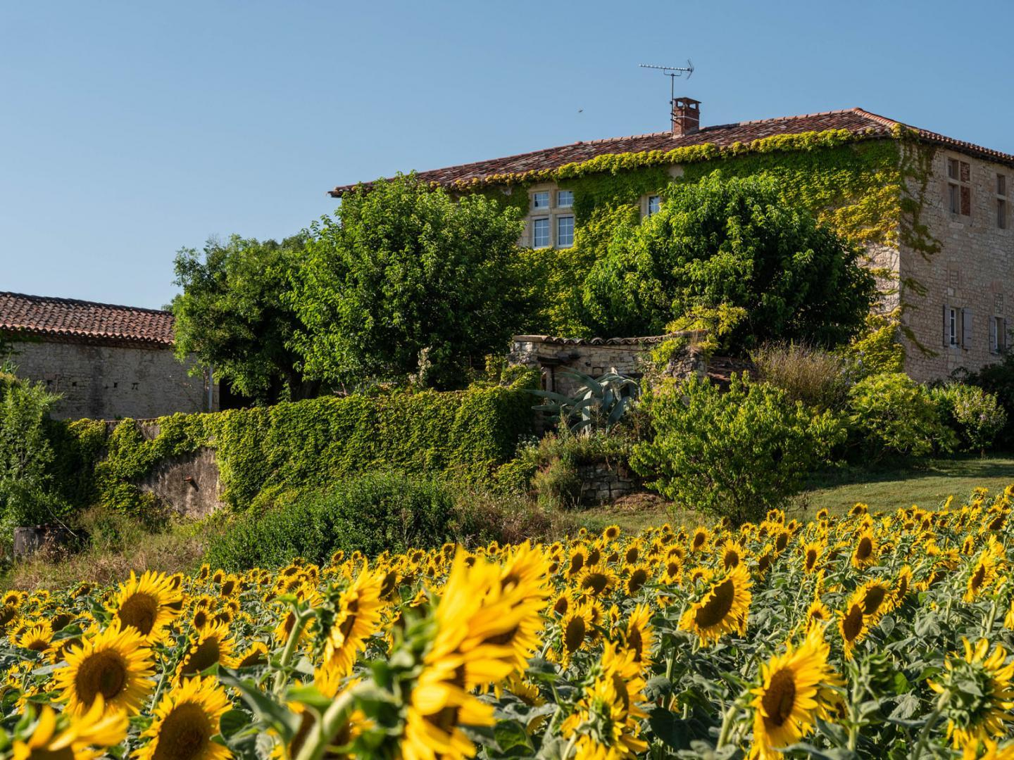 Maison indépendante qui surplombe les champs de céréales ou de tournesol.