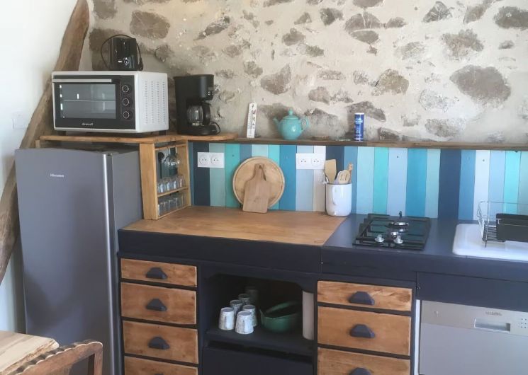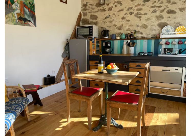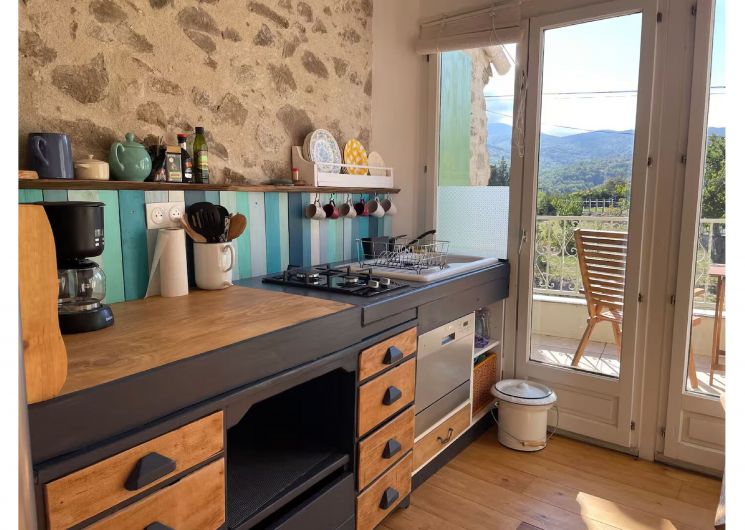 Une charmante petite maison pour 2 personnes, à l’orée du paisible village de Rabouillet dans les Pyrénées Orientales. Une terrasse avec une vue imprenable sur les collines environnantes. Des randonnées et des promenades sont possibles directement depuis la maison. Quelle que soit la saison, c’est l’endroit idéal pour se ressourcer et se déconnecter de l’agitation de la vie quotidienne ! Les planchers en bois et les murs en pierre ajoutent au charme de ce petit bijou de maison. Le poêle à bois garantit des soirées d’hiver douillettes ! Le rez-de-chaussée (25 m2) comprend une chambre avec un lit double, une salle de bains avec douche et un poêle à bois. La maison est joliment décorée avec du parquet, des murs en pierre et un magnifique escalier en bois fabriqué à la main. Cet escalier mène au premier étage et à la cuisine/salle à manger/salon. De grandes portes-fenêtres donnent sur la terrasse, ombragée jusqu’en début d’après-midi, et sa vue sur les collines environnantes.