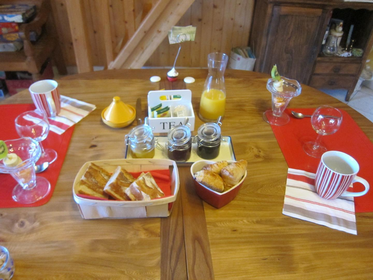 Un petit déjeuner vous sera servi avec des pains frais variés et des produits faits maison, comme des confitures, des yaourts, du miel, des brochettes de fruits selon la saison, des oeufs à la coque (notre poulailler) sur demande ou d’autres spécialités locales.