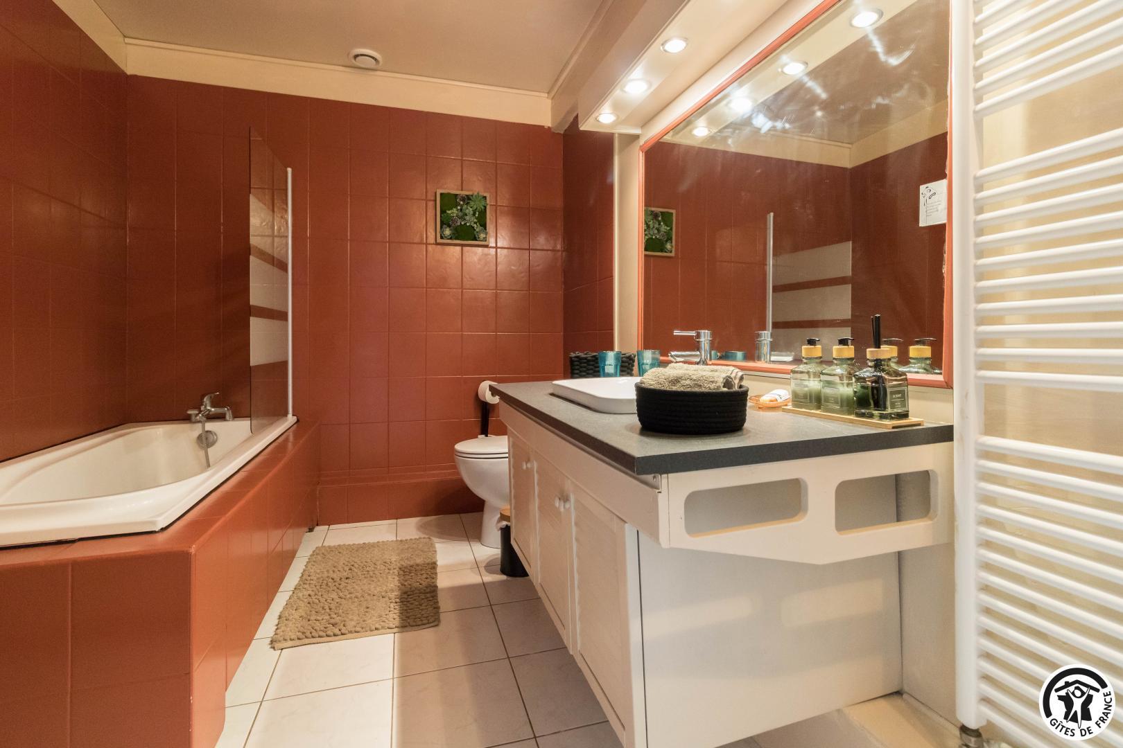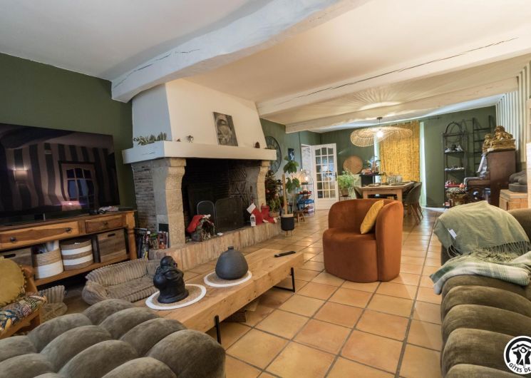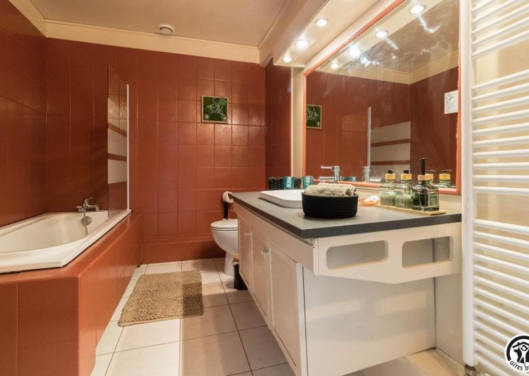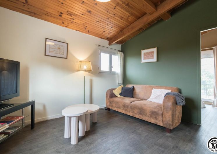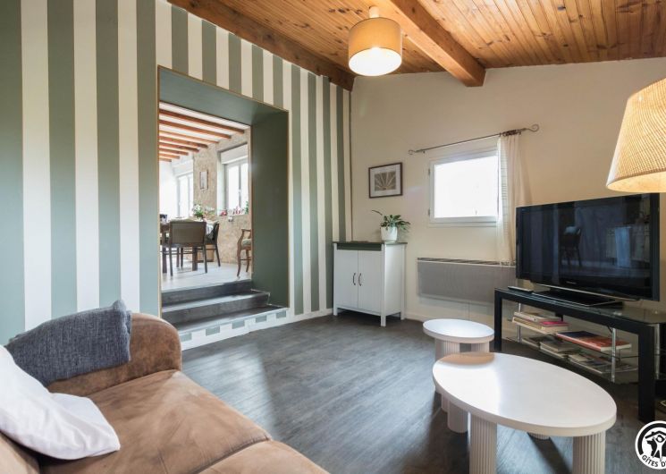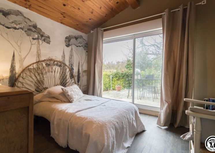 La suite se compose de deux chambres communicantes (1 lit 140 cm et 1 lit 90 cm), d’un petit salon privatif, d’une cuisine/salle à manger et d’une salle de bains avec WC. Entrée principale par le couloir des propriétaires, autre entrée possible par la cuisine, ouverte sur la terrasse.