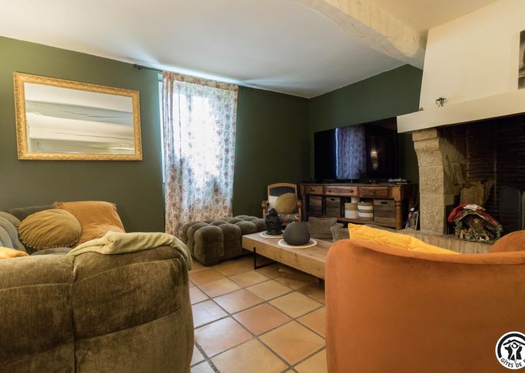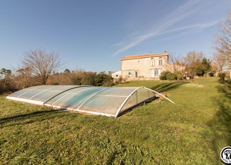 Grand jardin non clos de 5000 m², terrasse plein sud sous pergola, vue sur la campagne. Piscine 11 × 6 m partagée selon règlement intérieur.