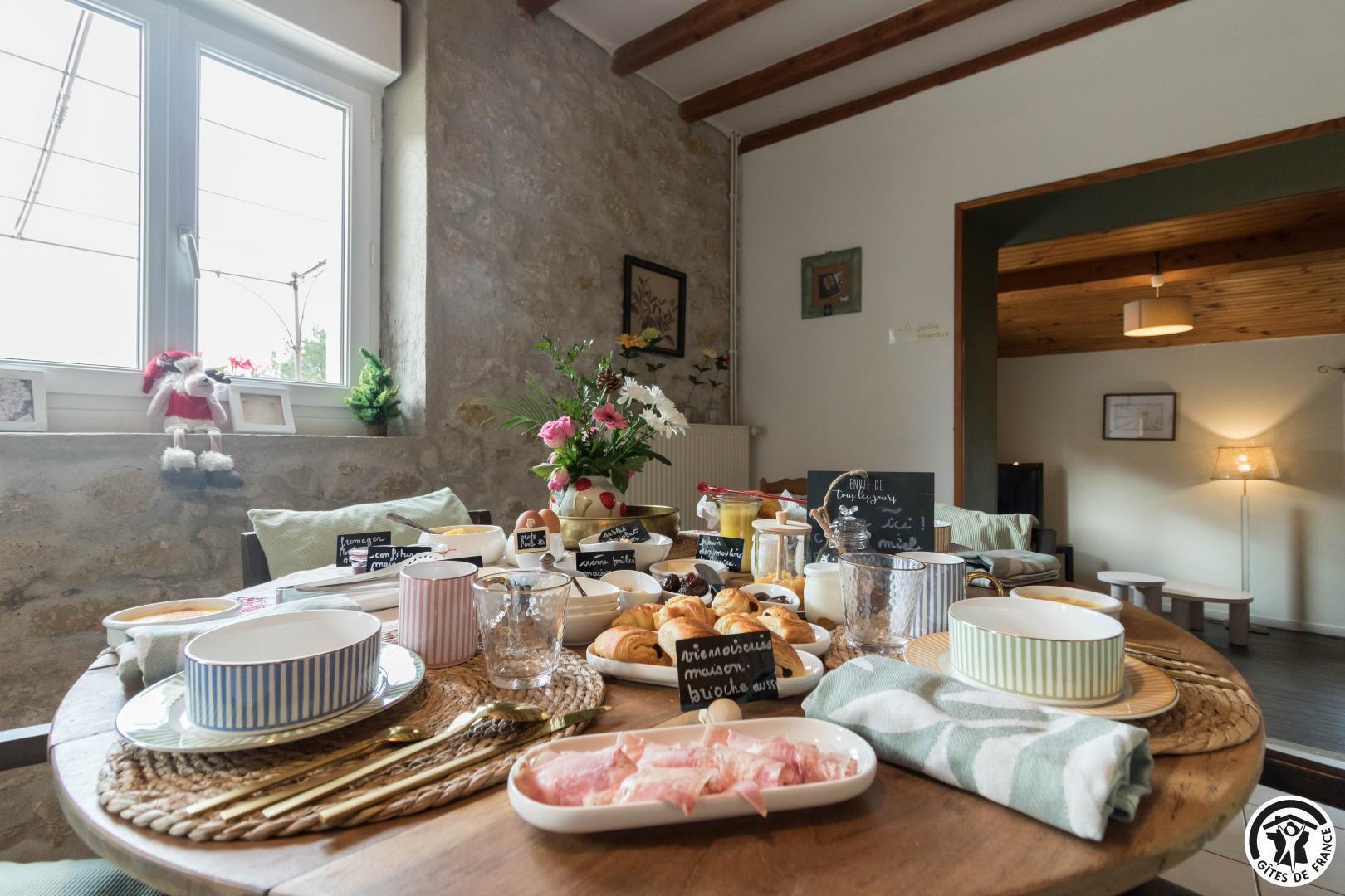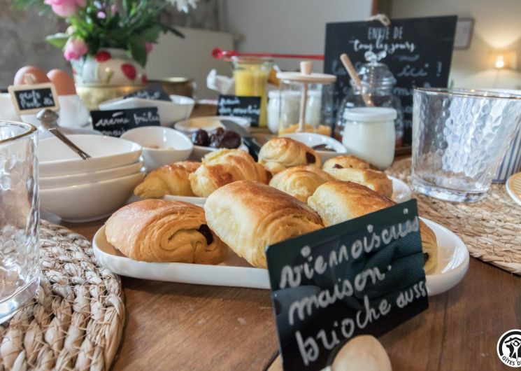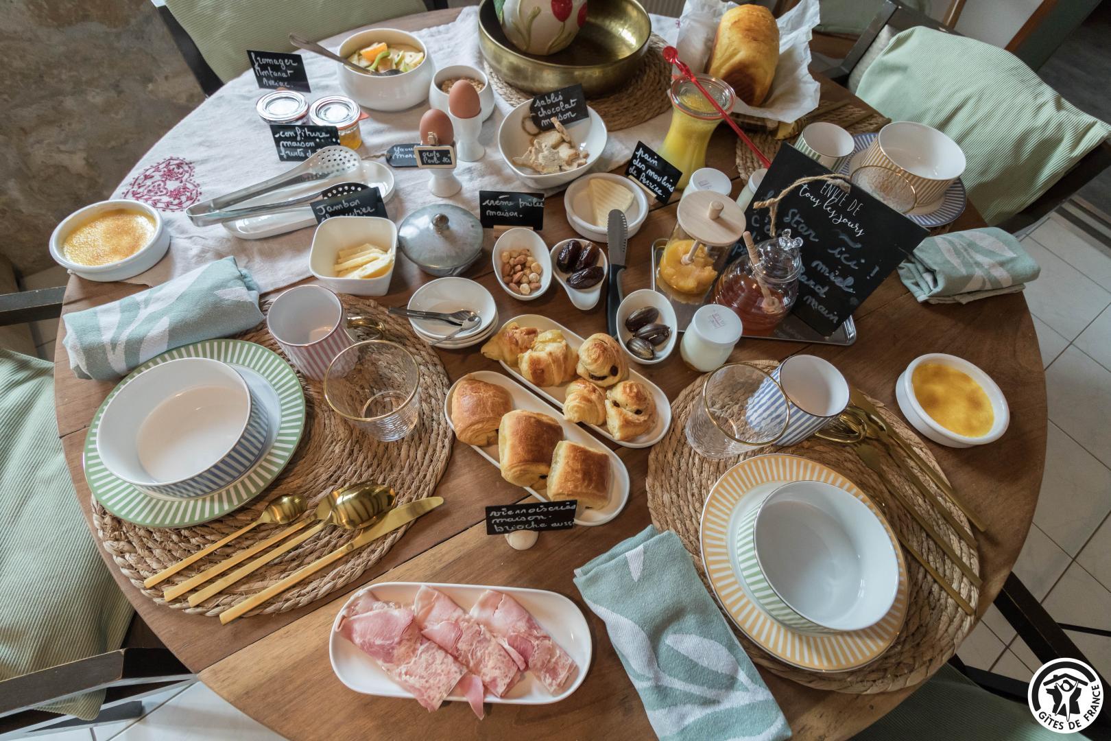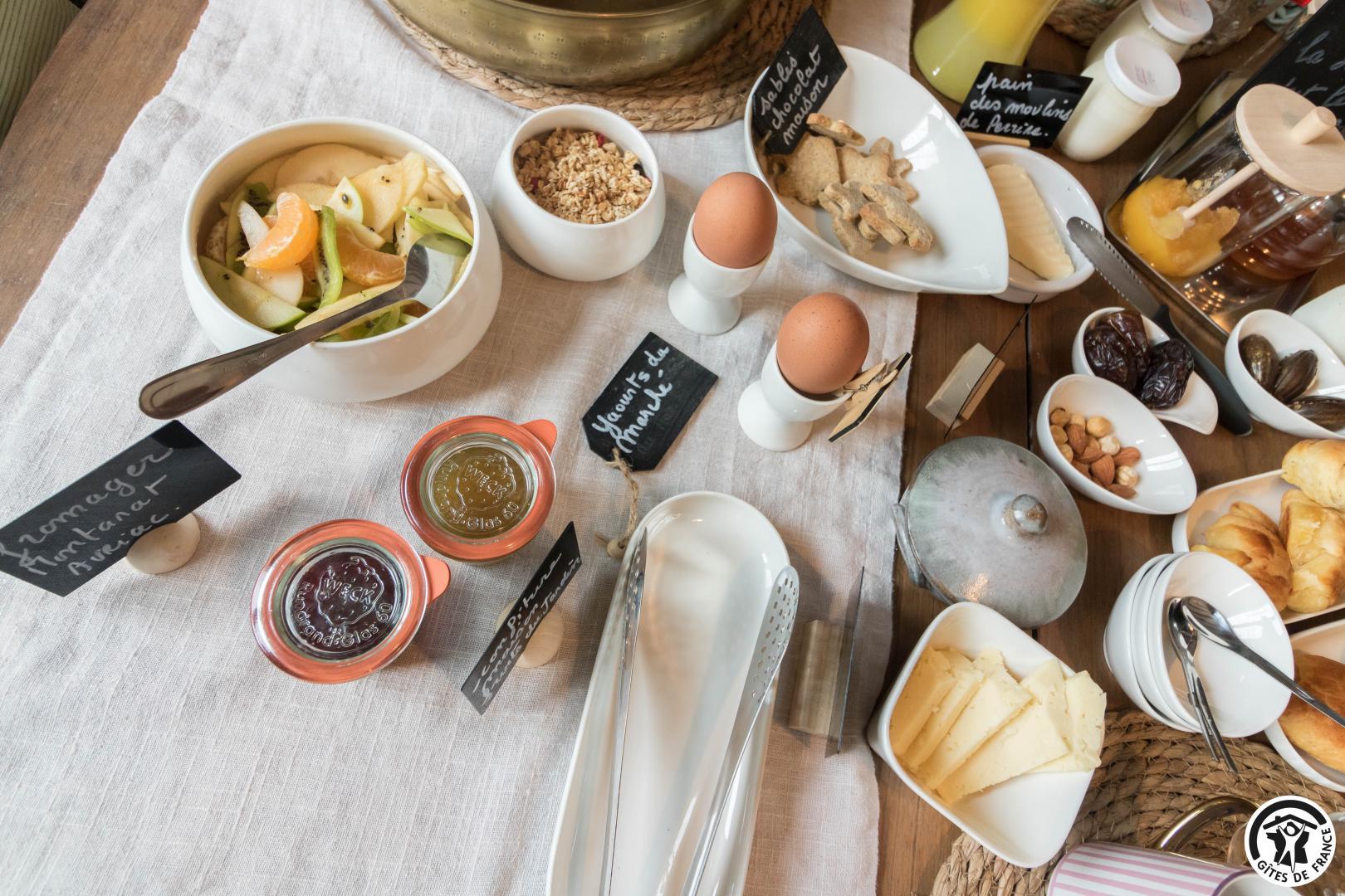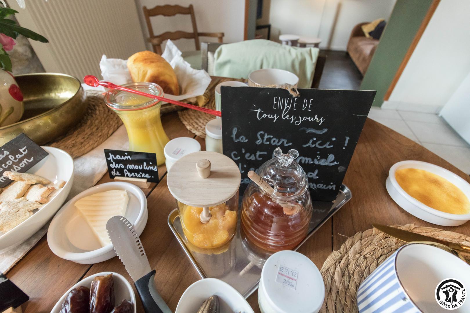 Chaque matin, un petit-déjeuner gourmand, préparé avec des produits locaux et de saison, vous est servi. Sur réservation, nous proposons également une table d’hôtes conviviale, autour de recettes du terroir et de produits frais sélectionnés avec soin.
