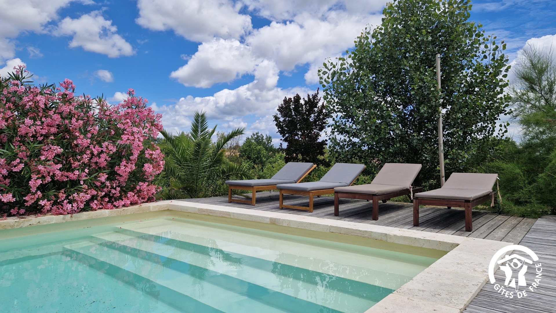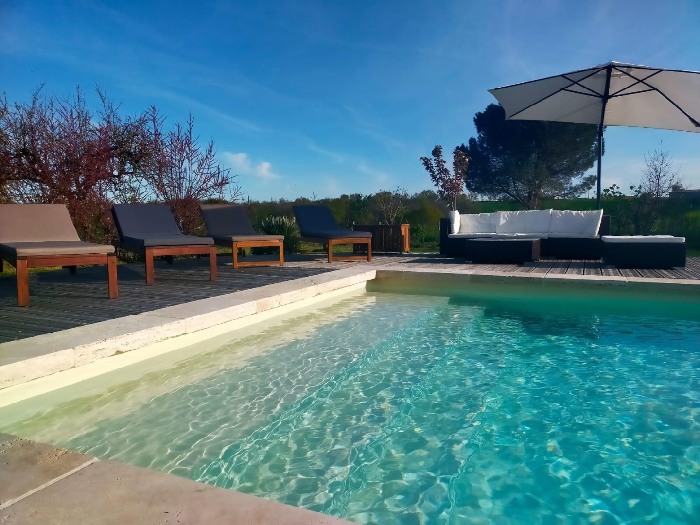 Piscine au sel avec marche plage. Dimensions : 9x4m, clôturée avec barrière, transats.