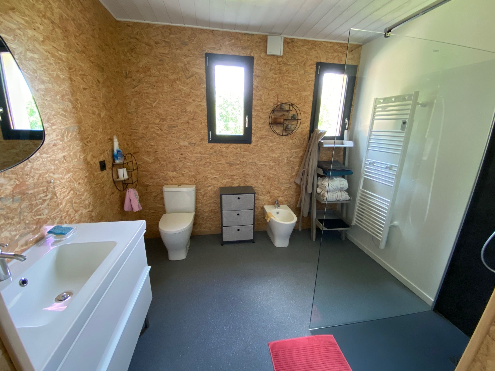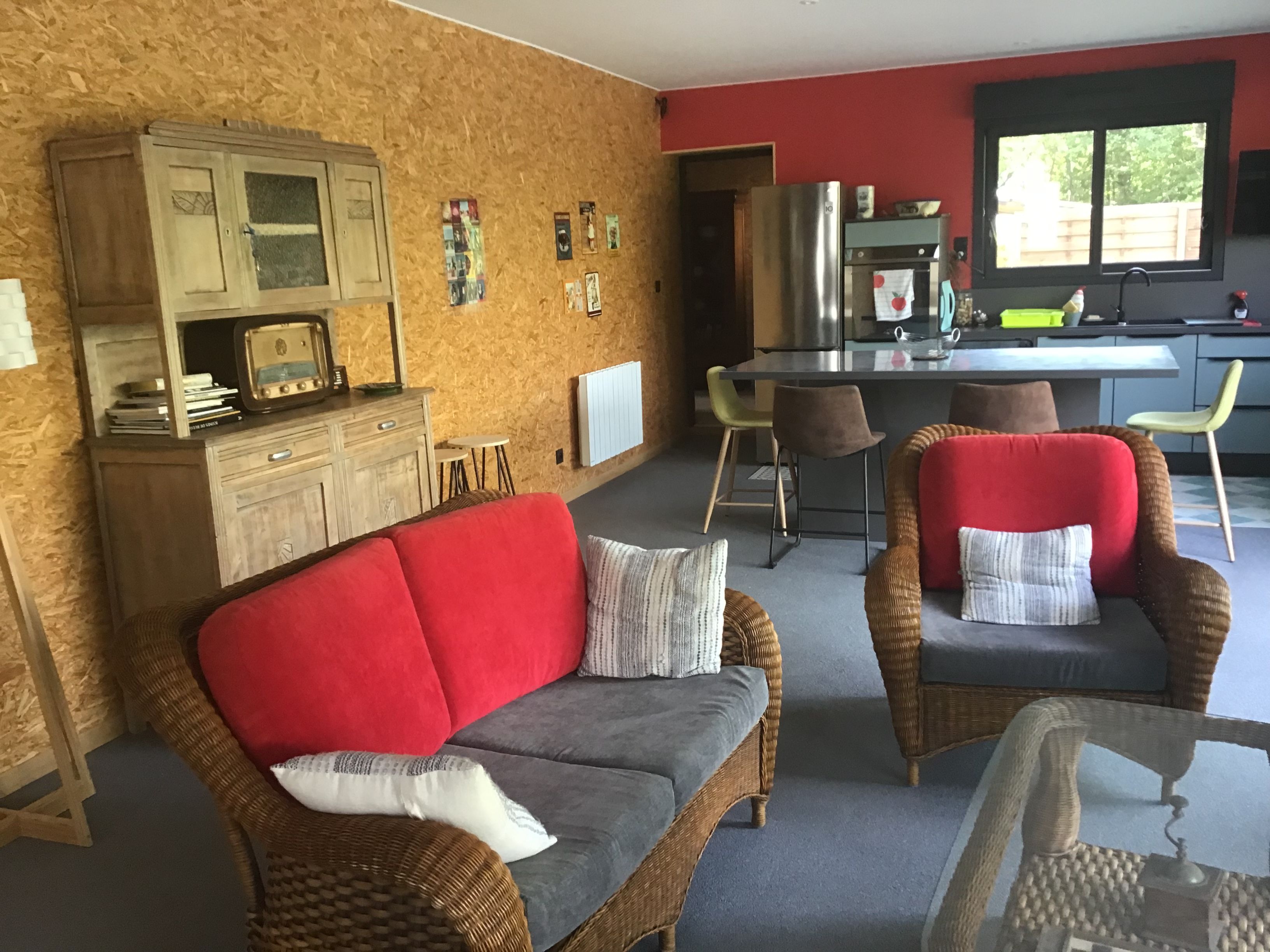Le logement comprend une pièce à vivre avec salon et cuisine de 50m2 (poêle à bois, 1 canapé, 2 fauteuils, table basse,un bureau), une cuisine intégrée (lave-vaisselle, four, réfrigérateur,congélateur ). Une petite marche pour accéder à la partie nuit, une salle d’eau spacieuse avec wc, 1 ch (1 lit 140), 1 ch (1 lit 160), 1 ch (2x 0,90). Une buanderie équipée . Chauffage électrique.Terrasse avec salon de jardin et 6 bains de soleil. Barbecue mobile. Espace vert privé devant la terrasse.Logement avec très bons ventilateurs.