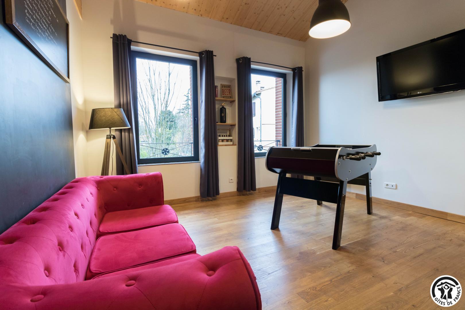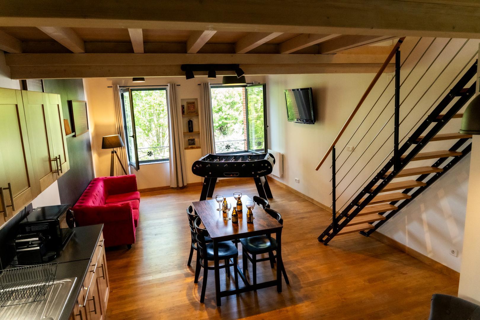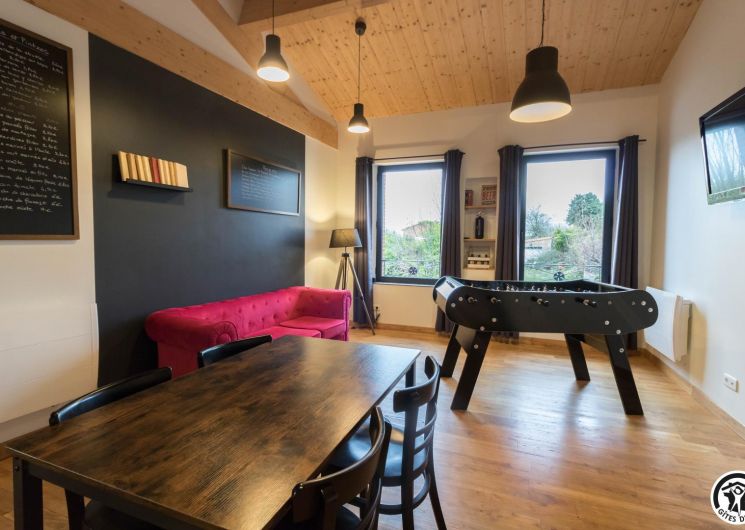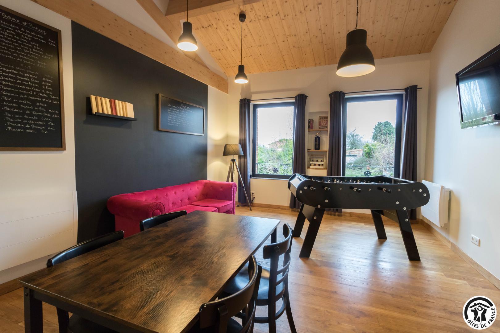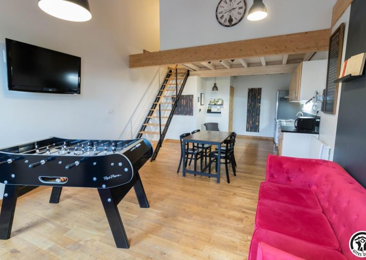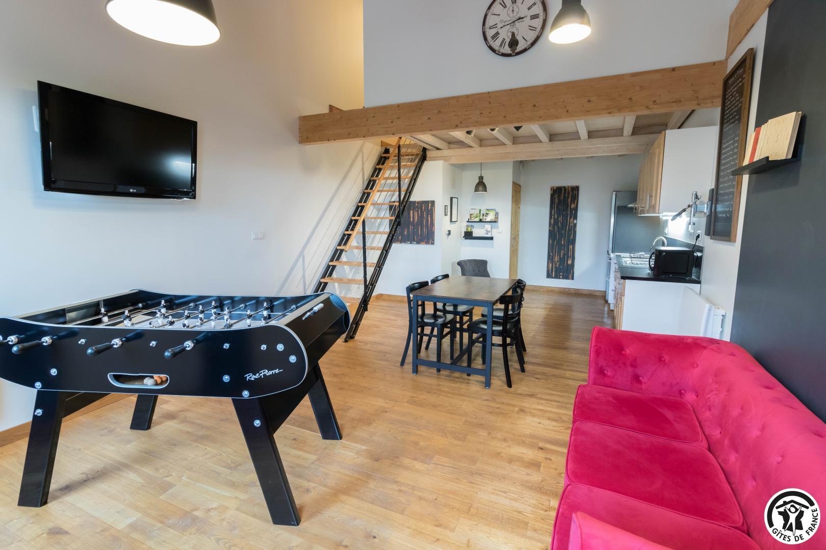 Premier étage : grand séjour lumineux avec baby-foot et TV grand écran, avec une partie cuisine.
