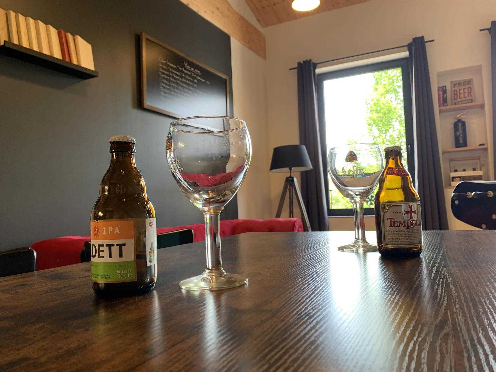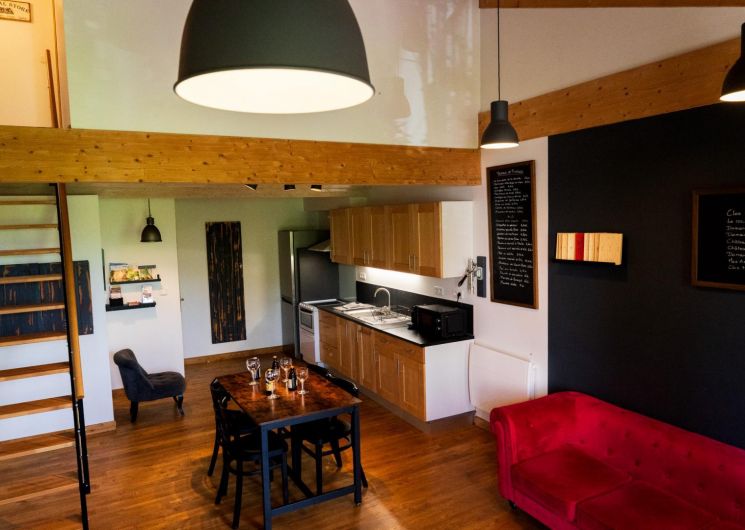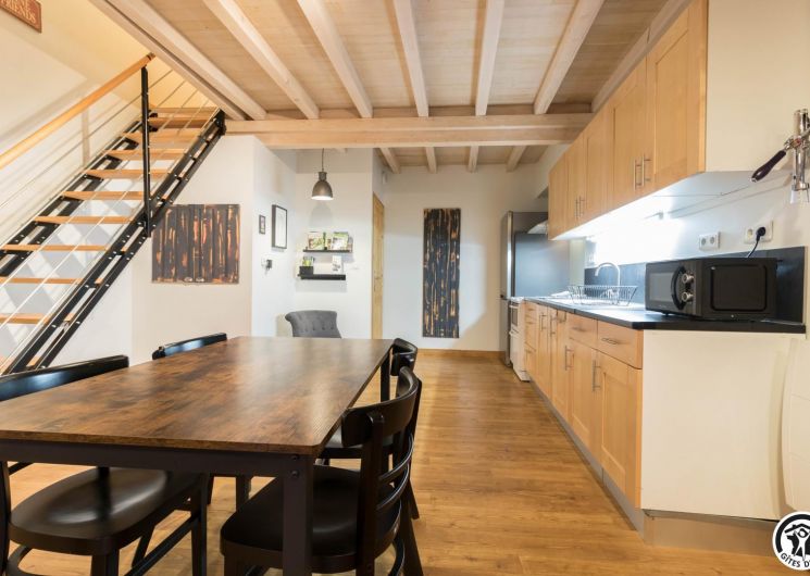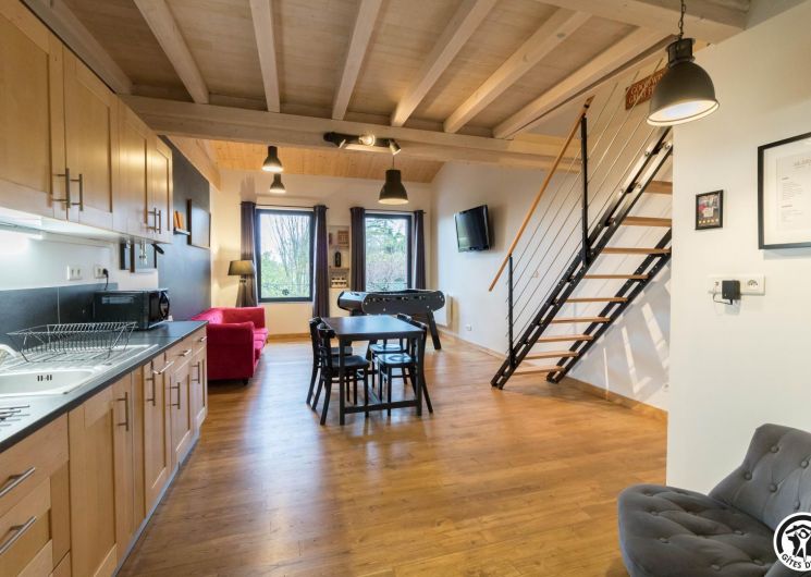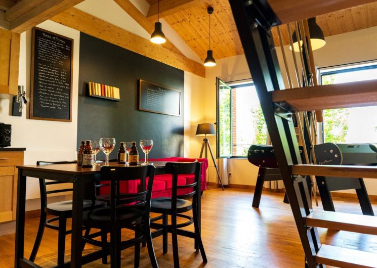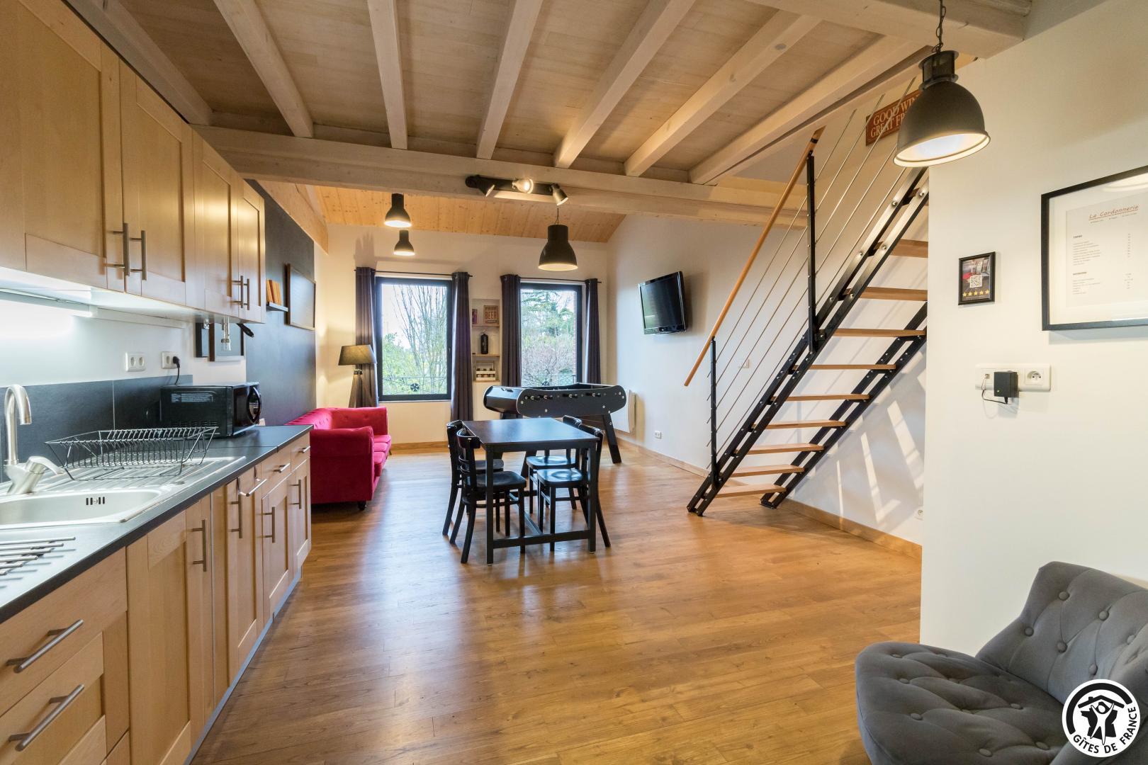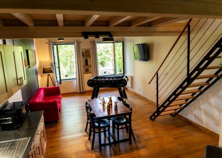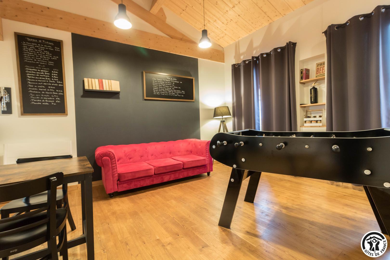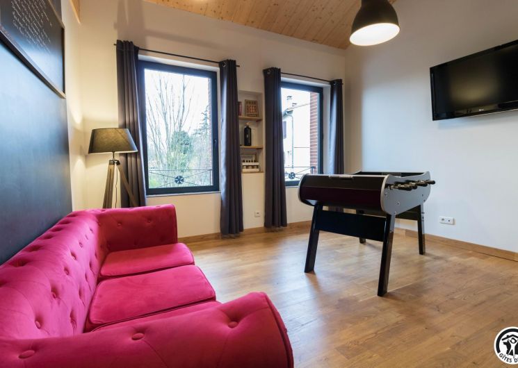 Premier étage : grand séjour lumineux avec baby-foot et TV grand écran, avec une partie cuisine.