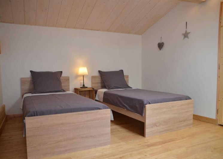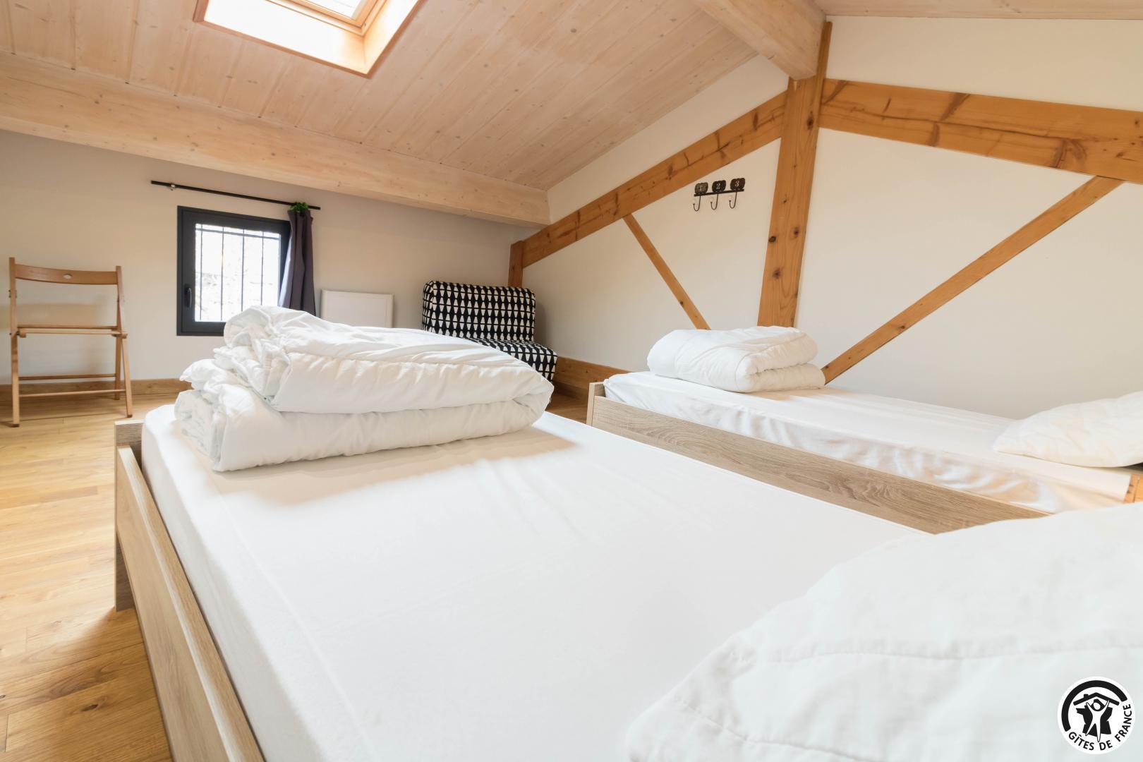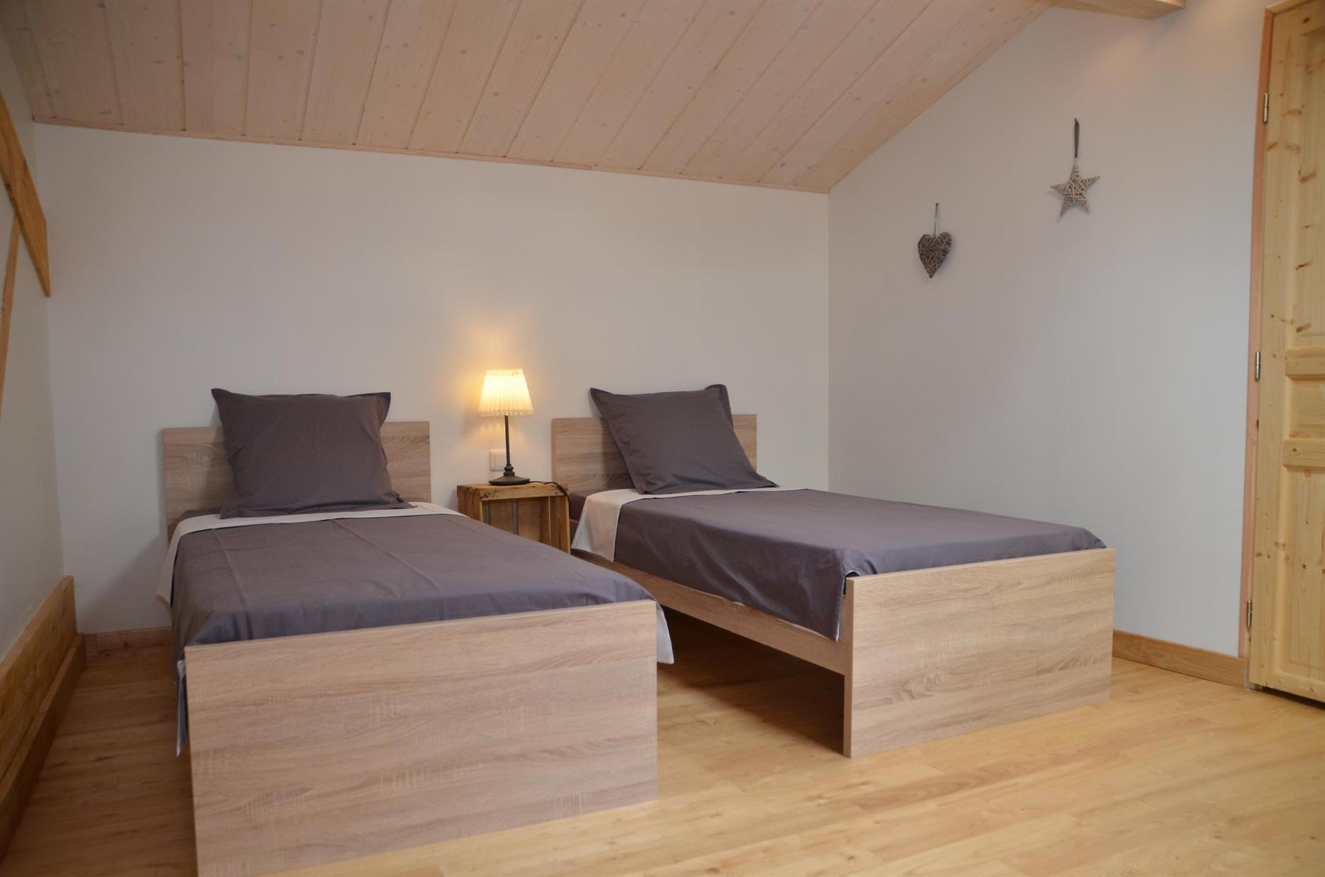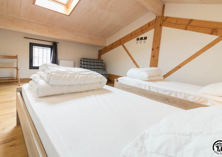Deuxième étage : chambre twin (2 lits 1 personne en 90×190) et un lit d’appoint en 90×190. Chauffage électrique.
