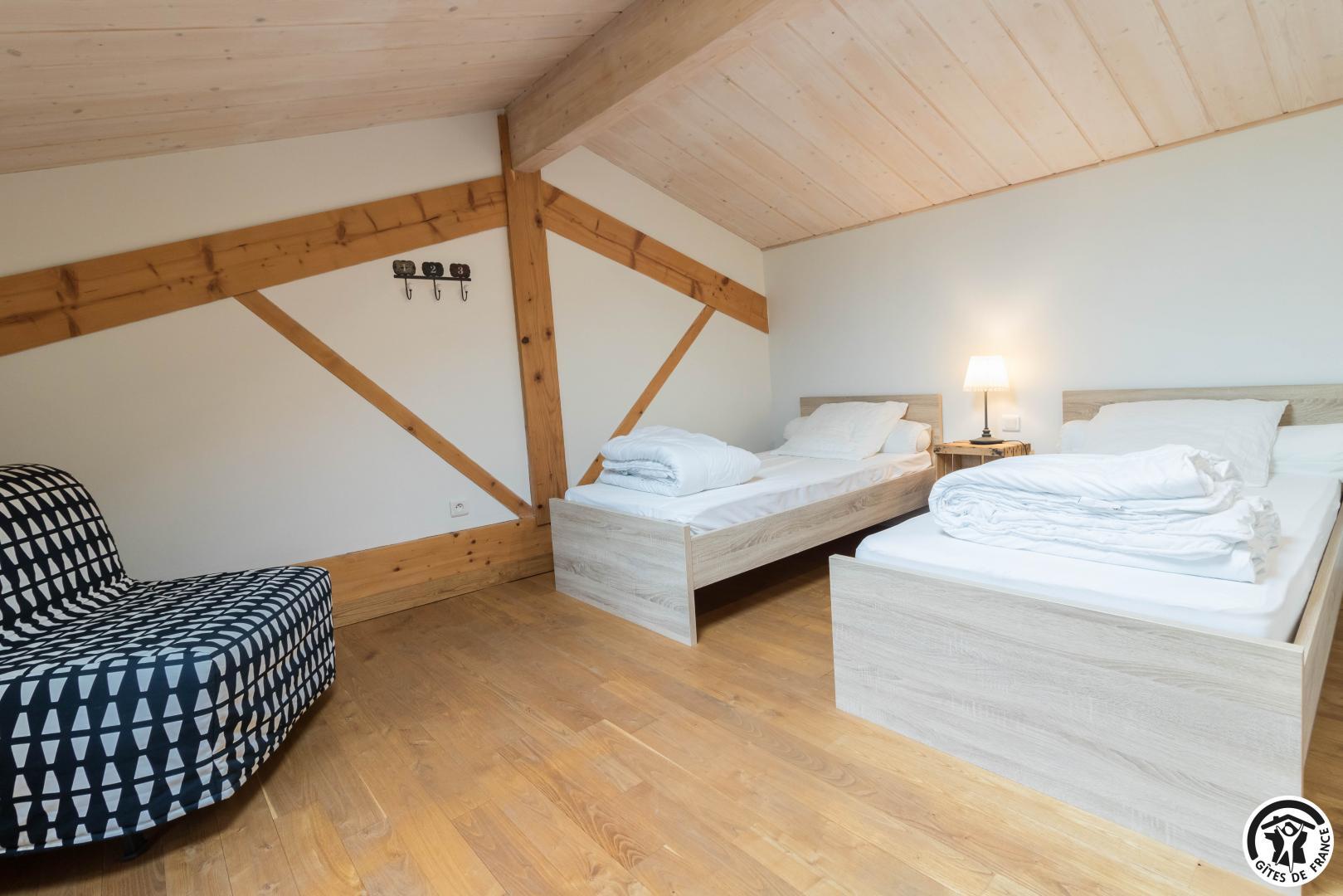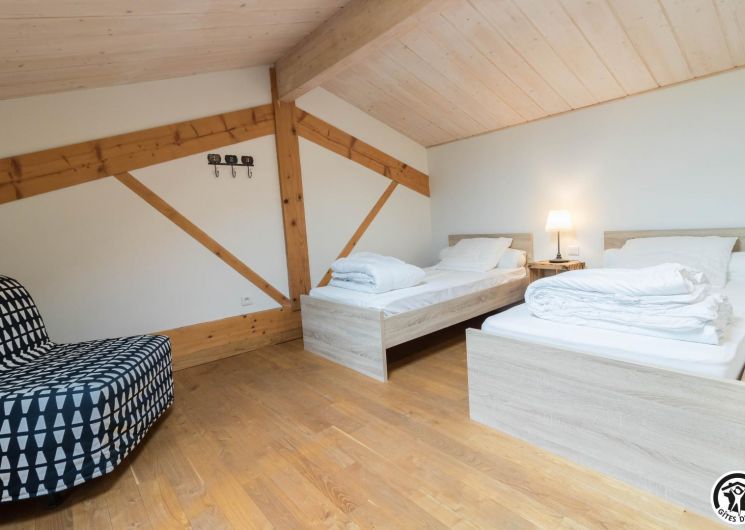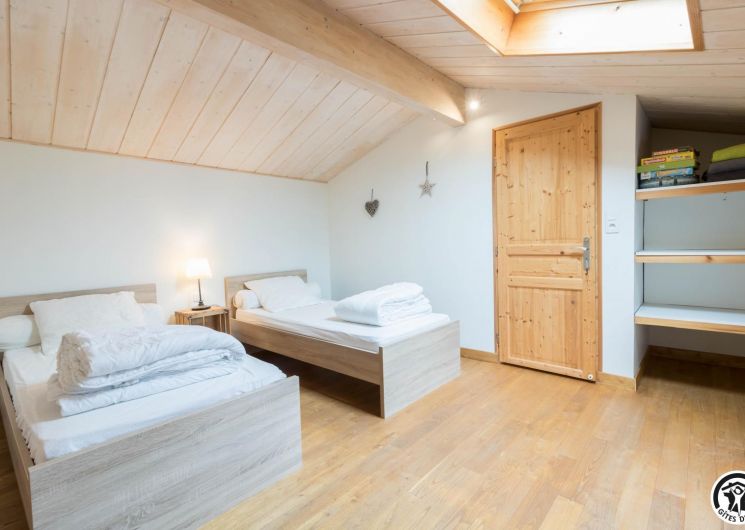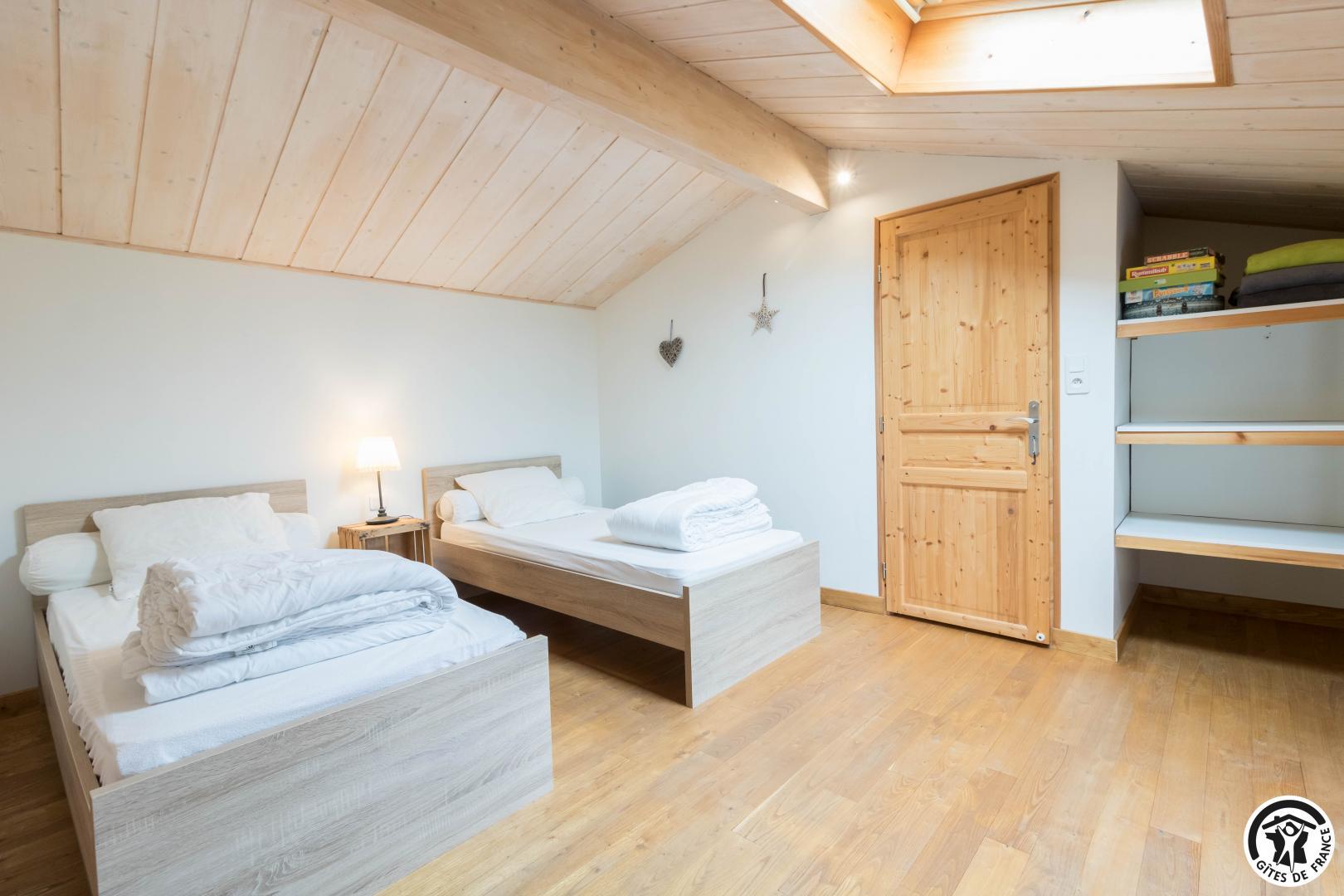 Deuxième étage : chambre twin (2 lits 1 personne en 90×190) et un lit d’appoint en 90×190. Chauffage électrique.