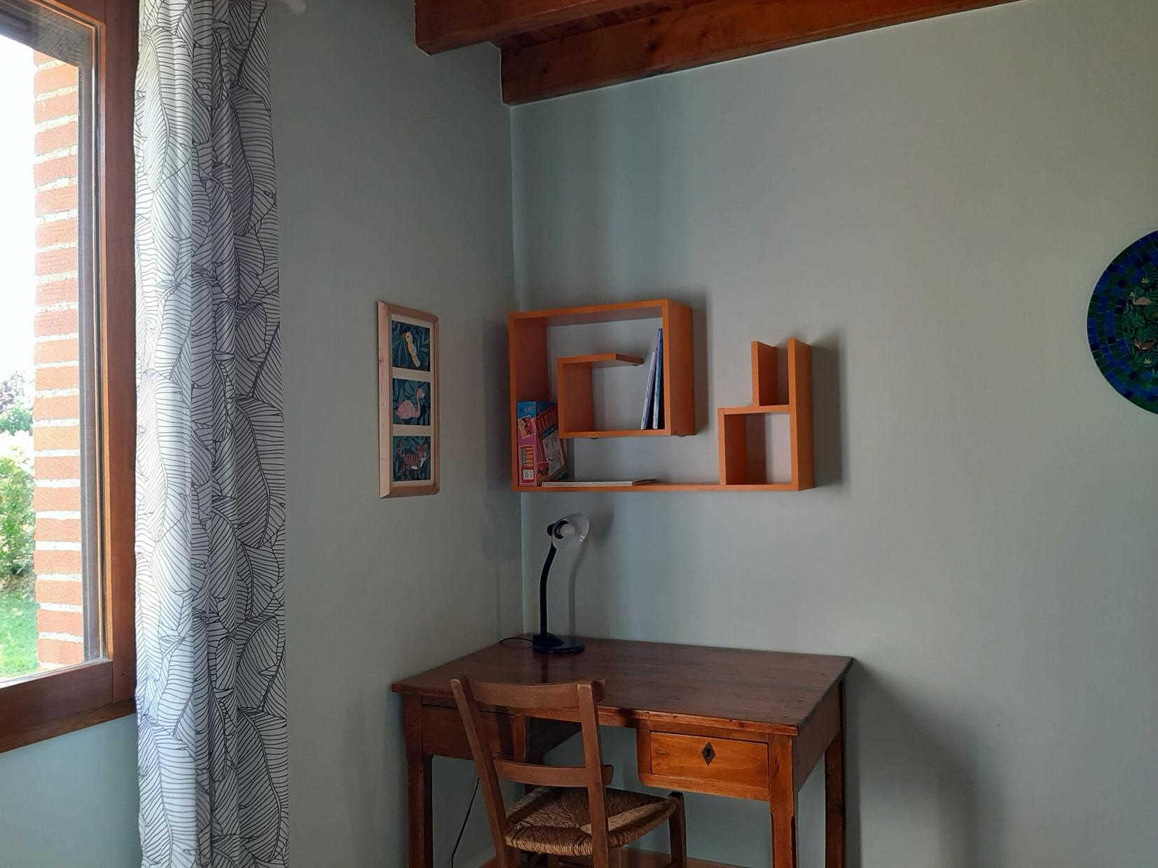 TELETRAVAIL : mise à disposition d’un bureau, d’une lampe (proximité d’une prise électrique pour le branchement d’un ordinateur portable, rallonge et prise multiple sur demande), connexion Internet fibre (opérateur : Orange).