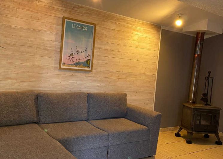 Séjour avec salon, TV et table à manger, en suivant la cuisine équipée. Après la cuisine, une petite salle permet d’accéder à une grande salle festive (comprise avec la location du gîte).