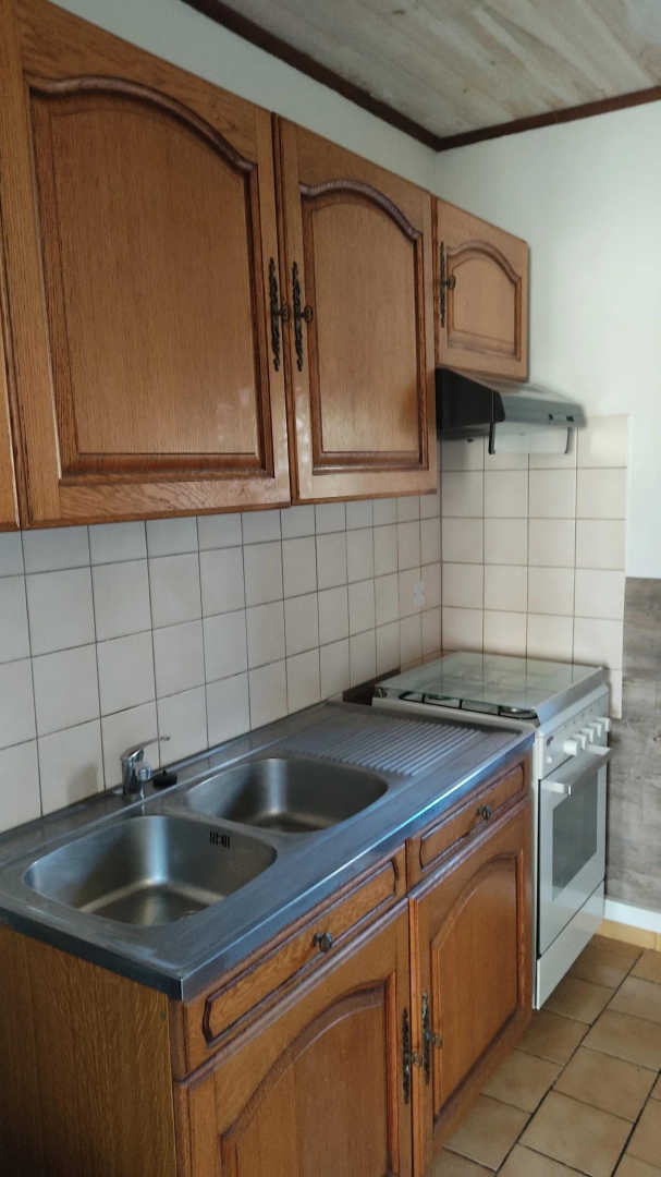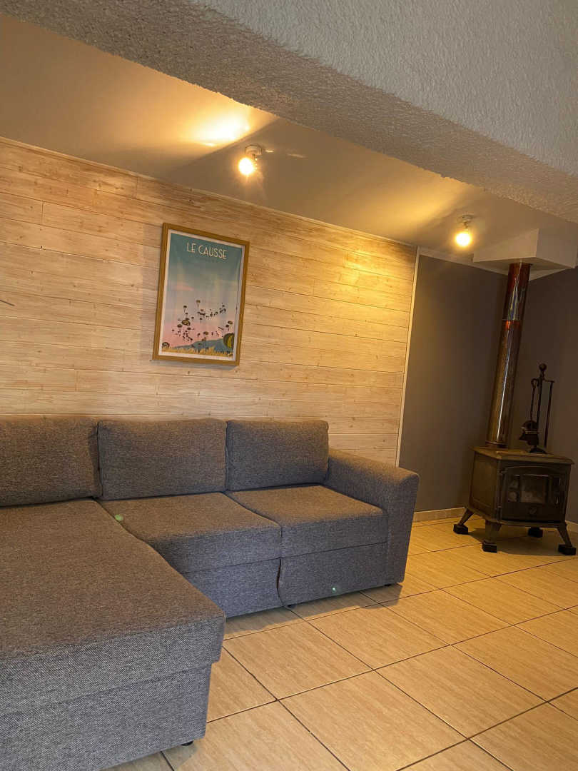Séjour avec salon, TV et table à manger, en suivant la cuisine équipée. Après la cuisine, une petite salle permet d’accéder à une grande salle festive (comprise avec la location du gîte).