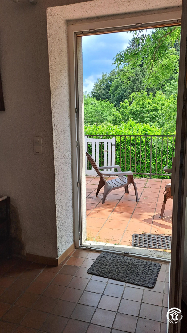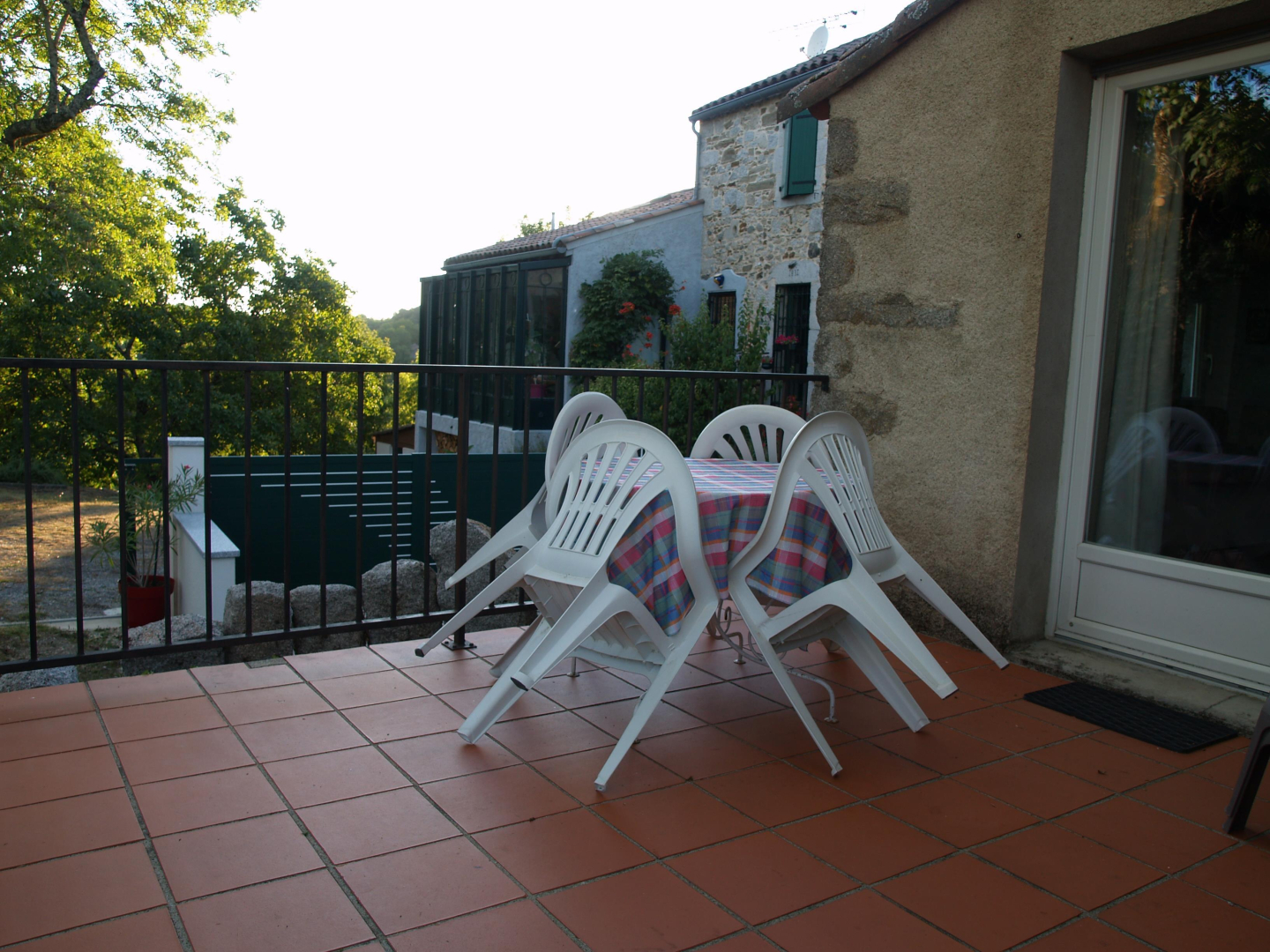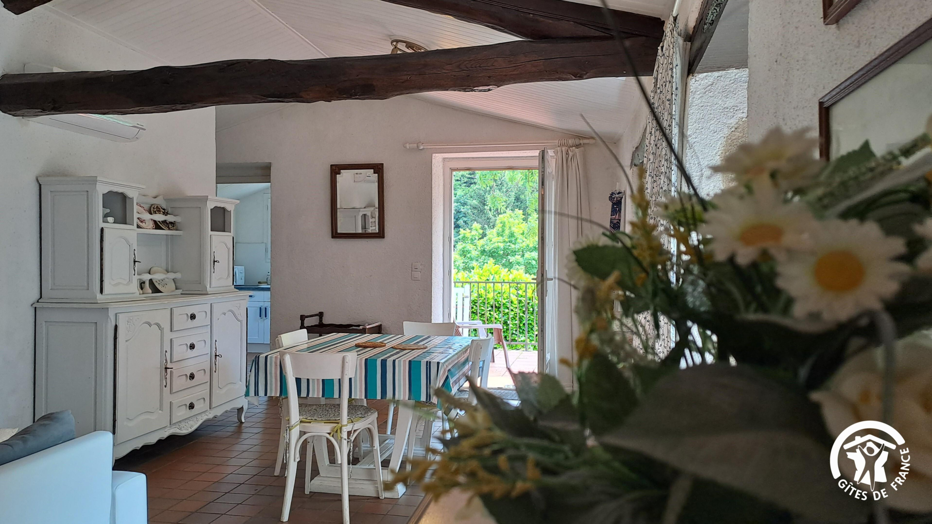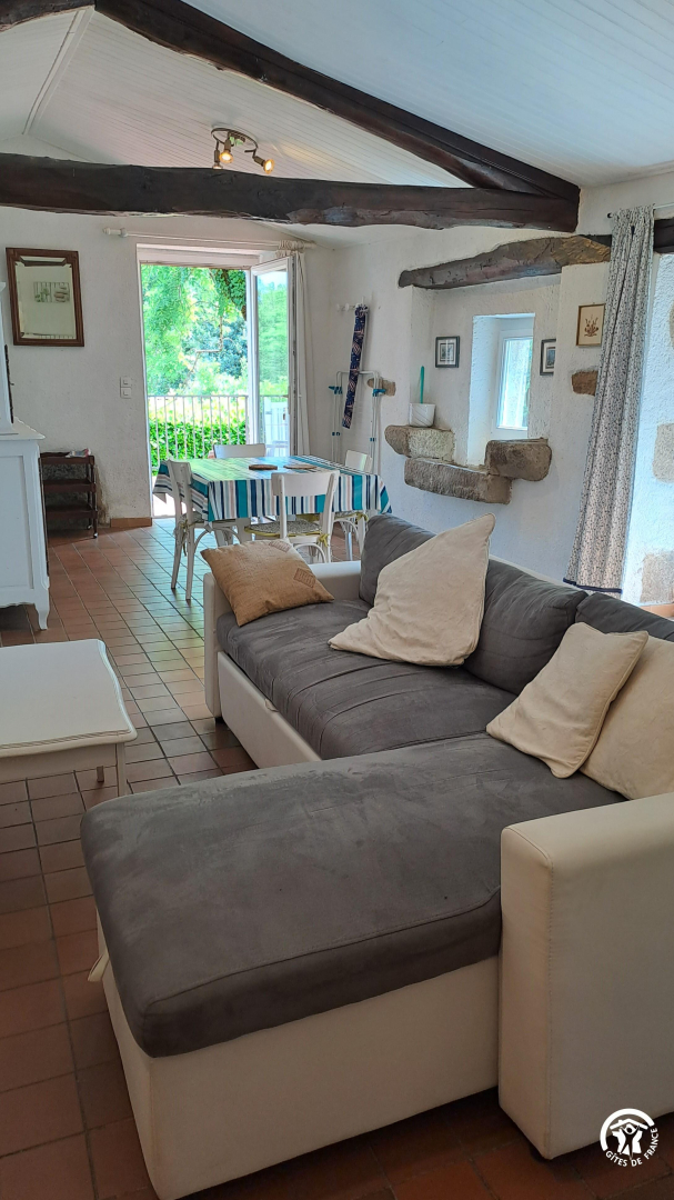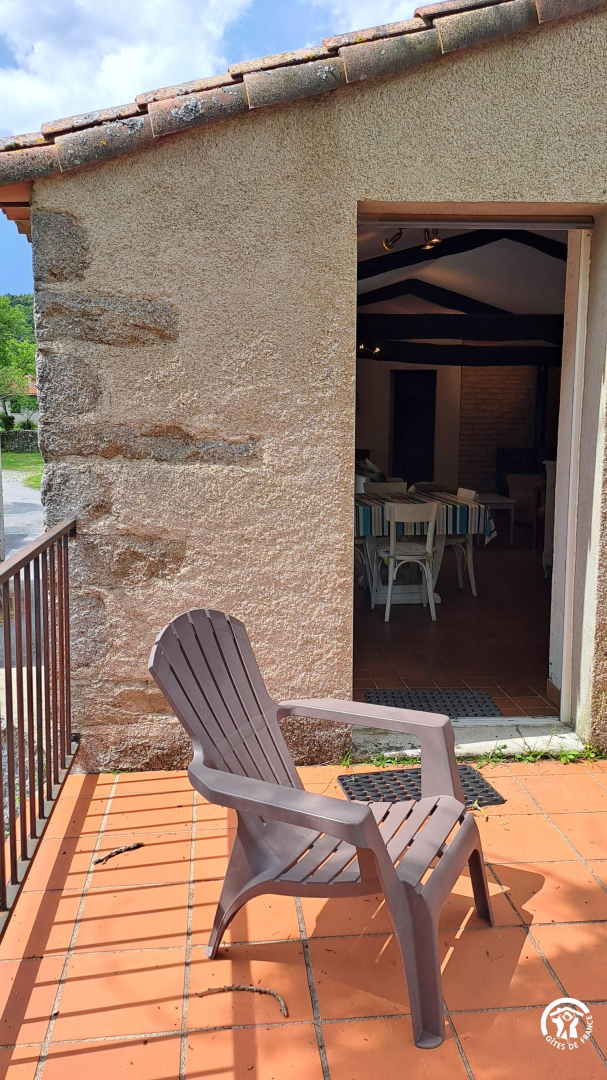Le gîte est aménagé dans une maison en pierre typique du hameau. On y accède par quelques marches qui mènent à une terrasse équipée pour les repas en plein air. L’intérieur, de plain-pied, est organisé autour d’une pièce de vie chaleureuse avec coin salon, TV connectée, salle à manger et poêle à bois pour les soirées fraîches. Une cuisine indépendante bien équipée, une salle d’eau et des WC complètent cet espace.