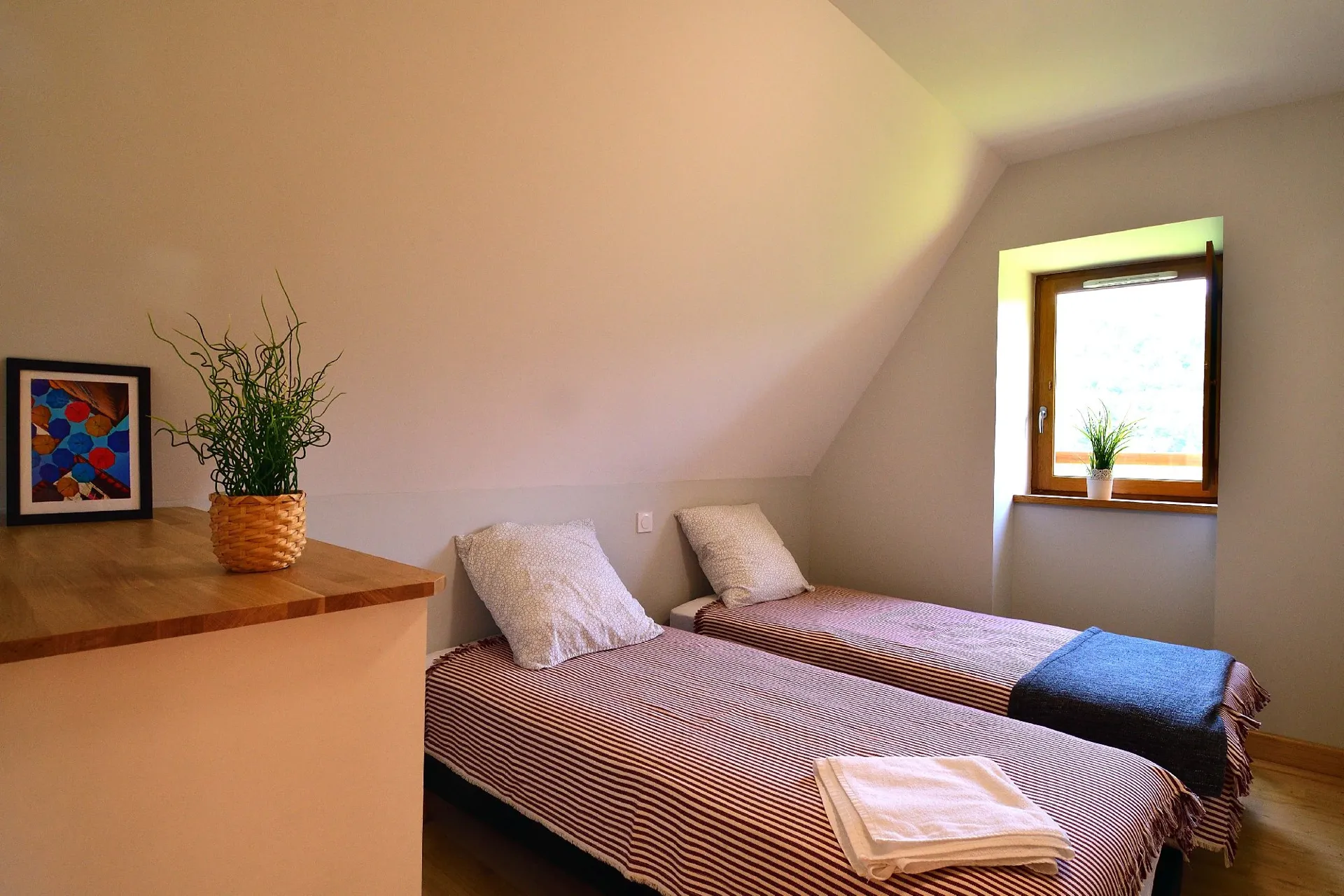 2 chambres avec un lit double (160) et 3 lits simples (90). Un canapé convertible pour 2 personnes.