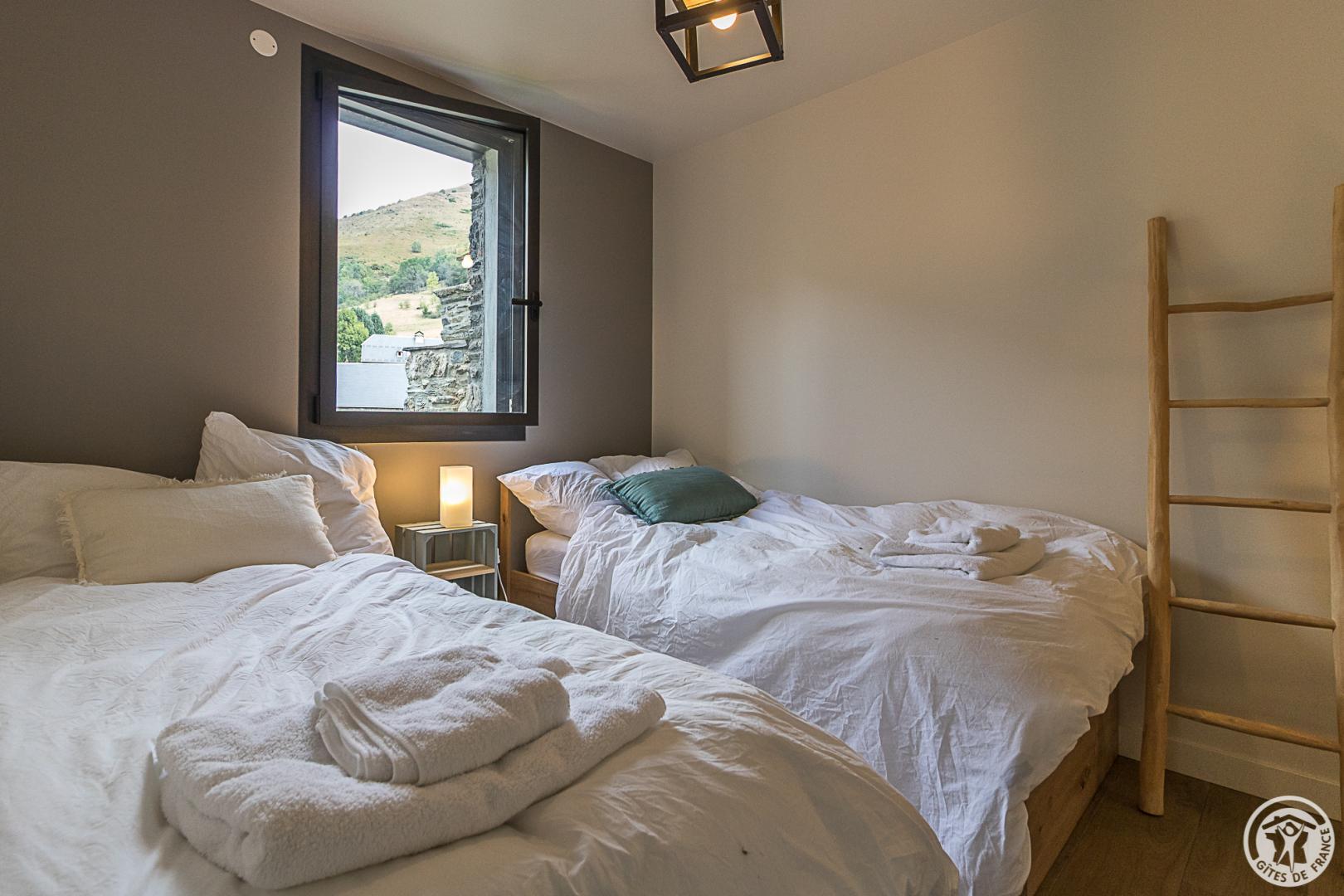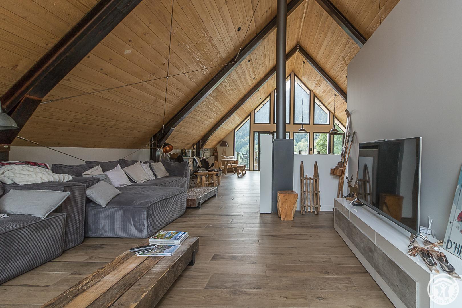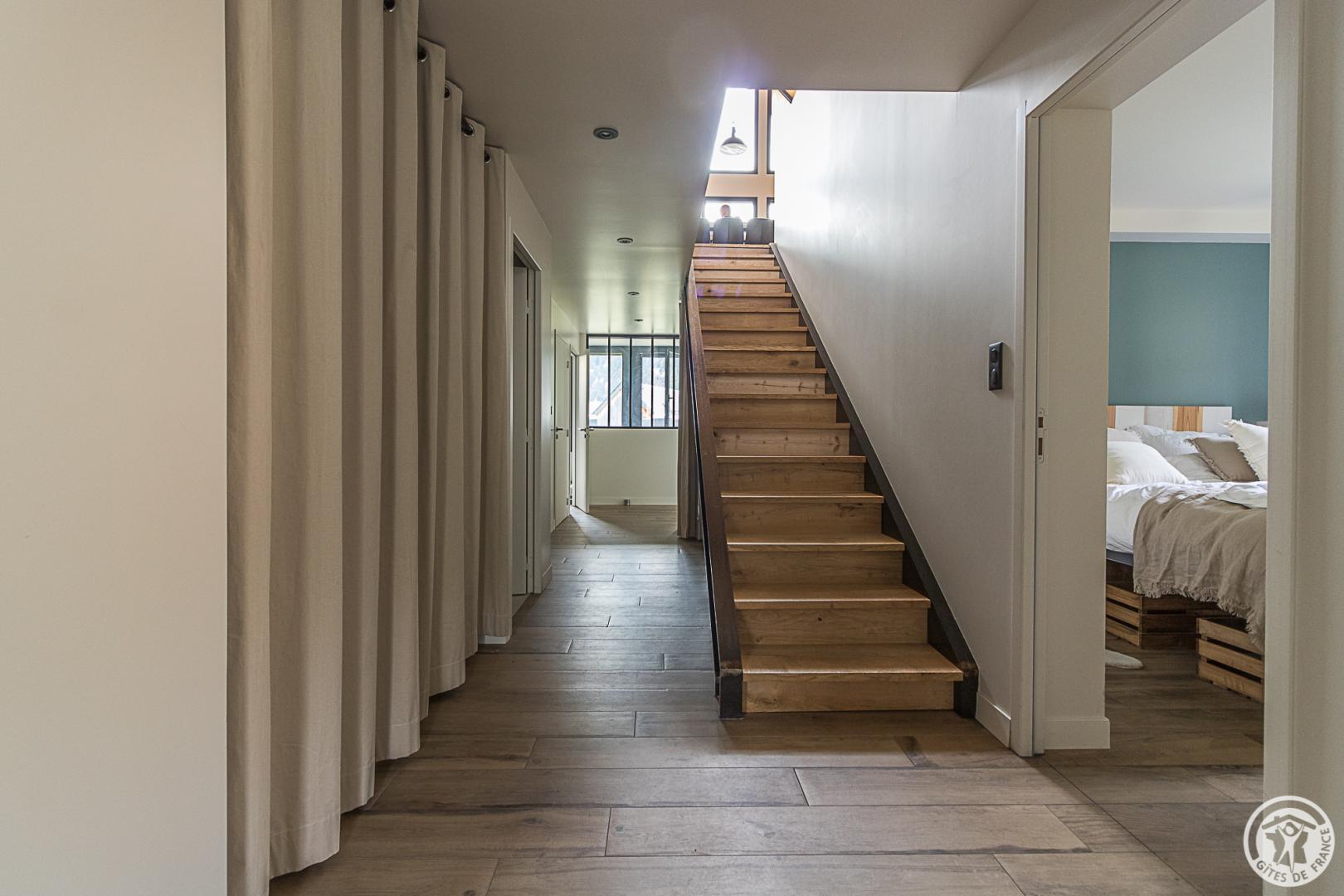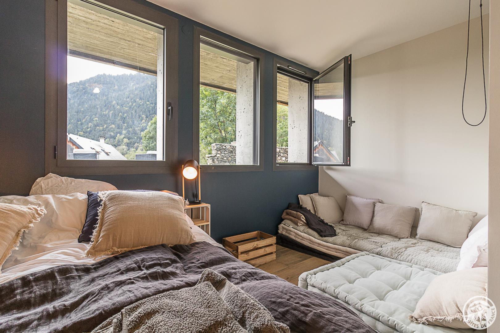 L’étage supérieur est occupé par les pièces de vie : entrée, WC indépendant, superbe pièce de séjour bénéficiant d’un très beau volume, lumineuse avec ses grandes baies vitrées donnant sur la vallée. Le salon accueille plusieurs espaces : le coin-TV, le coin-feu avec son poêle à bois, le coin-jeu (ou télétravail pour les plus studieux !). La cuisine ouvre sur la partie repas qui regarde les montagnes. Un escalier (sans rampe) dessert le niveau inférieur, également accessible depuis la rue (cour). Cet étage est dédié aux pièces de sommeil avec 6 chambres (2 chambres avec 2 lits pour 1 personnes en 90cmx200cm) (3 chambres avec 1 lit pour 2 personnes en 160cmx200cm) (1 chambre avec 1 lit pour 2 personnes en 160x190cm et un coin-détente), une salle de bains avec baignoire et douche, une salle d’eau avec douche, un WC indépendant et un coin-buanderie sous l’escalier. Chauffage au sol par pompe à chaleur. Connexion Internet WIFI et filaire.
