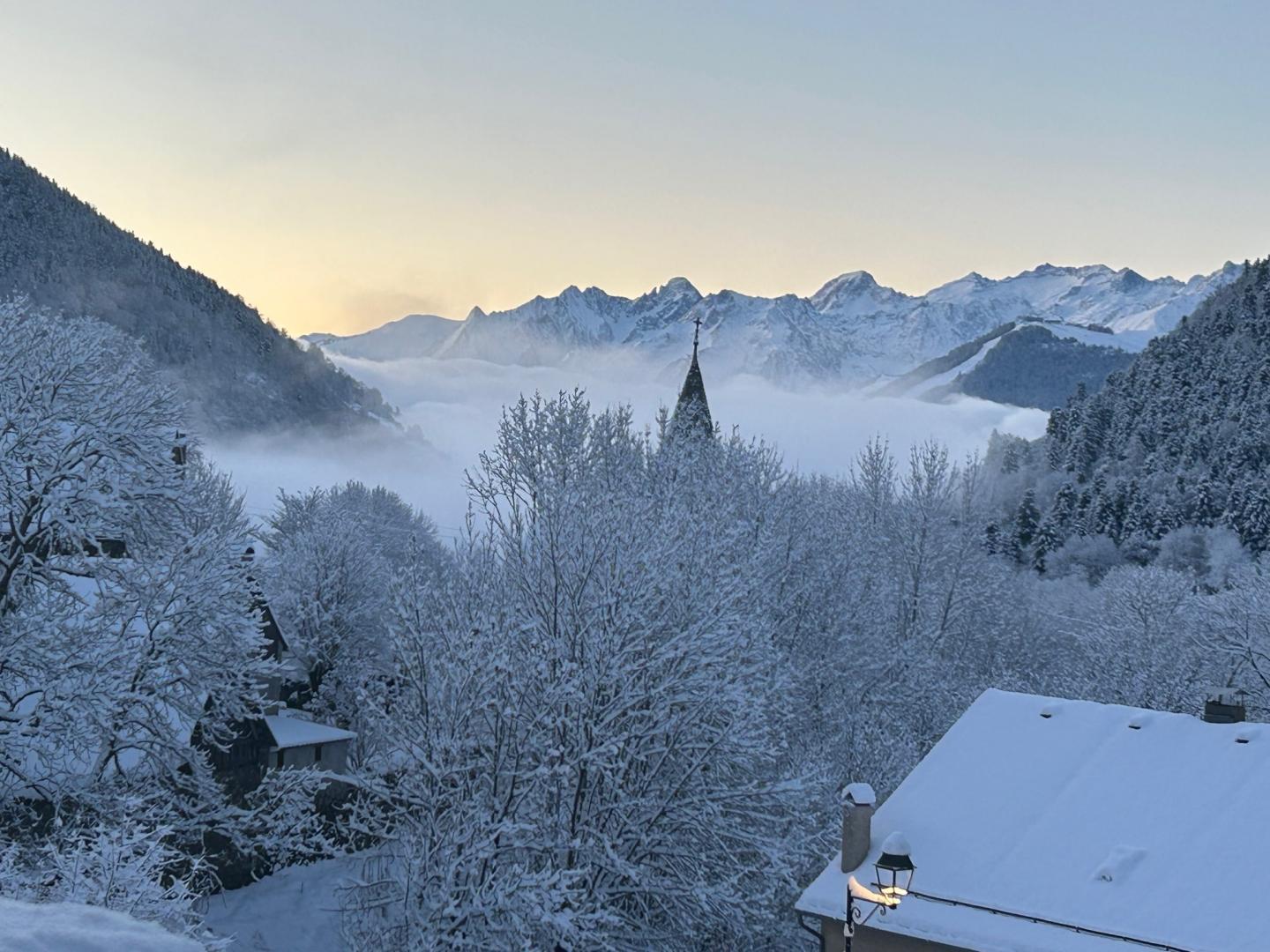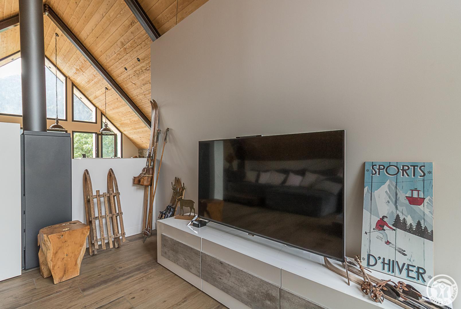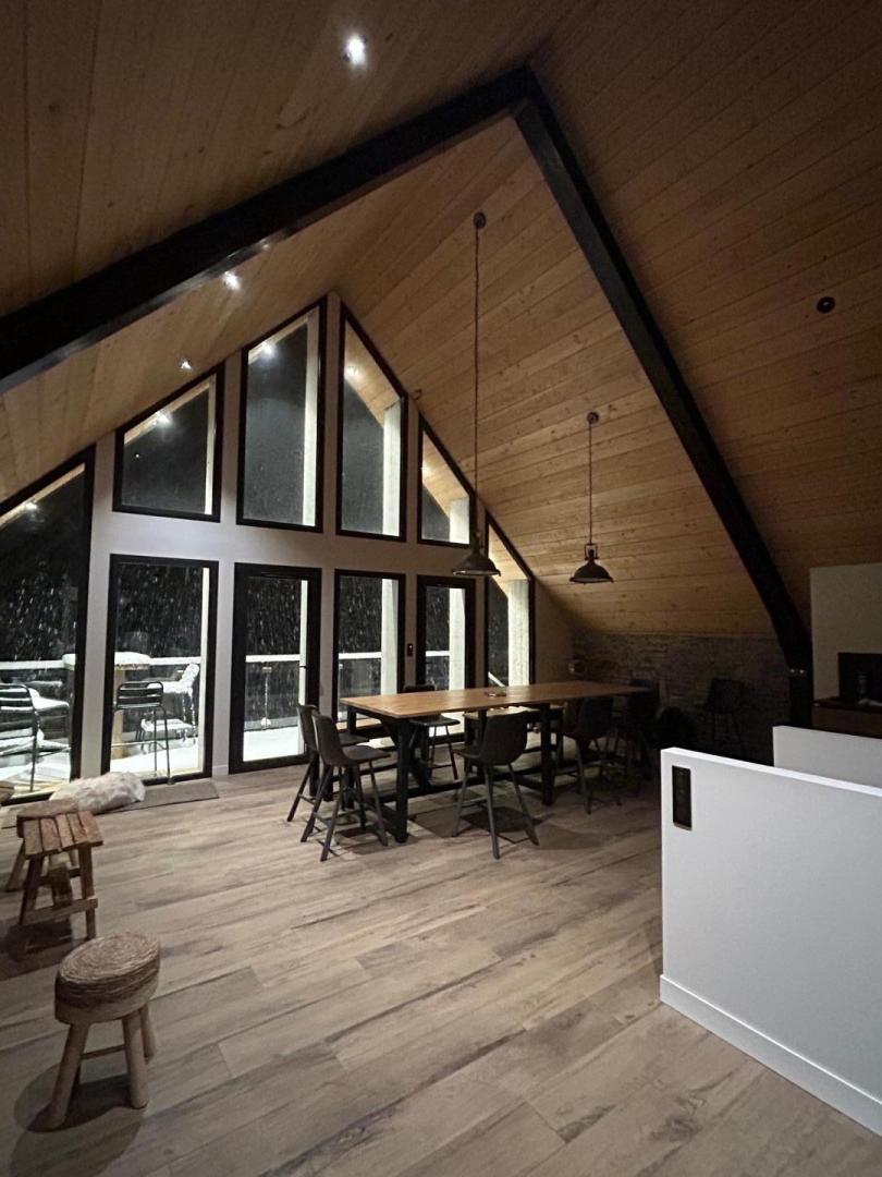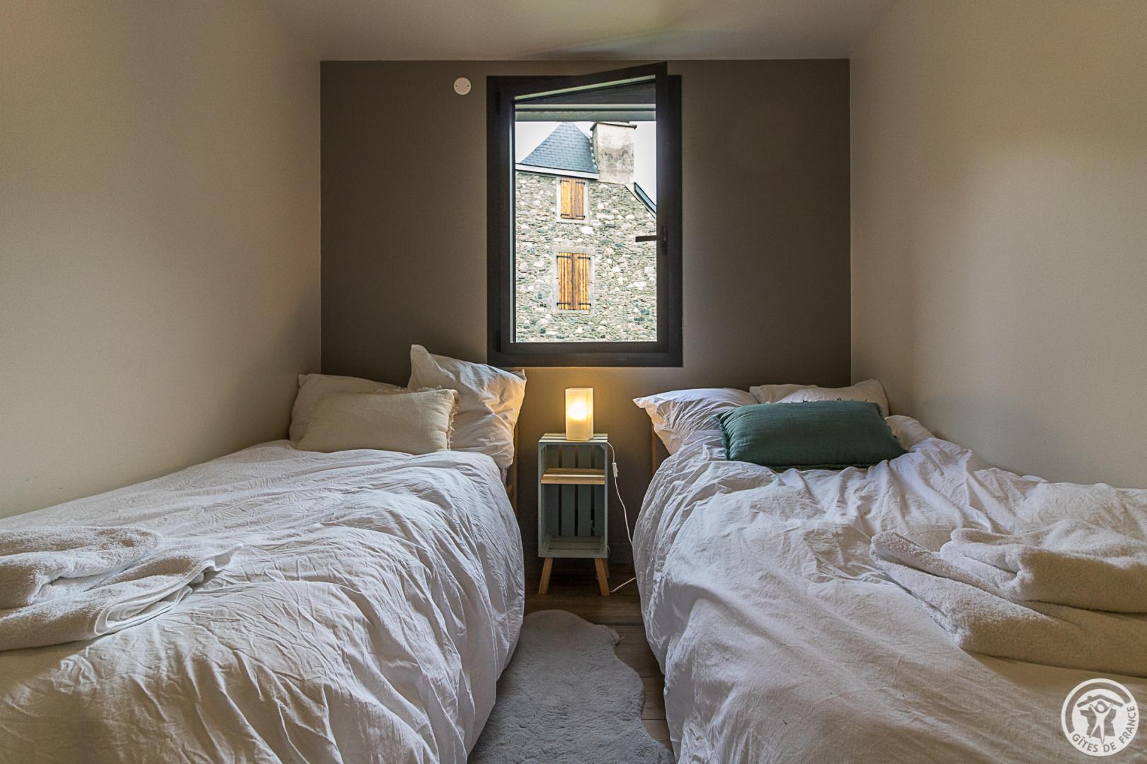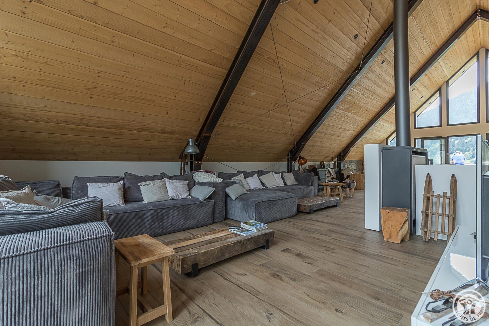 L’étage supérieur est occupé par les pièces de vie : entrée, WC indépendant, superbe pièce de séjour bénéficiant d’un très beau volume, lumineuse avec ses grandes baies vitrées donnant sur la vallée. Le salon accueille plusieurs espaces : le coin-TV, le coin-feu avec son poêle à bois, le coin-jeu (ou télétravail pour les plus studieux !). La cuisine ouvre sur la partie repas qui regarde les montagnes. Un escalier (sans rampe) dessert le niveau inférieur, également accessible depuis la rue (cour). Cet étage est dédié aux pièces de sommeil avec 6 chambres (2 chambres avec 2 lits pour 1 personnes en 90cmx200cm) (3 chambres avec 1 lit pour 2 personnes en 160cmx200cm) (1 chambre avec 1 lit pour 2 personnes en 160x190cm et un coin-détente), une salle de bains avec baignoire et douche, une salle d’eau avec douche, un WC indépendant et un coin-buanderie sous l’escalier. Chauffage au sol par pompe à chaleur. Connexion Internet WIFI et filaire.