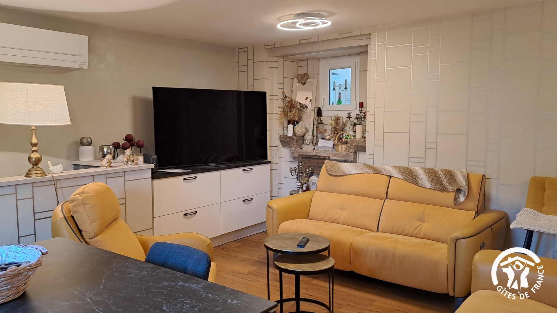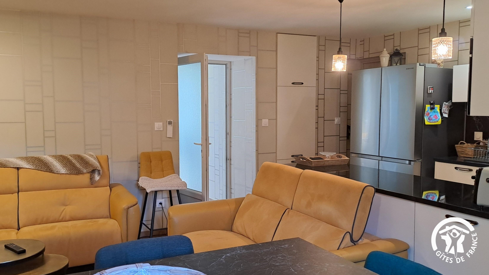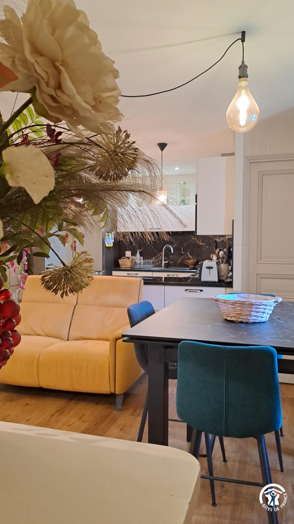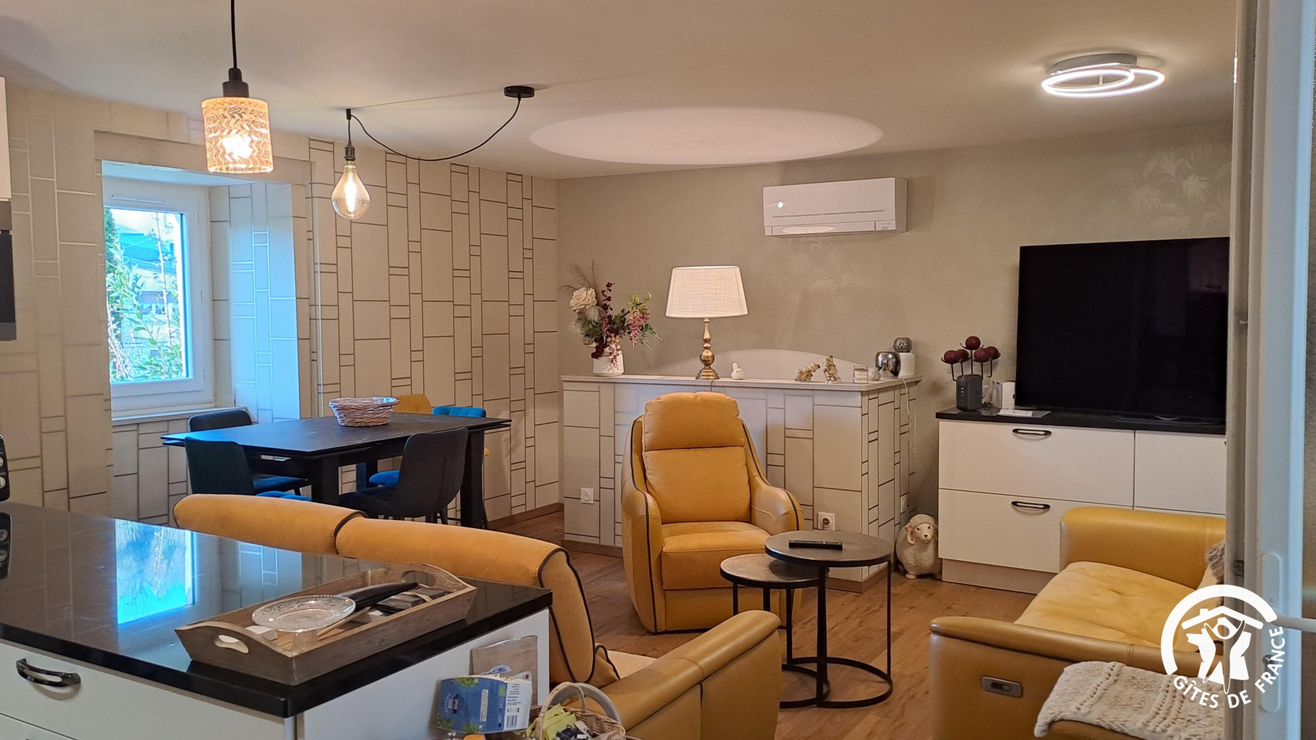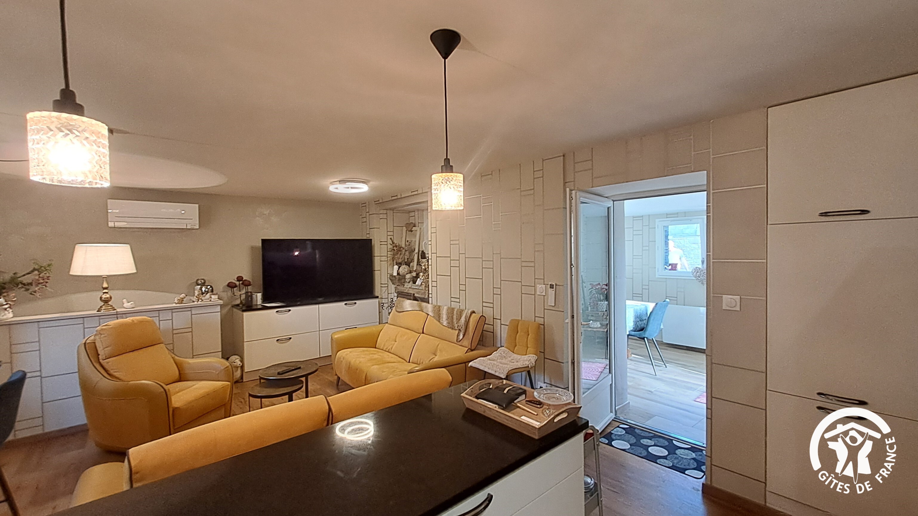 – cuisine/salon avec cuisine ouverte toute équipée, salon avec grande TV connectée, Netflix